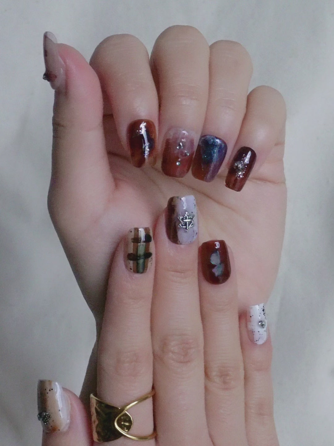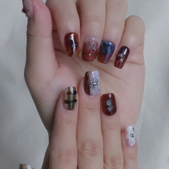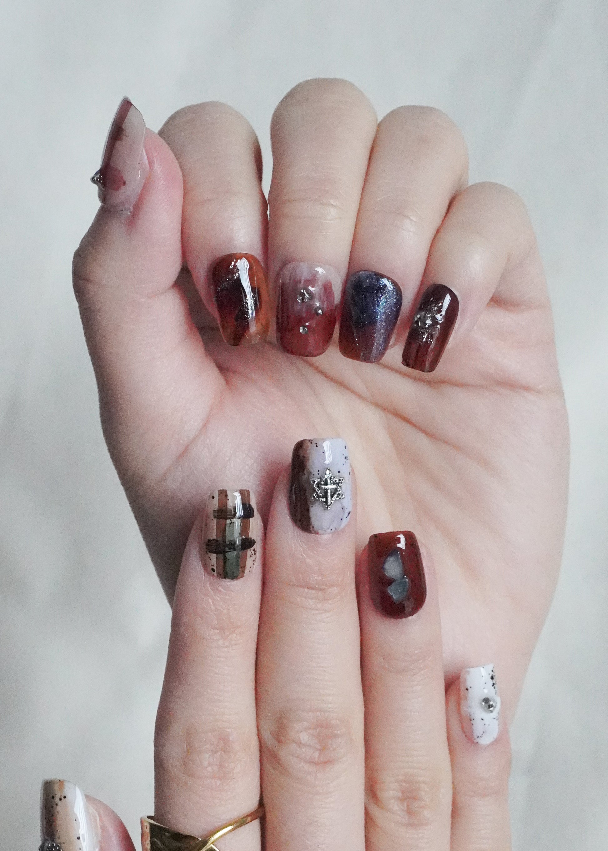 After Dusk Press On Nail Set blends deep burgundy, inky blue, and smoky neutrals with layered textures and abstract detailing. Each nail carries a different finish, from subtle shimmer to hand-painted graphics and metallic accents.