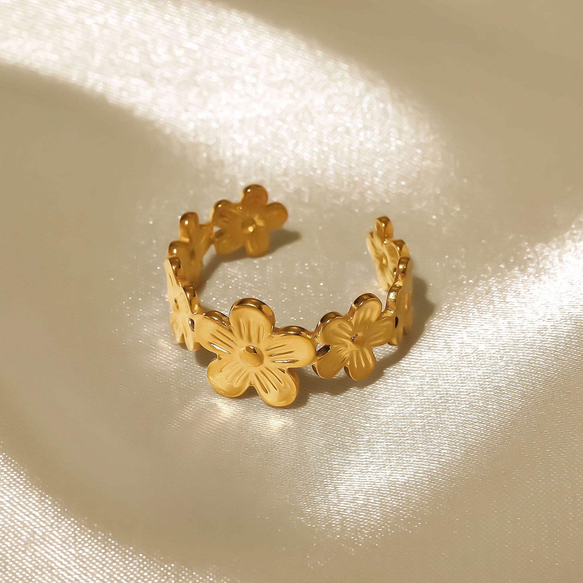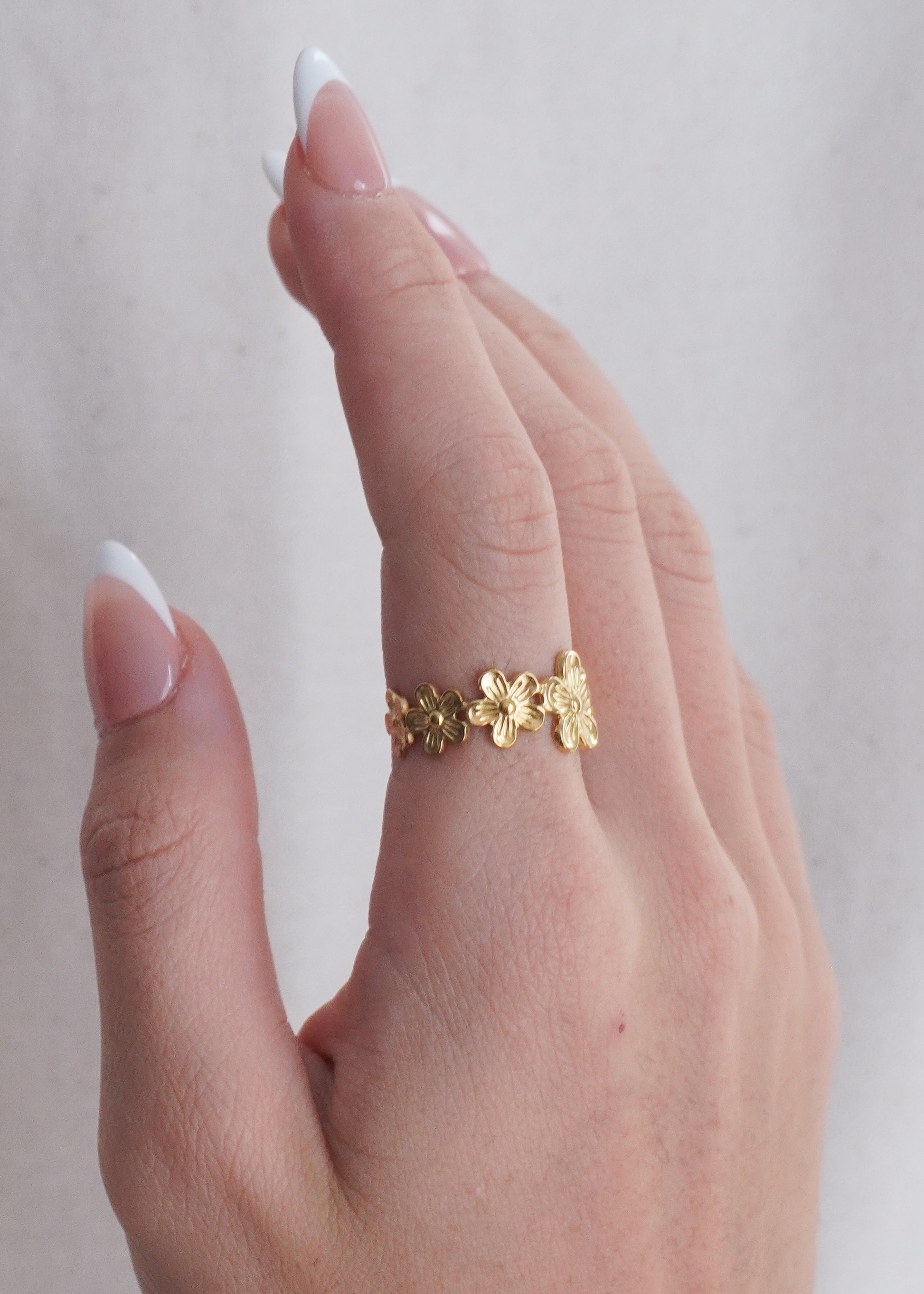Bloom Band Ring is adorned with a continuous row of golden flowers, bringing a touch of nature’s elegance to your everyday style. Lightweight and feminine, it’s perfect to wear alone for a delicate statement or stacked with other rings for a layered look.