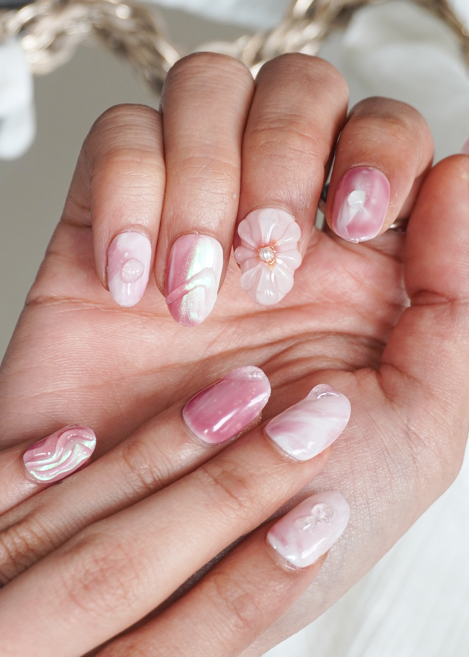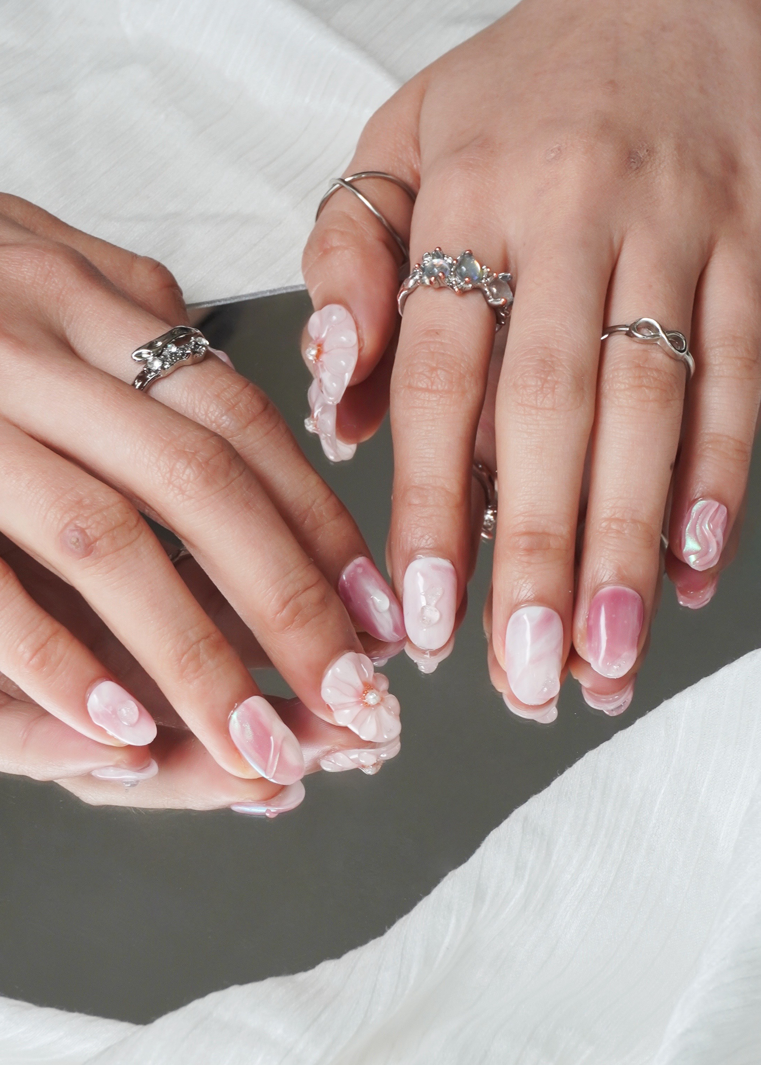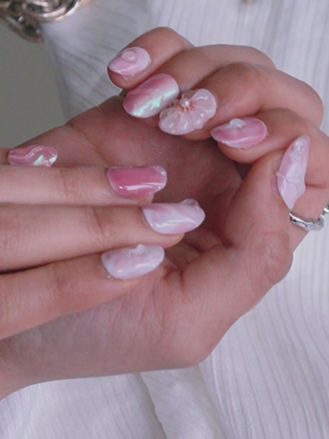 Blossom Bliss Press On Nail Set has delicate 3D floral details with pearl and gem decorations, a glossy shine, and subtle marble patterns. Combining pink tones and iridescent finishes, creating a delicate, feminine look.