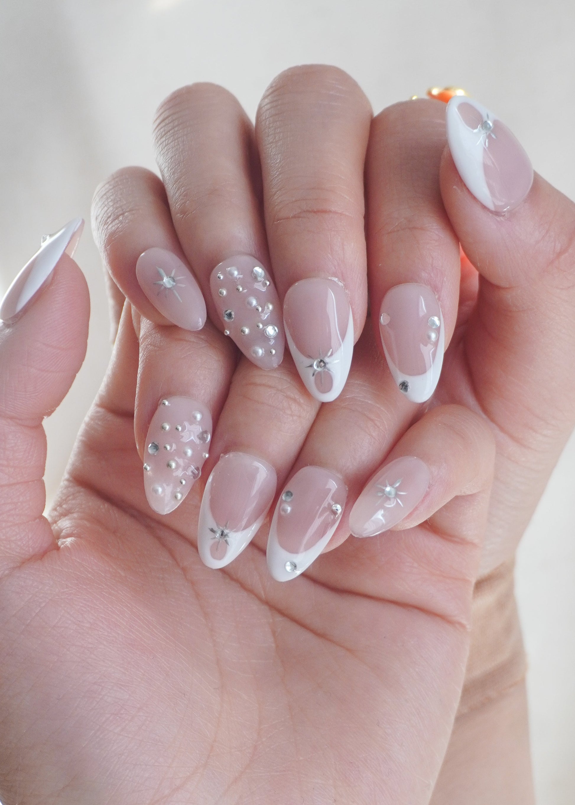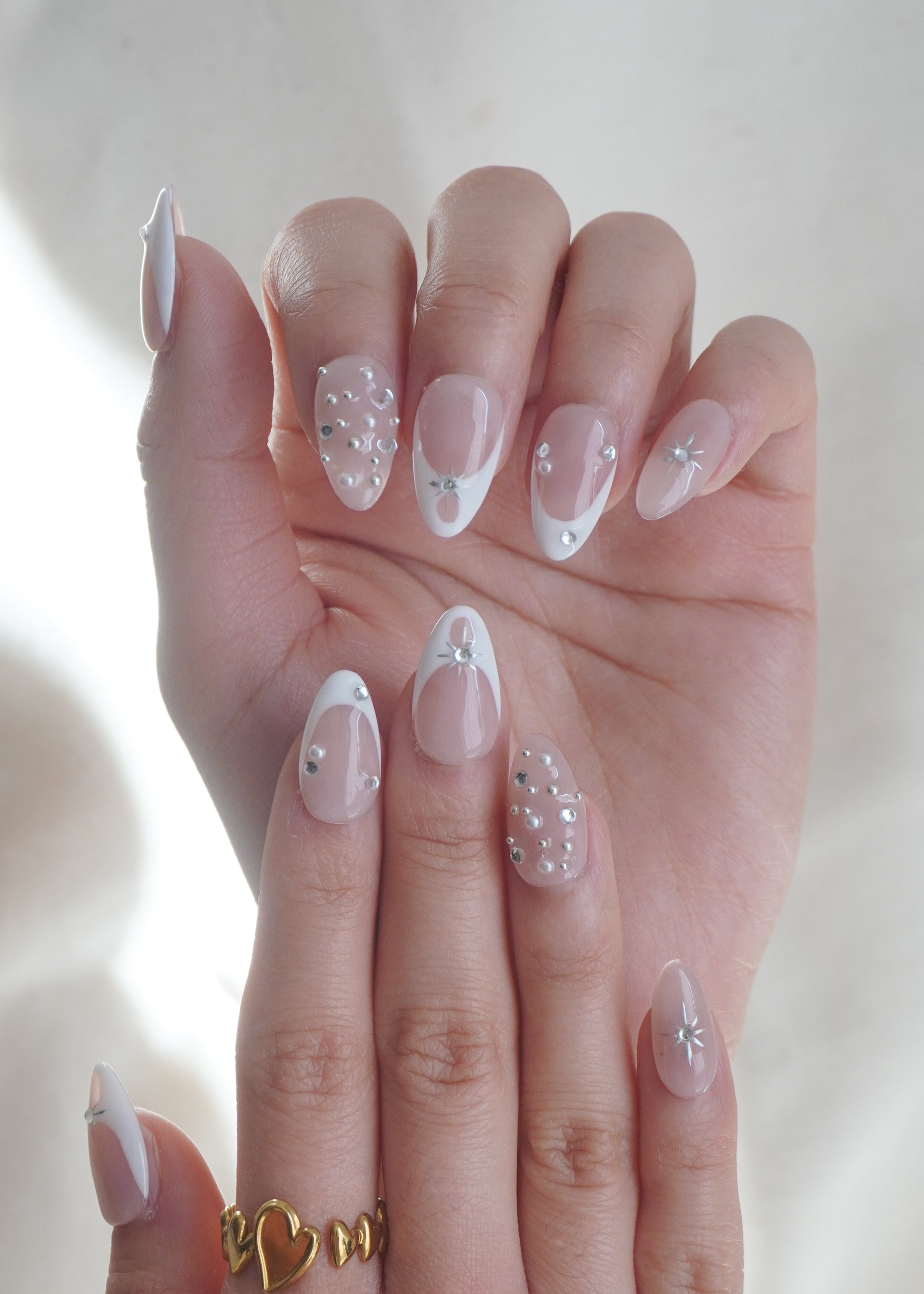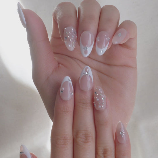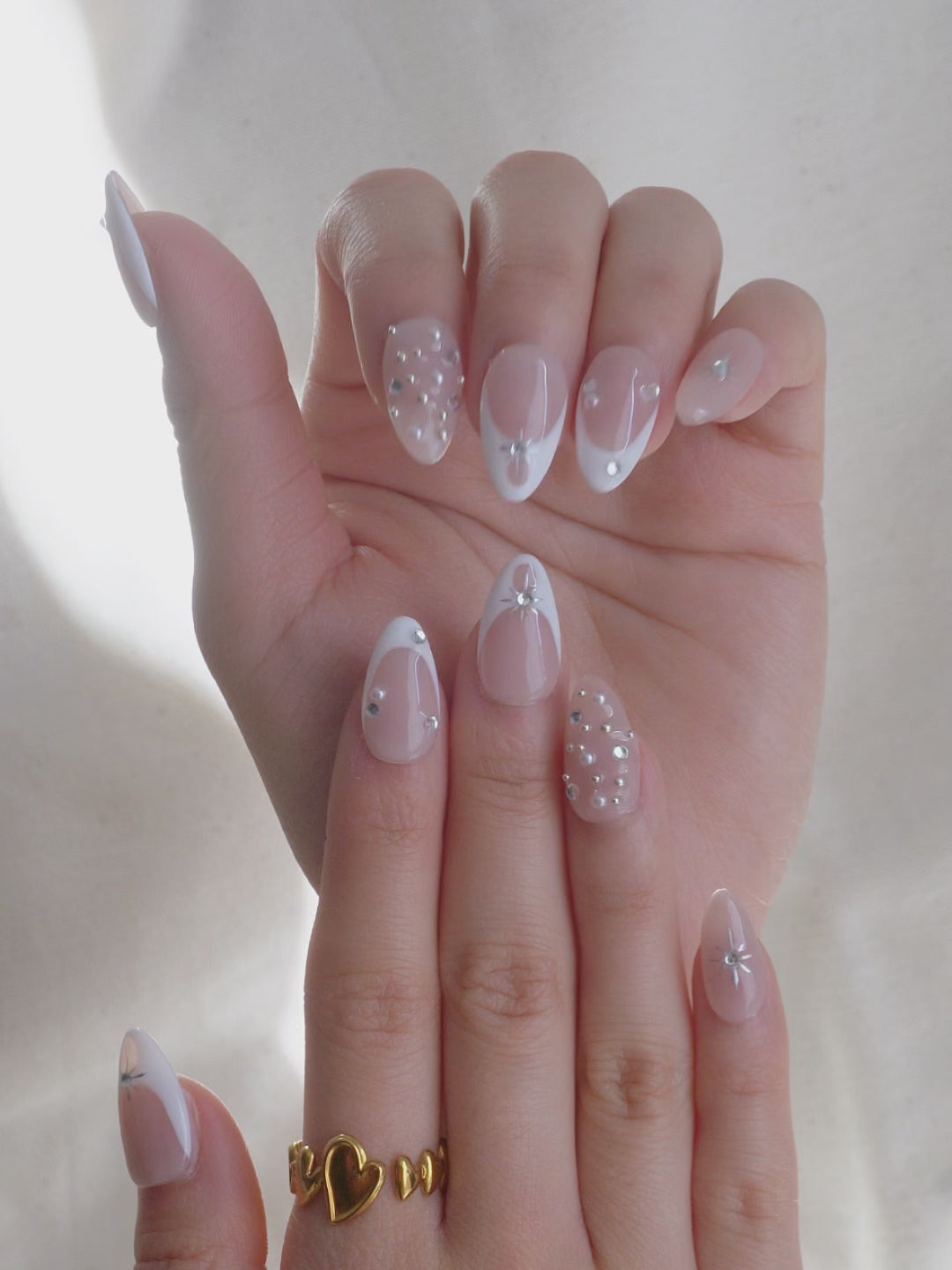 Celestial Veil Press On Nail Set features a soft nude base with delicate white French accents, adorned with shimmering crystals, pearls, and subtle starburst details. Inspired by starlit skies and bridal elegance, this design captures a luminous, ethereal glow perfect for special moments.