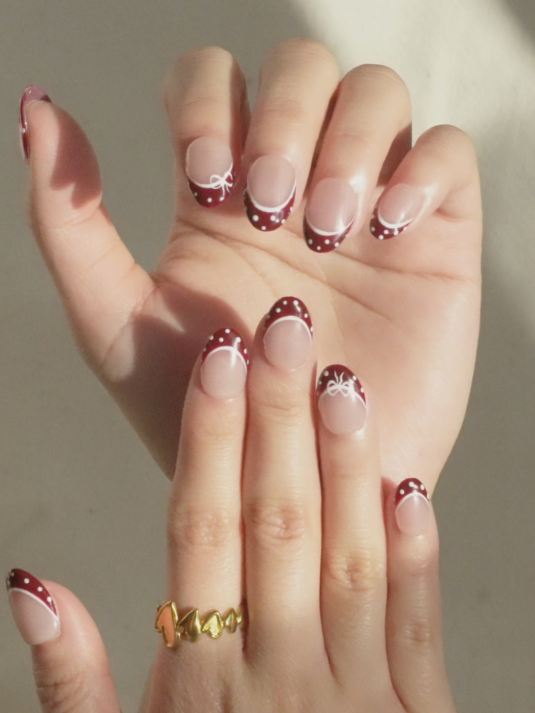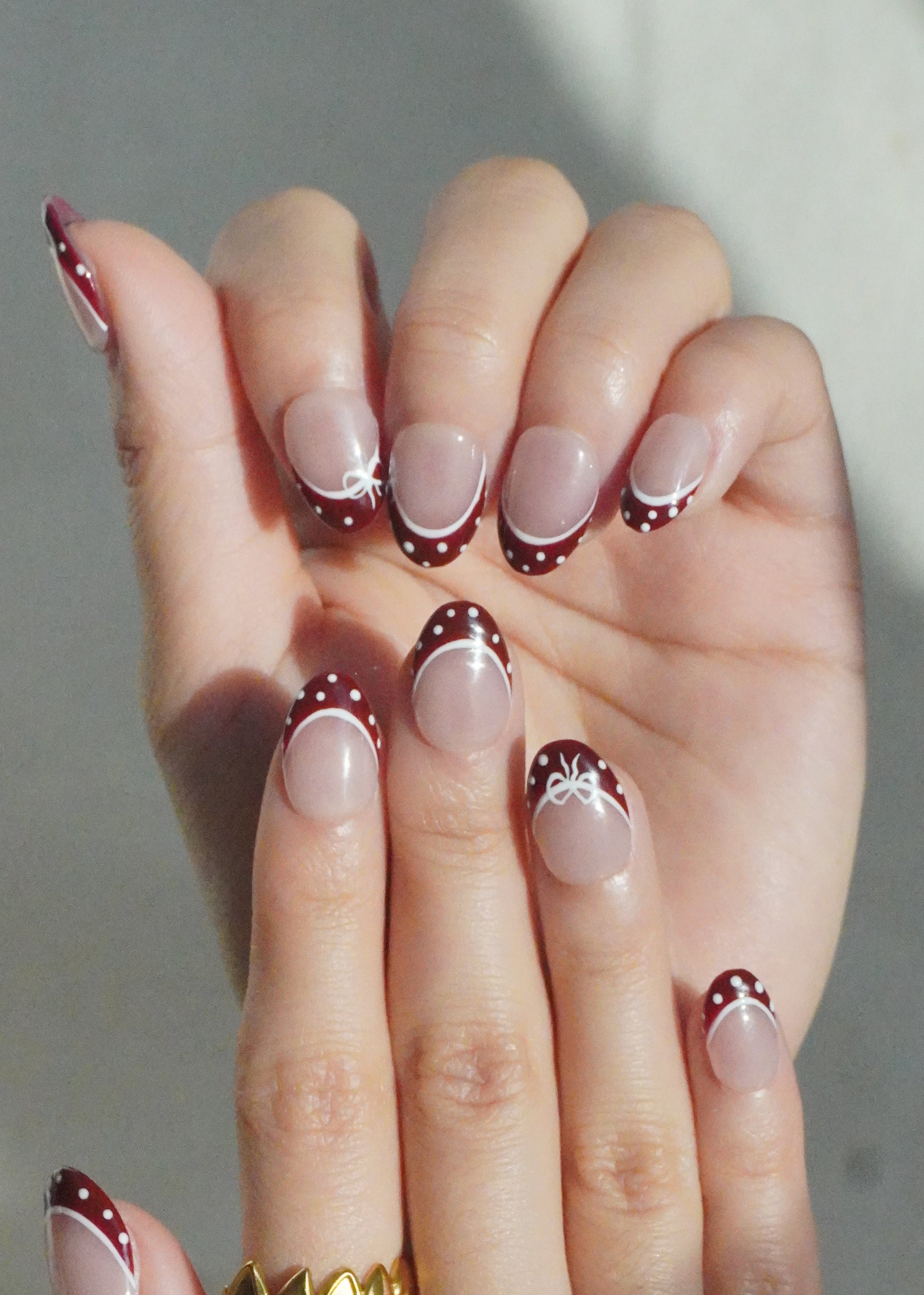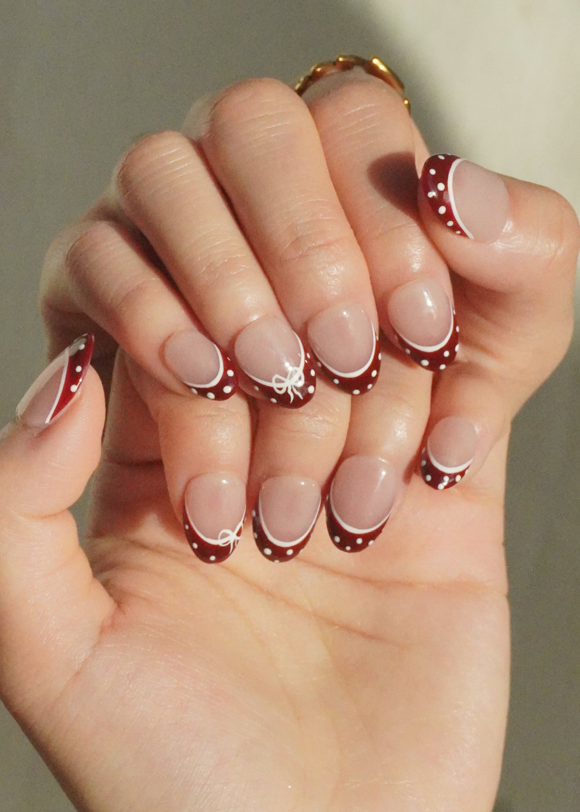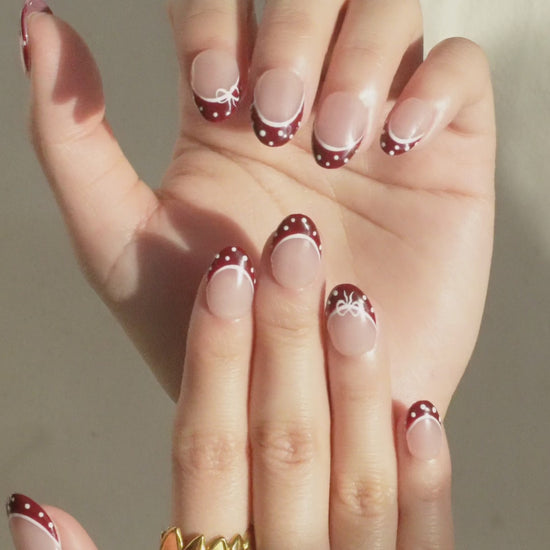 Christmas Frenchie Press On Nail Set gives a festive twist to the classic French tip. Deep red tips are lined with a crisp white curve, finished with tiny polka dots and delicate hand-painted bows for a soft holiday touch. The design is cute, clean, and easy to wear , perfect for anyone who wants something festive without going too bold.