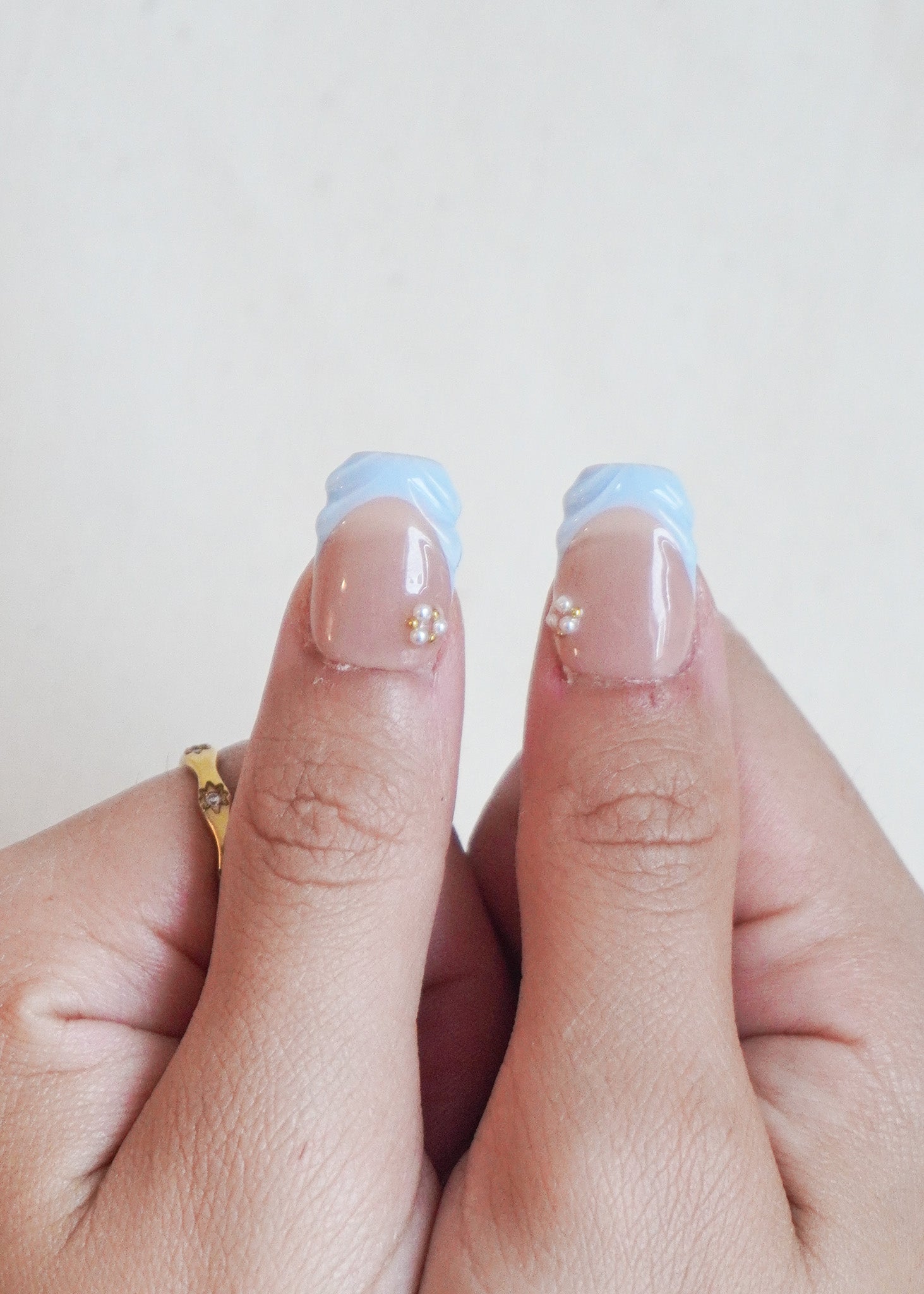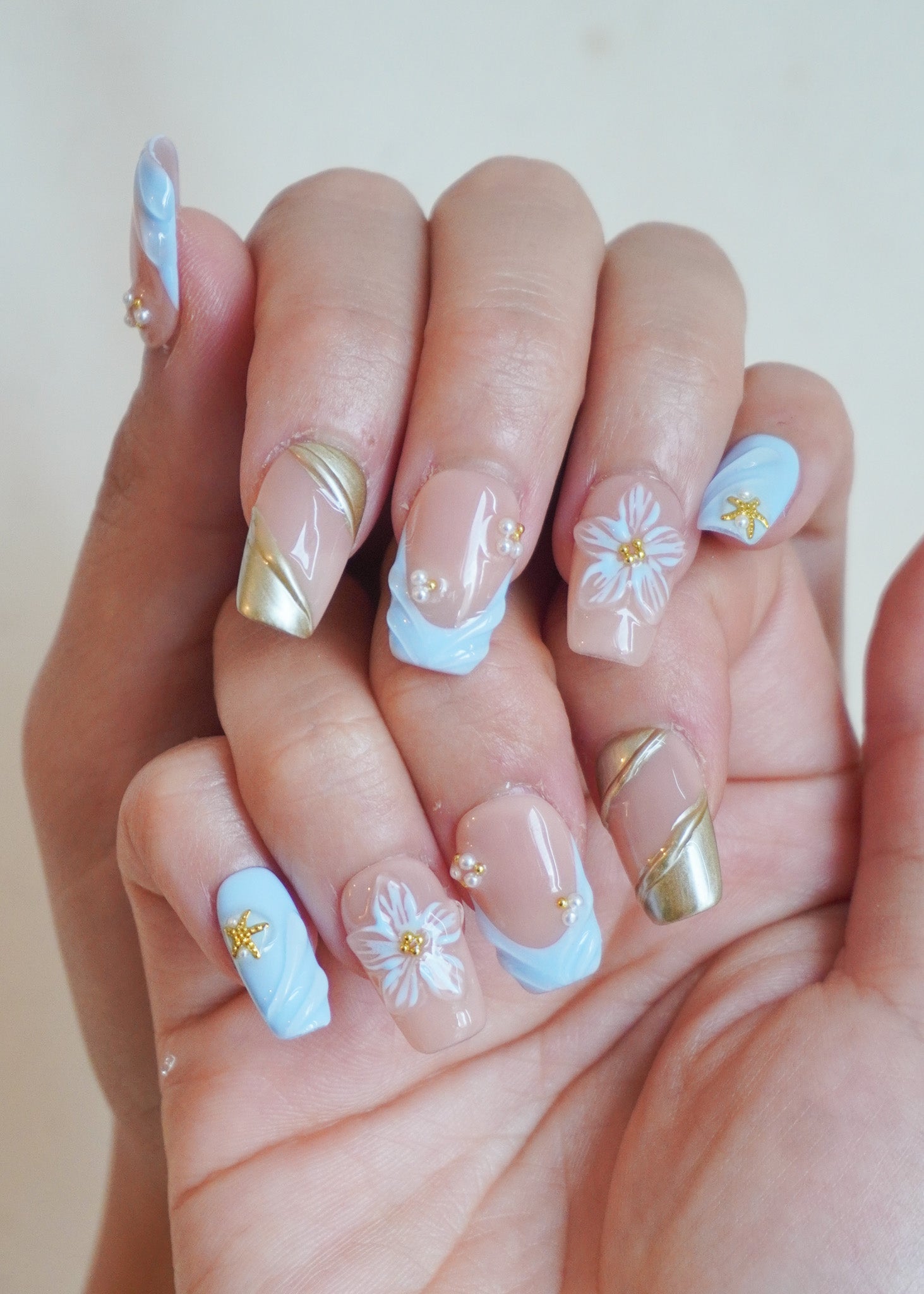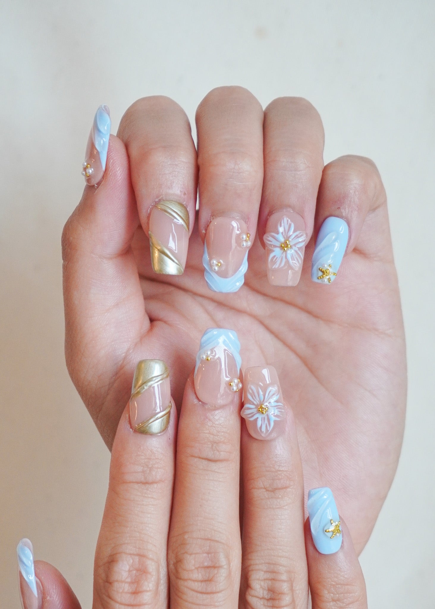 Coastal Luxe Press-On Nail Set brings vacation glamour to life — where ocean waves meet golden glow. This radiant statement set features pastel blue swirl textures, metallic gold ribbons, 3D floral designs, pearls, and a touch of sparkle.