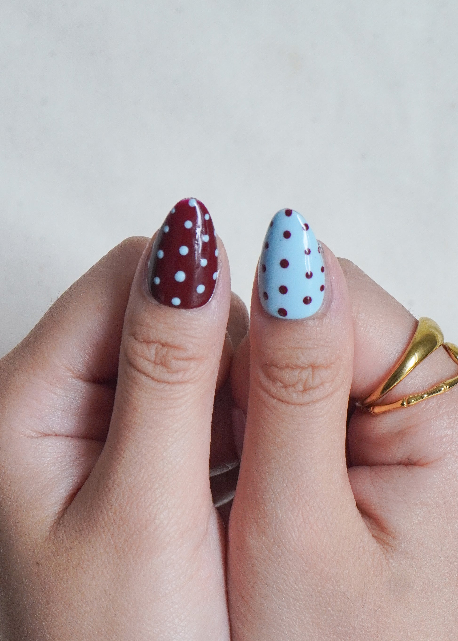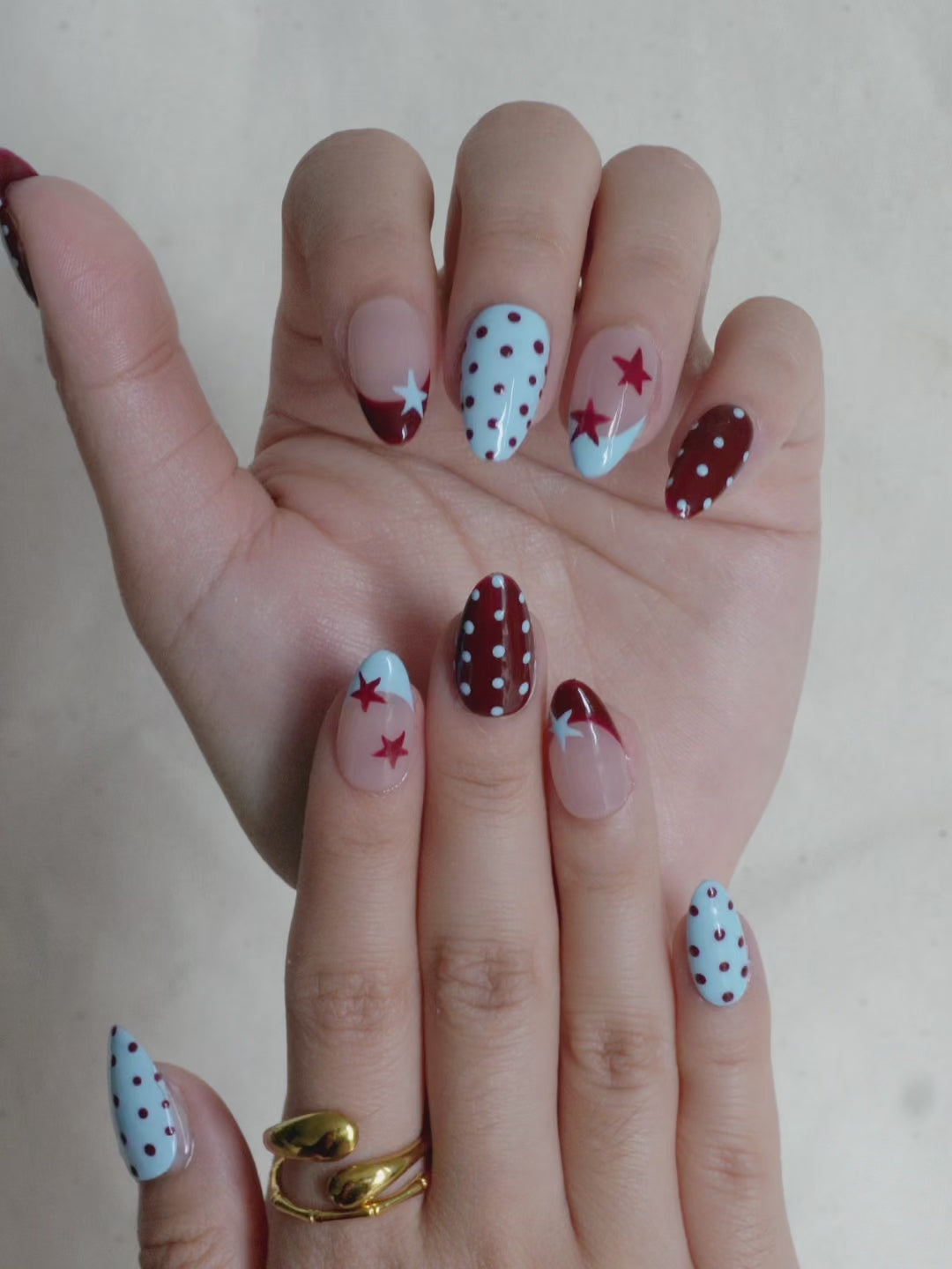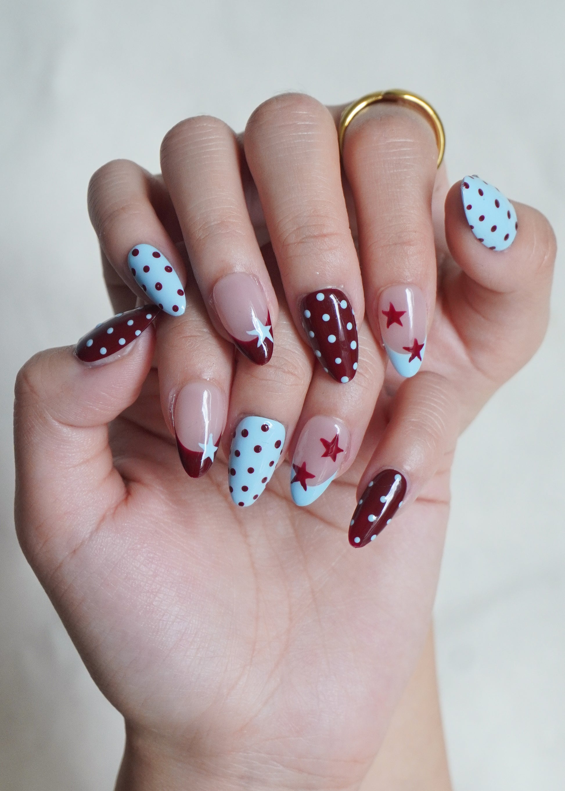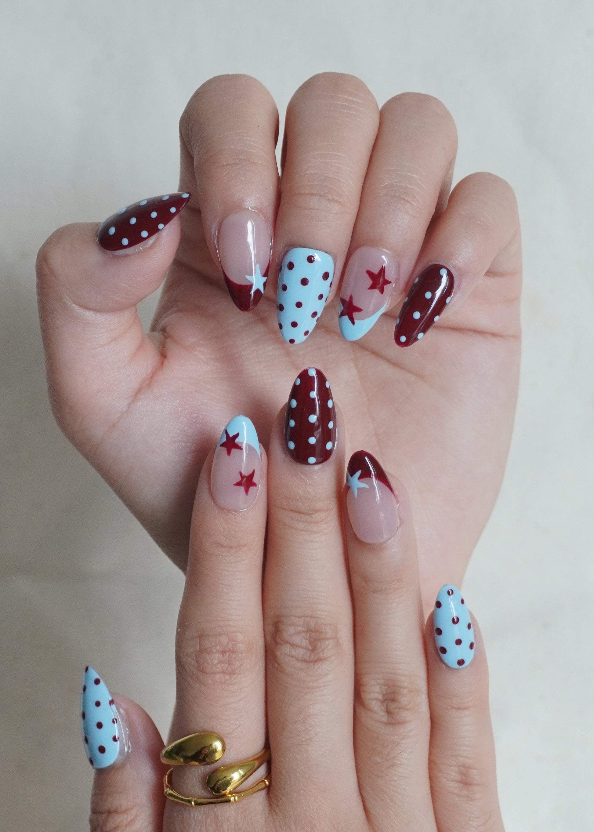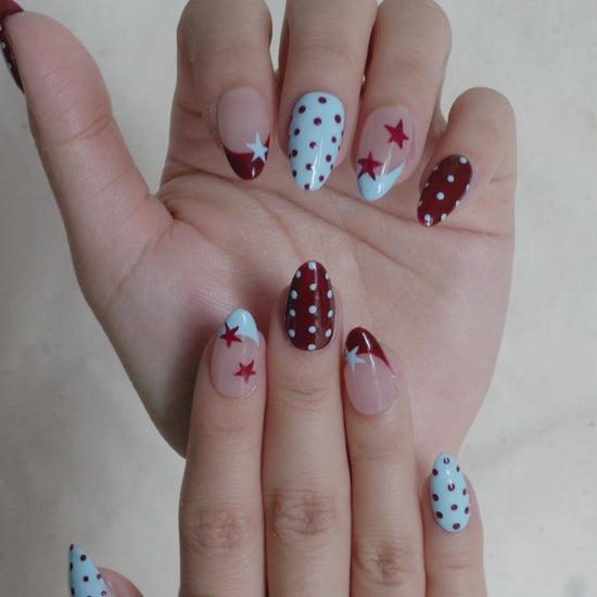 Cosmic Pop Press On Nail Set brings a retro twist to autumn with its sky-blue and wine-red combo, decorated with playful stars and dotted patterns. The design strikes the perfect balance between bold expression and everyday charm, a mood booster for any outfit.