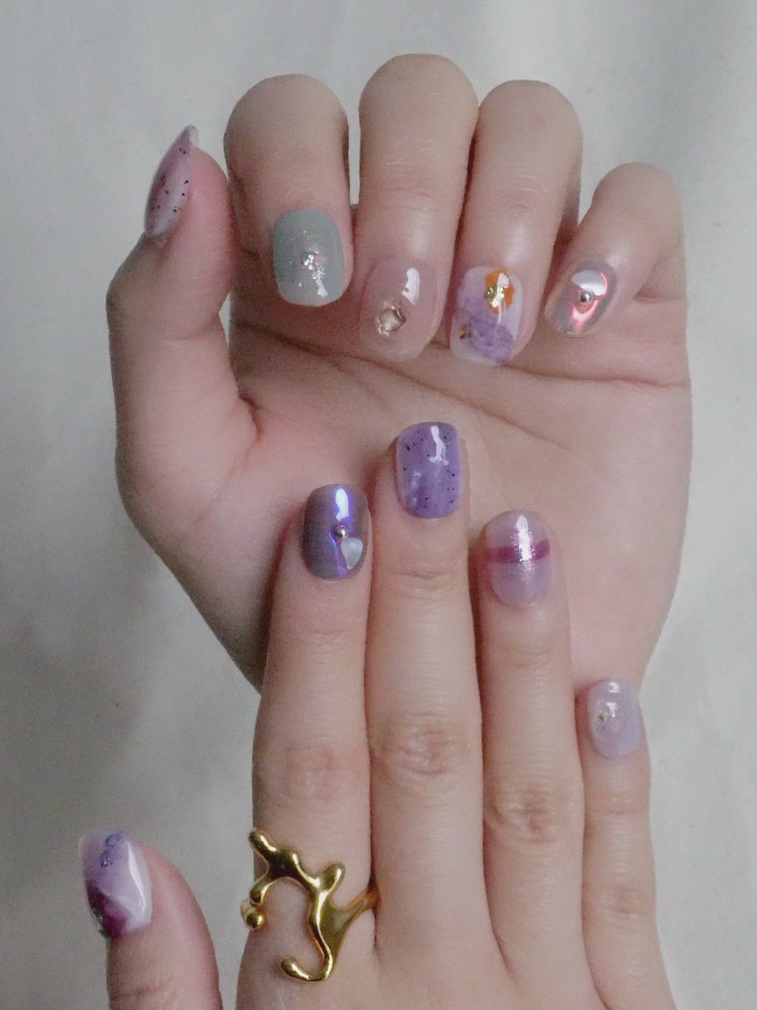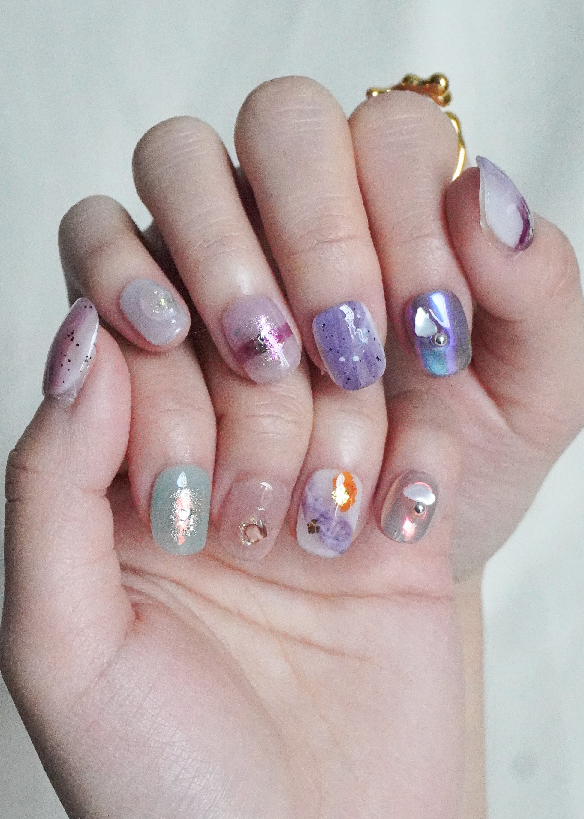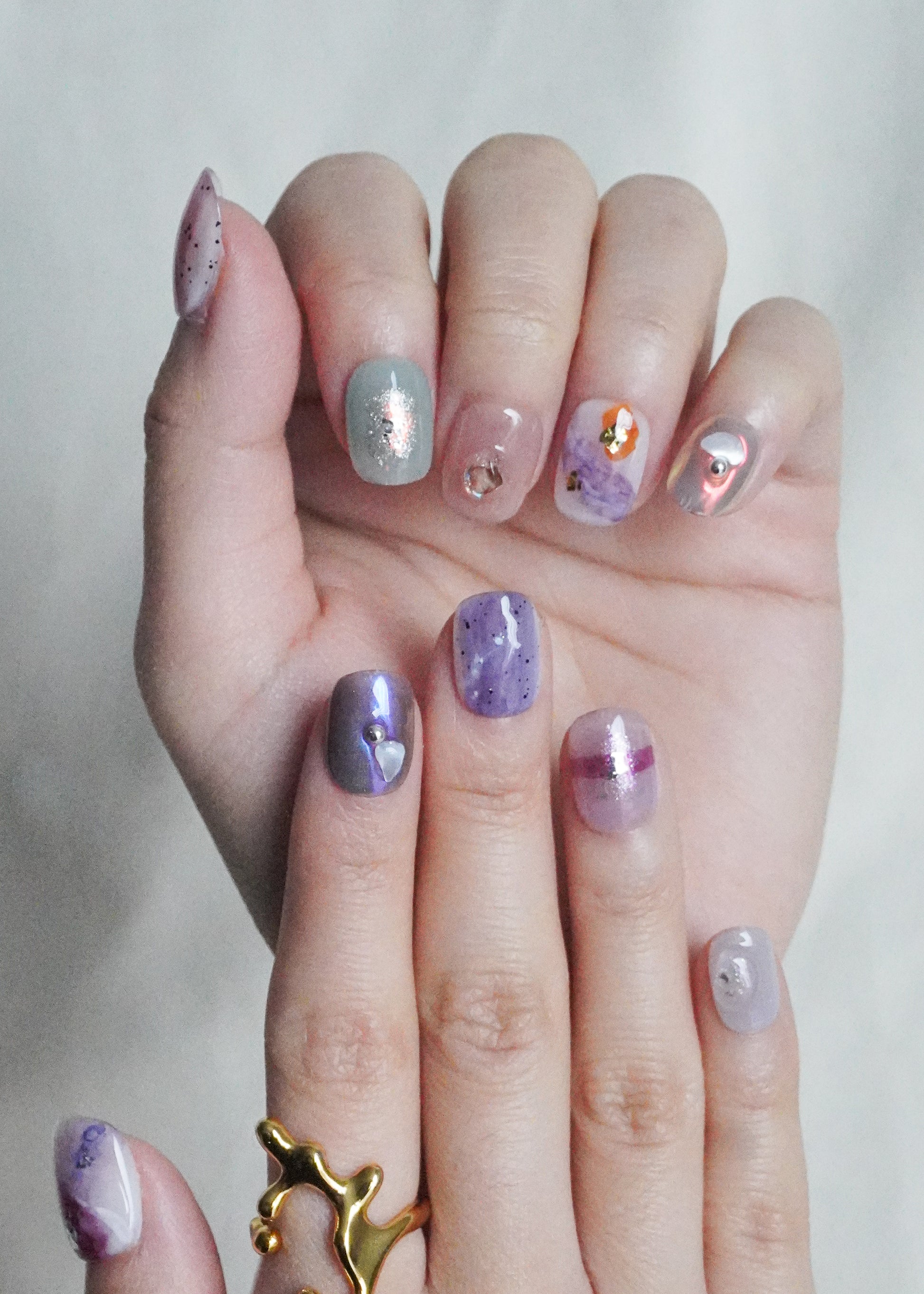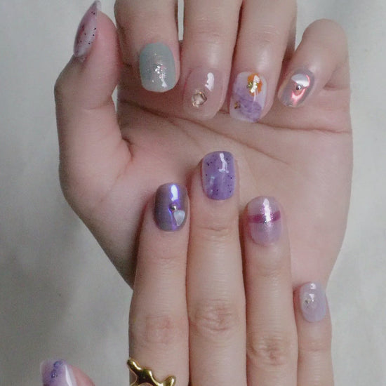 Daydream Mix Press On Nail Set blends soft lilac, muted green, and translucent tones with layered textures and scattered accents. Each nail features a different detail, from subtle shimmer to embedded elements and metallic touches.