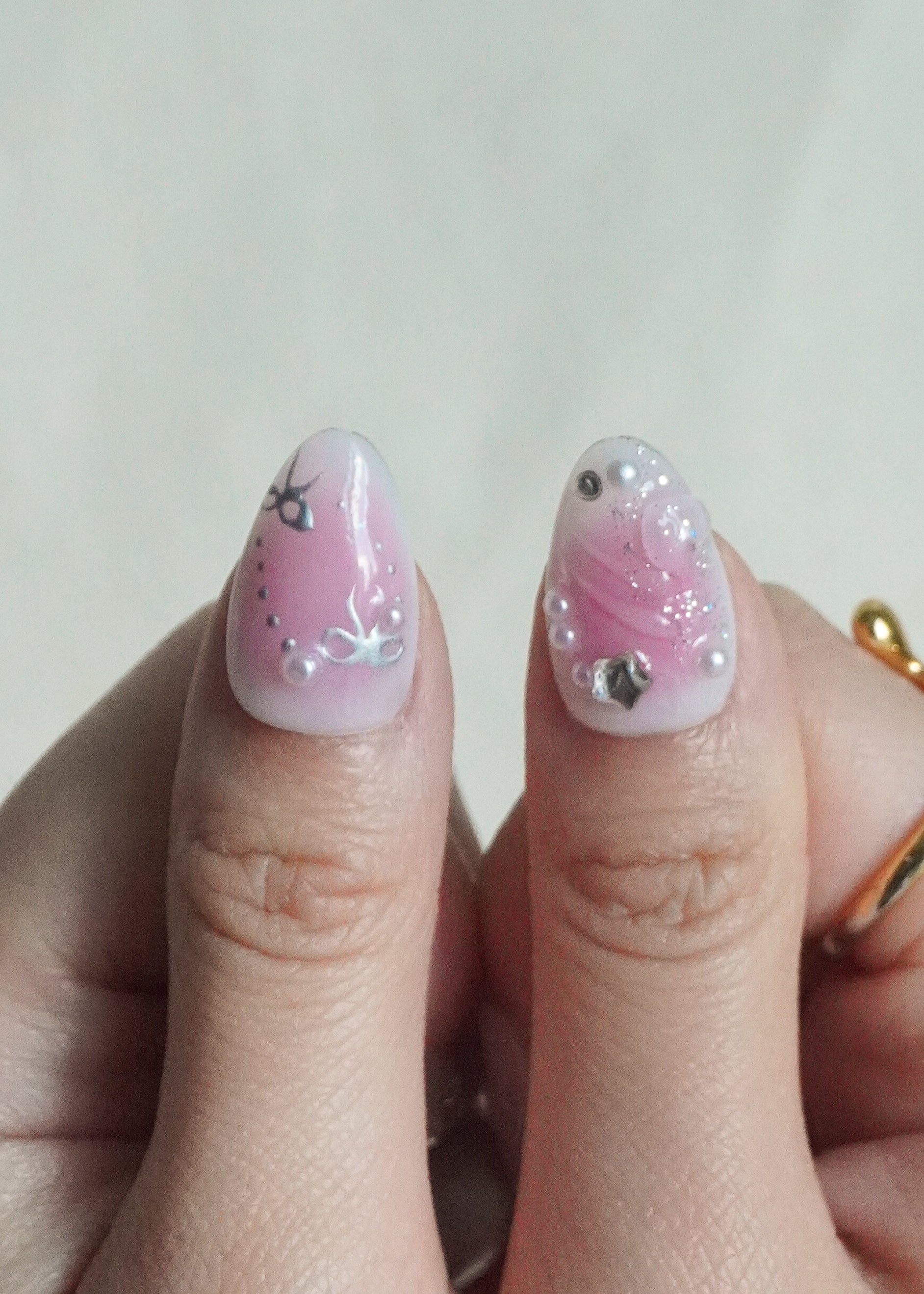 The nails are incredible beautiful and exactly like the image, they are very sturdy and the details and accessories on the nails are very strong and not cheap! The design on the nails are super cute <3