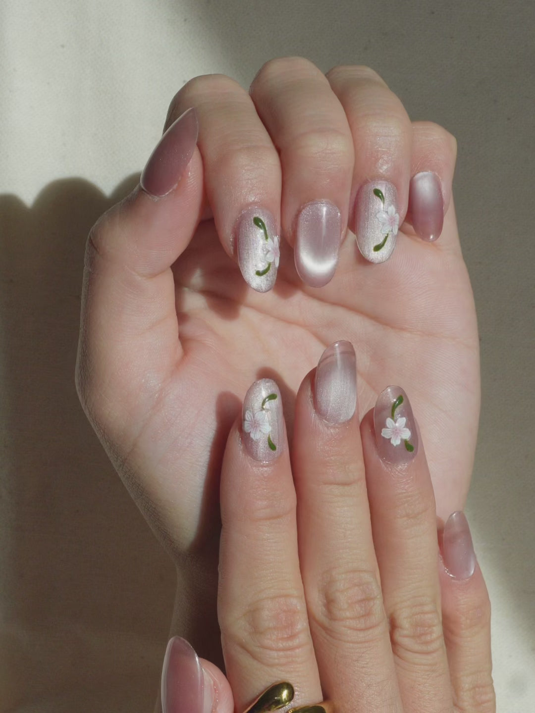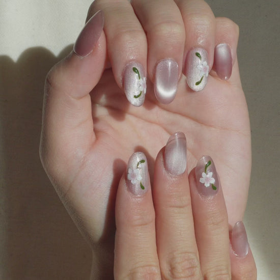 Floral Mist Press On Nail Set features a soft shimmer base paired with hand-painted floral accents. The pearly tones catch the light beautifully, while delicate white blossoms add a fresh, romantic touch.
