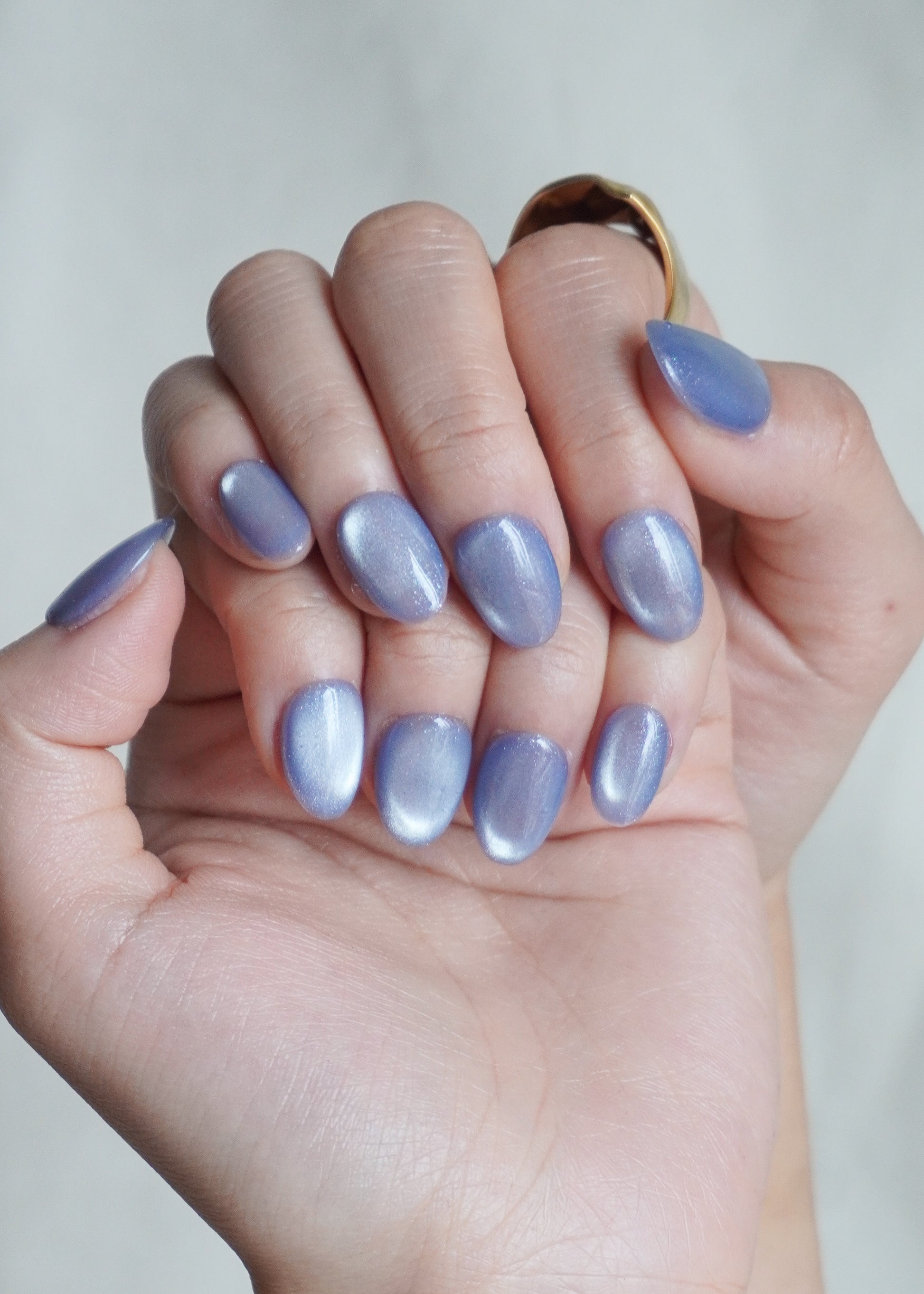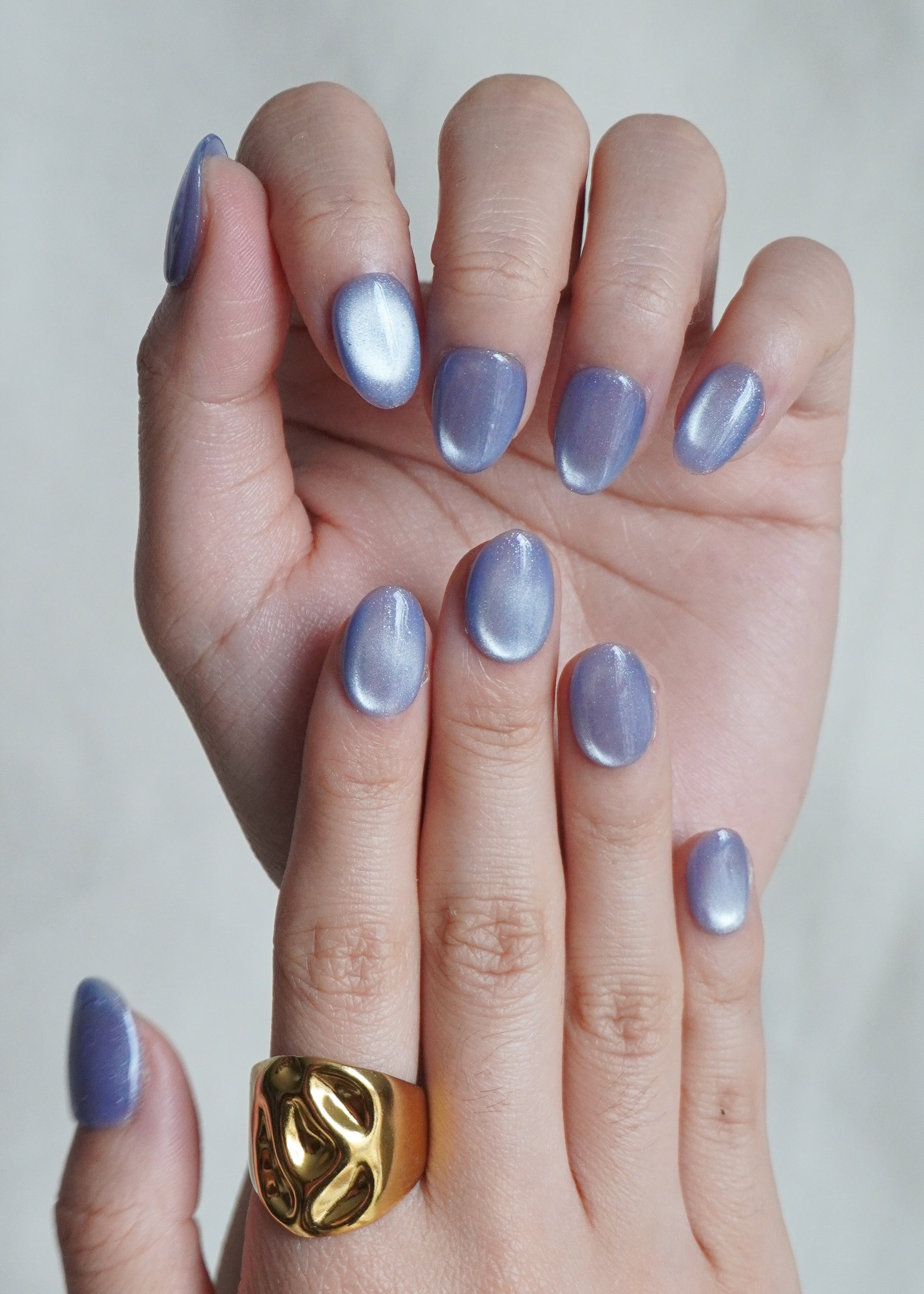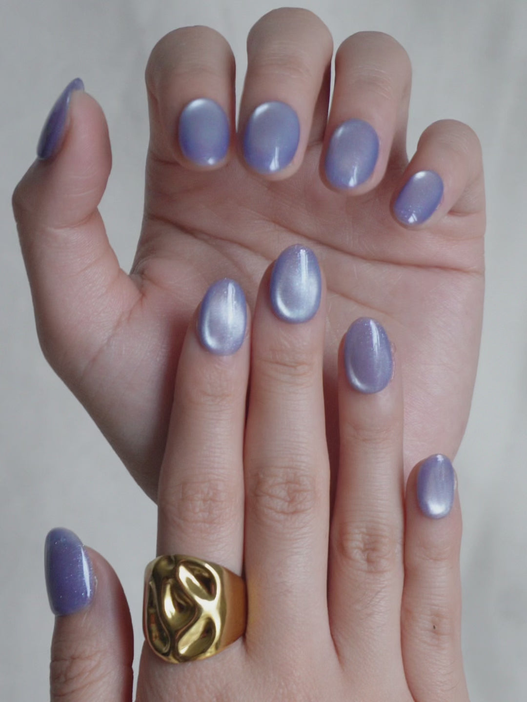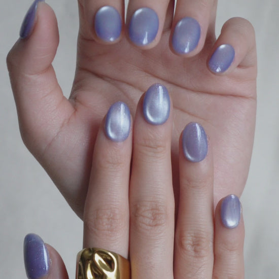 Frost Beam Press On Nail Set features a cool lavender-blue base with a smooth pearly shine that shifts gently under the light. The soft, frosted glow adds a calm, dreamy finish without feeling too bright, making it easy to pair with everyday looks.