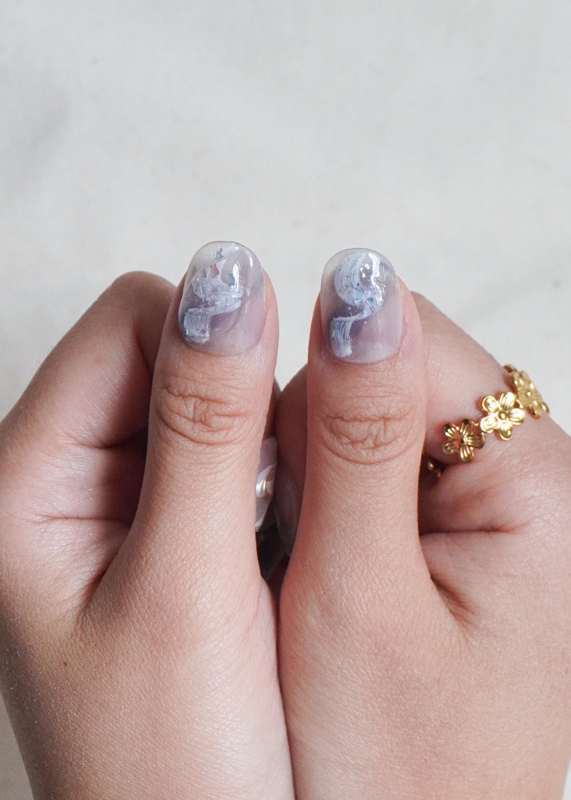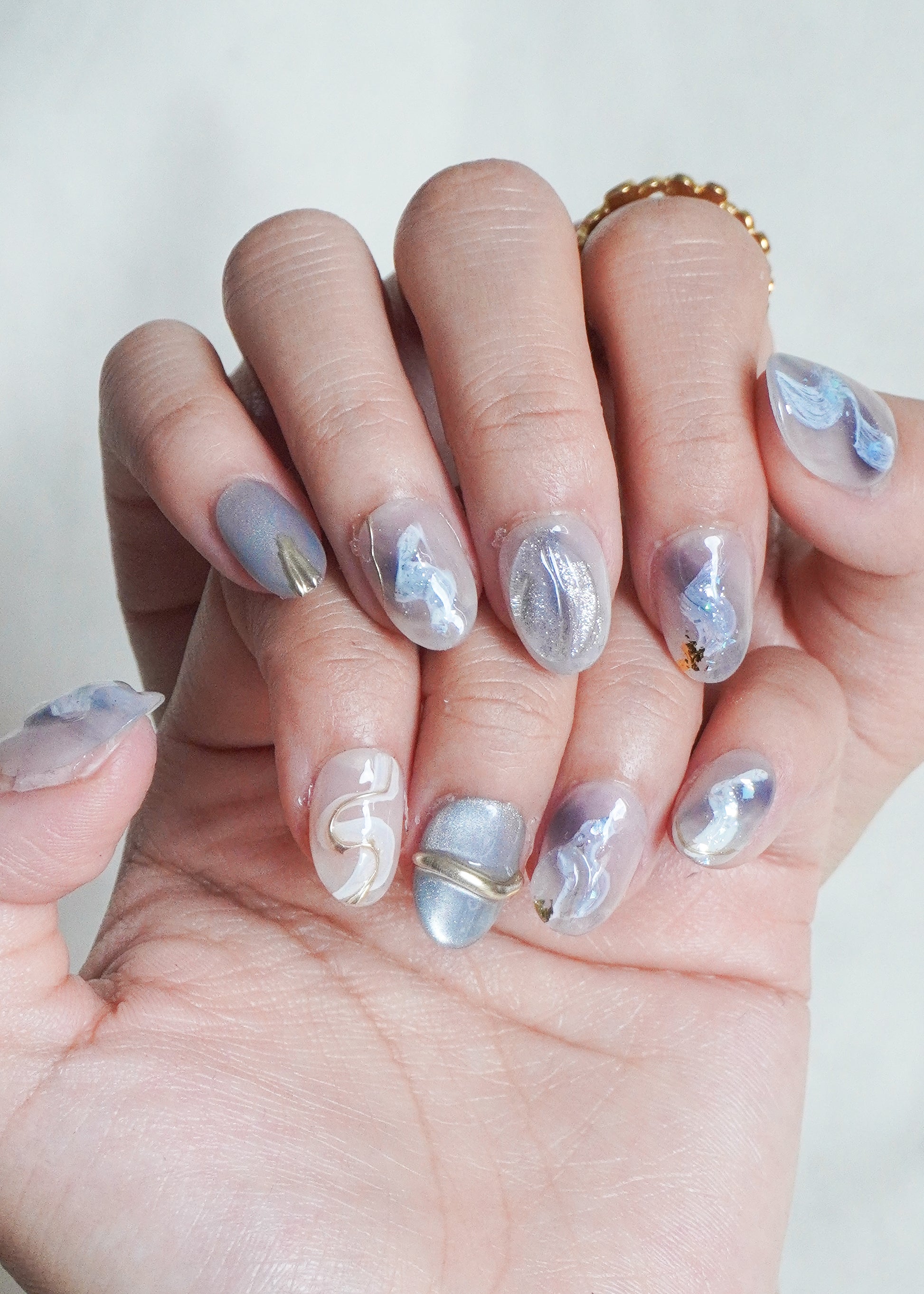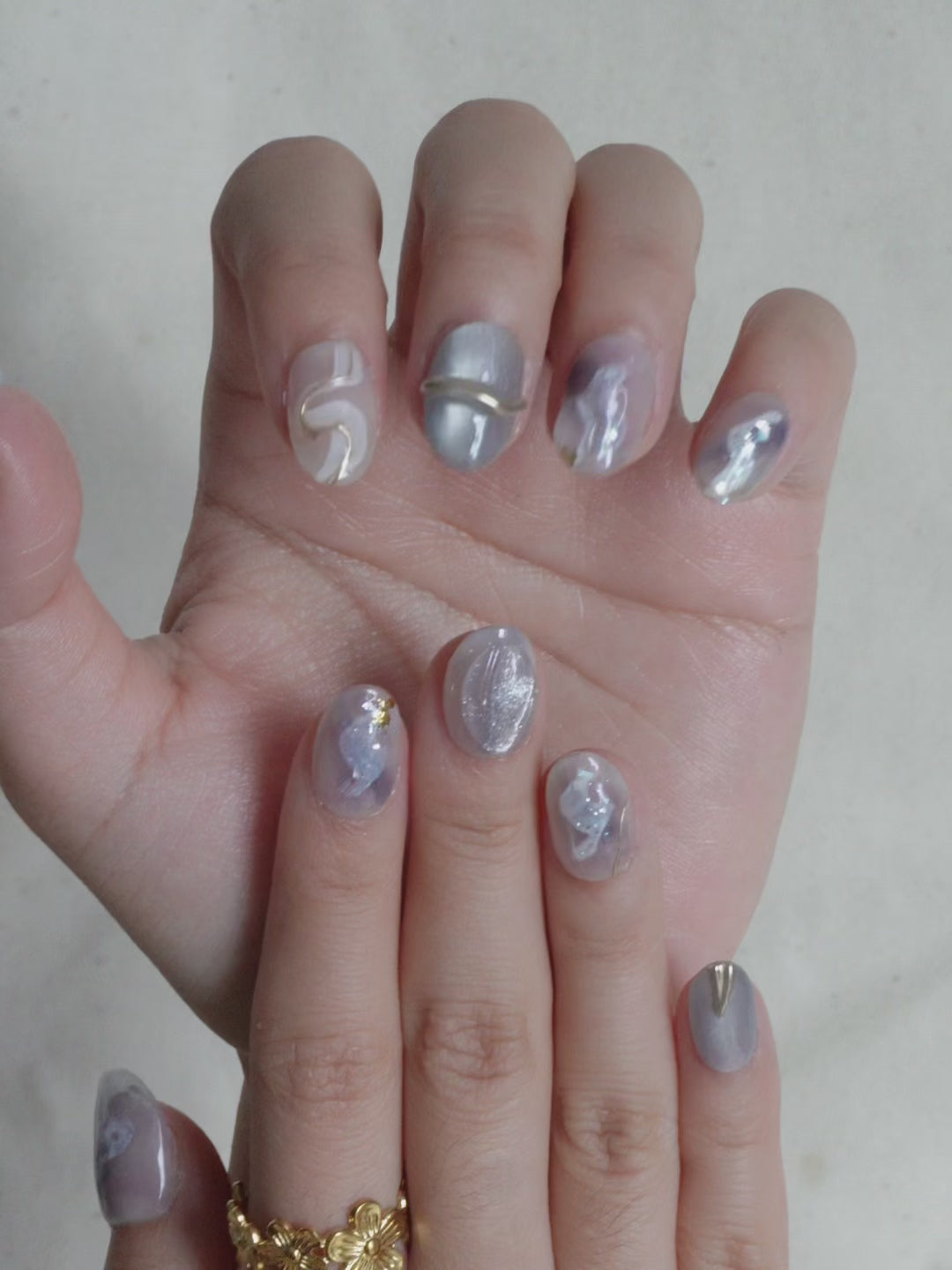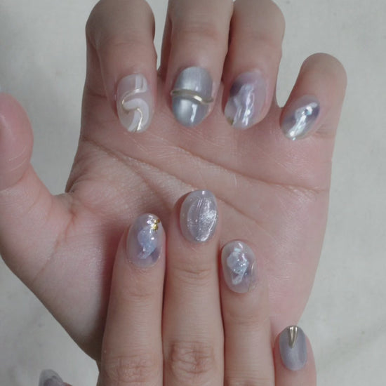 Frost Veil Press On Nail Set captures the glow of winter light through translucent layers of silver, pearl, and icy shimmer. The soft 3D swirls and gold accents add a sculptural, modern touch , a design that feels both delicate and futuristic.