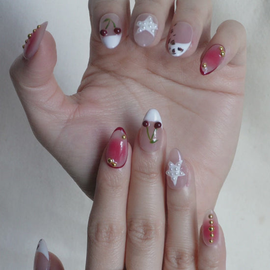 Frosted Cherry press on nails set captures the sweetness of winter in every detail. The mix of cherry French tips, pearly star charms, and winter-white details gives this set a unique Christmas feel without being too traditional. Perfect if you want something cute, fresh, and a little magical for the festive season.