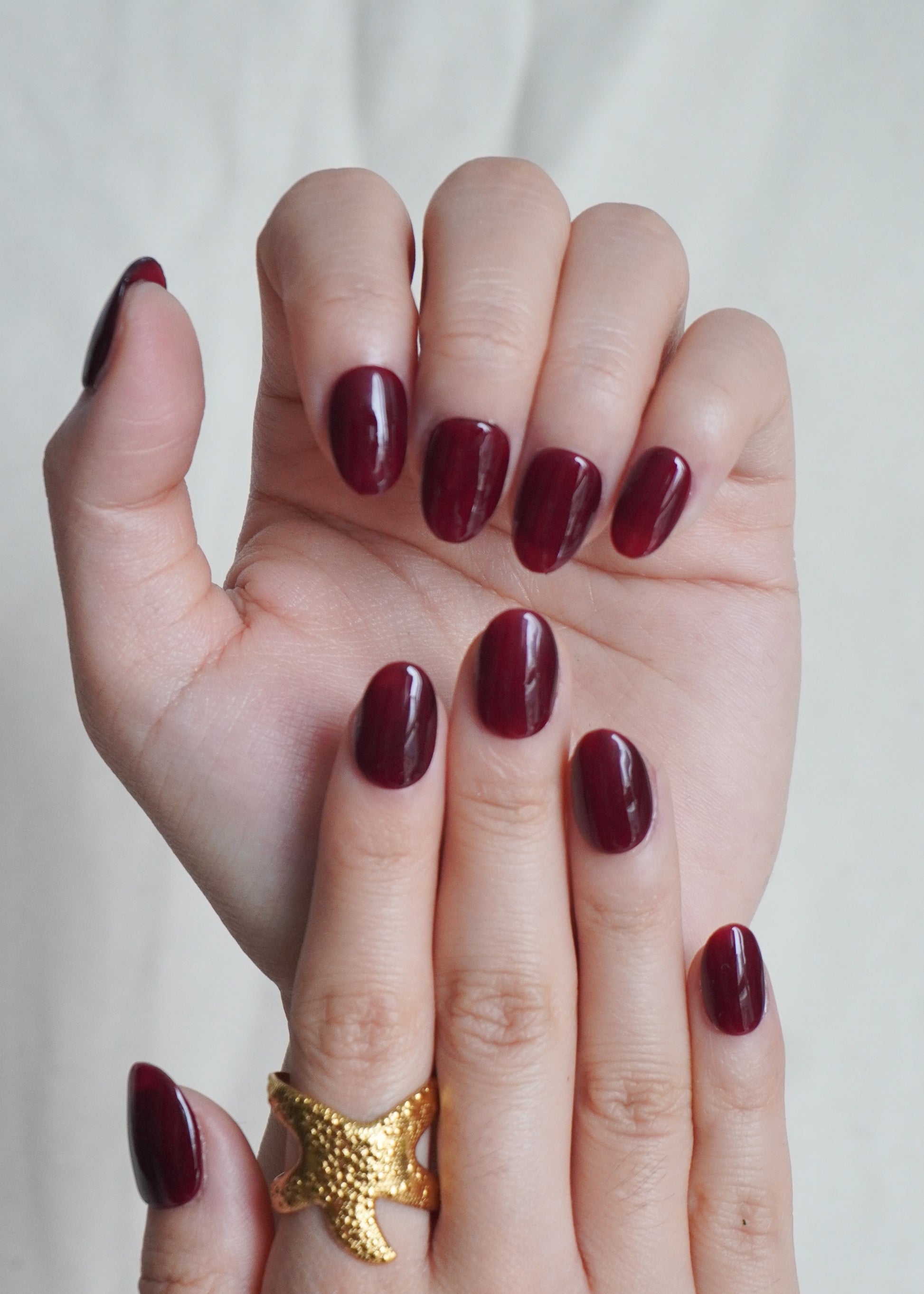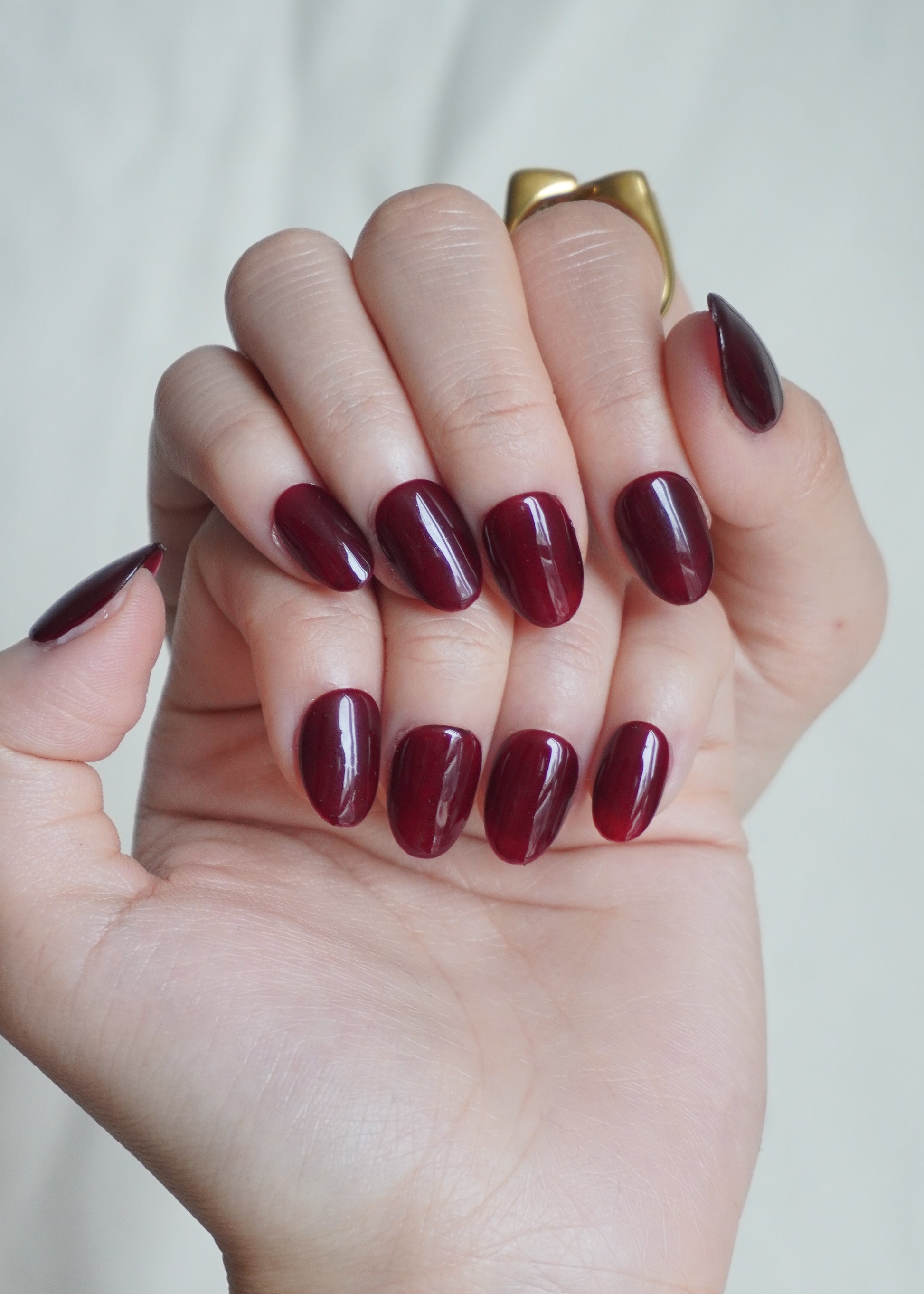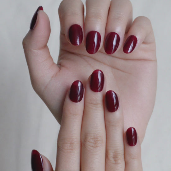 Garnet Press On Nail Set features a deep wine-red shade with a smooth glossy finish. The colour has a rich, polished look that pairs easily with everyday outfits or a dressed-up evening style.