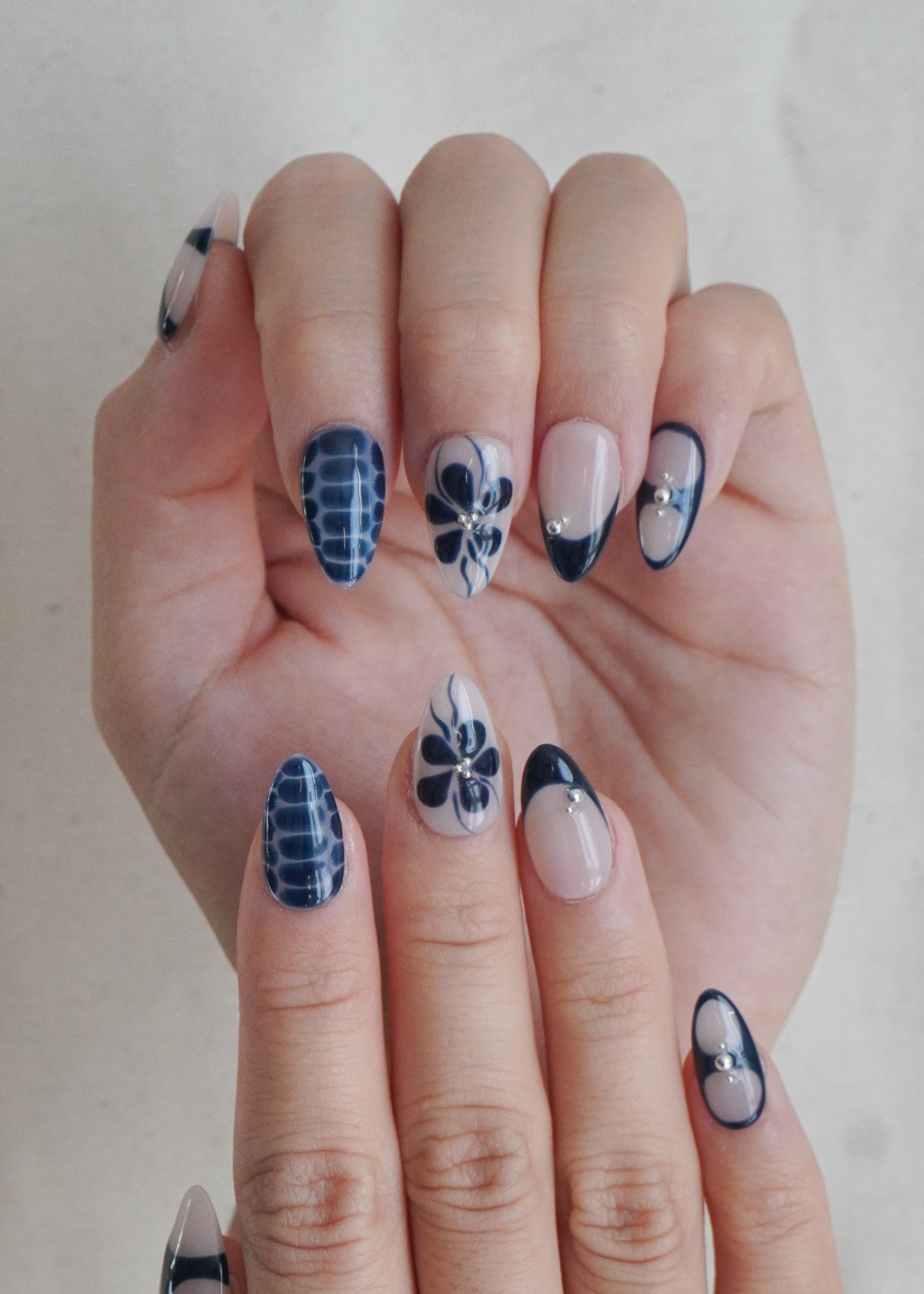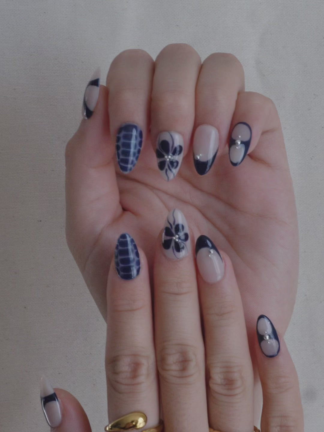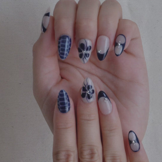 Indigo Petal Press On Nail Set blends deep navy florals, chic French tips, and pearl accents into a striking yet elegant design. The mix of bold petal art and geometric patterns creates a modern statement that feels both sophisticated and playful.