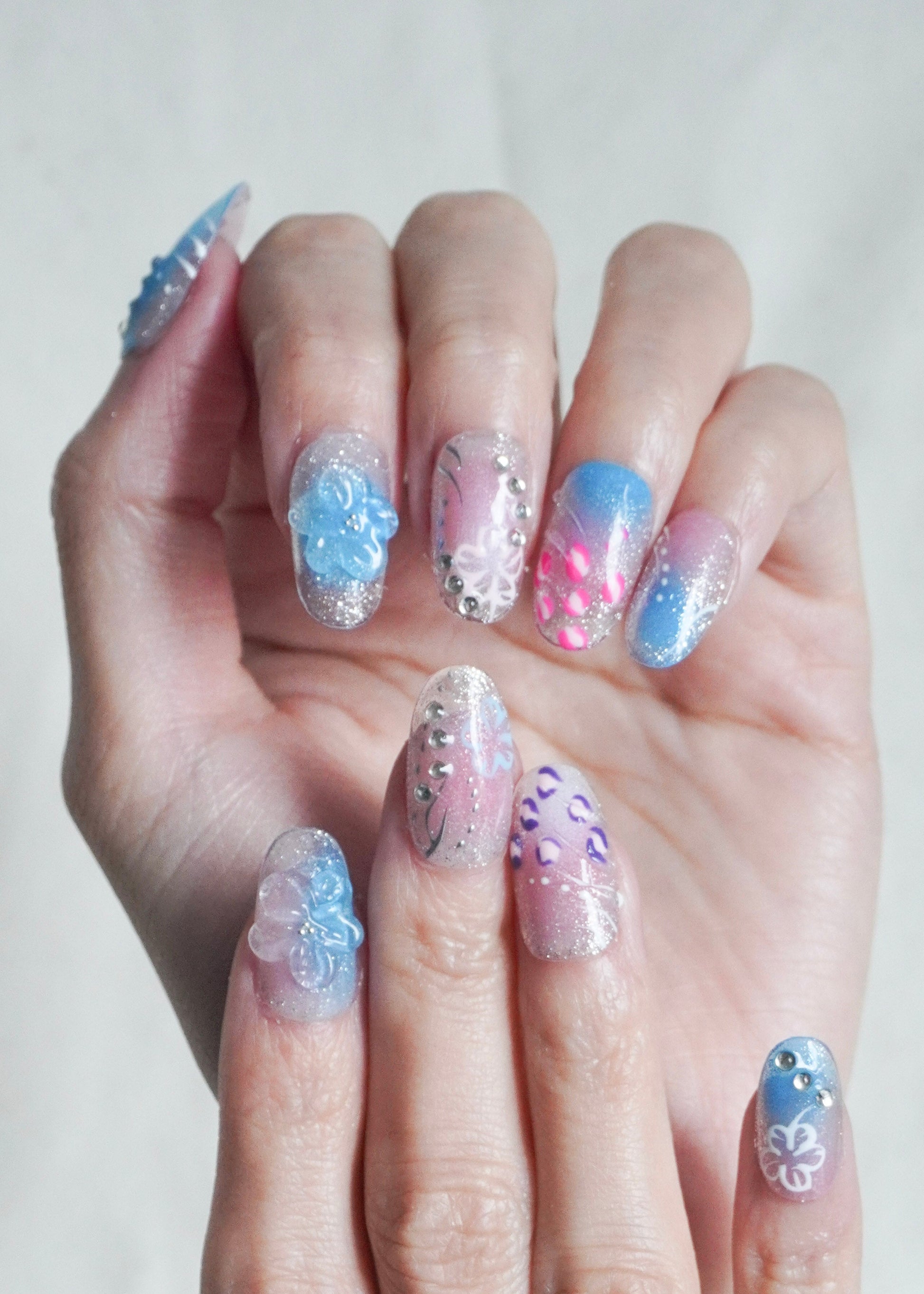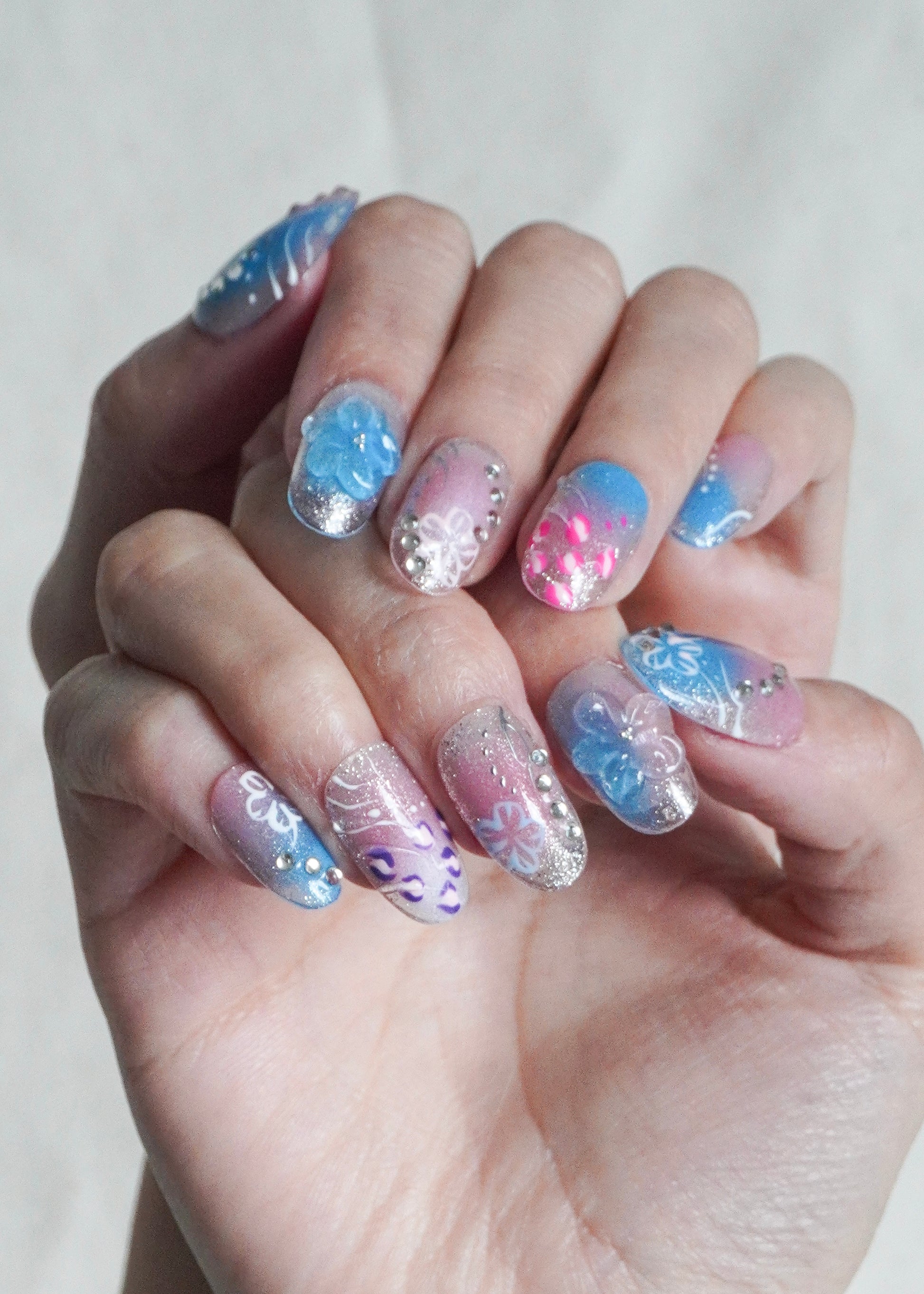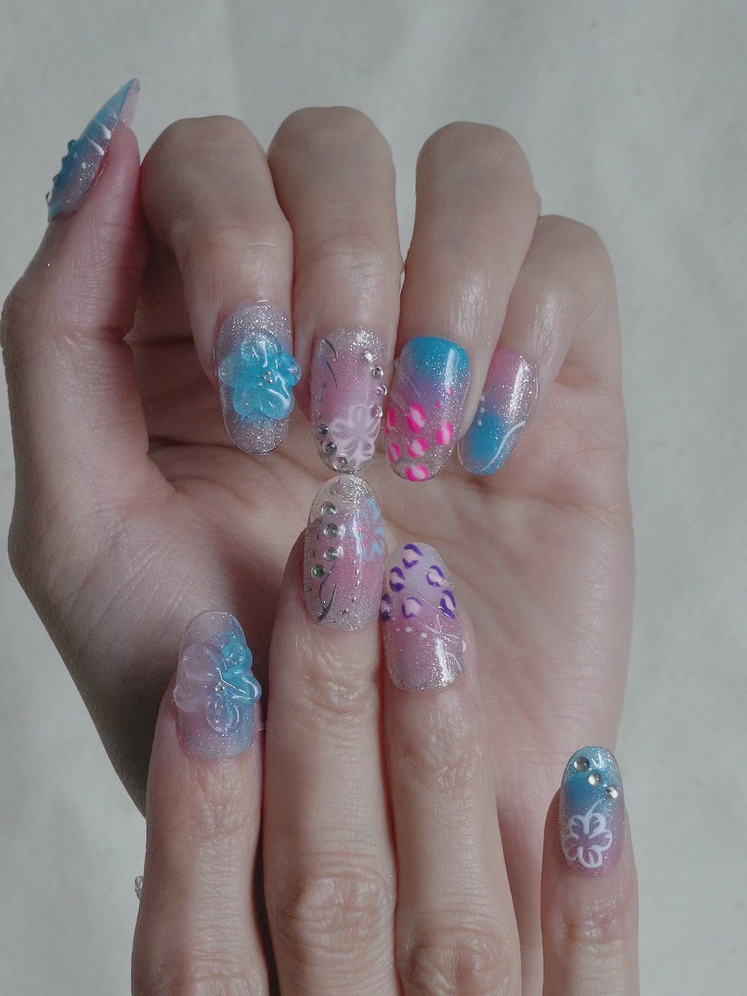 Island Glaze Press On Nail Set captures that carefree holiday feeling in every detail. With a pink-to-blue ombré base, sparkling silver gems, and hand-drawn floral accents, this set is made for sunny getaways, beach cocktails, and poolside selfies. Glossy, fun, and full of summer mood.