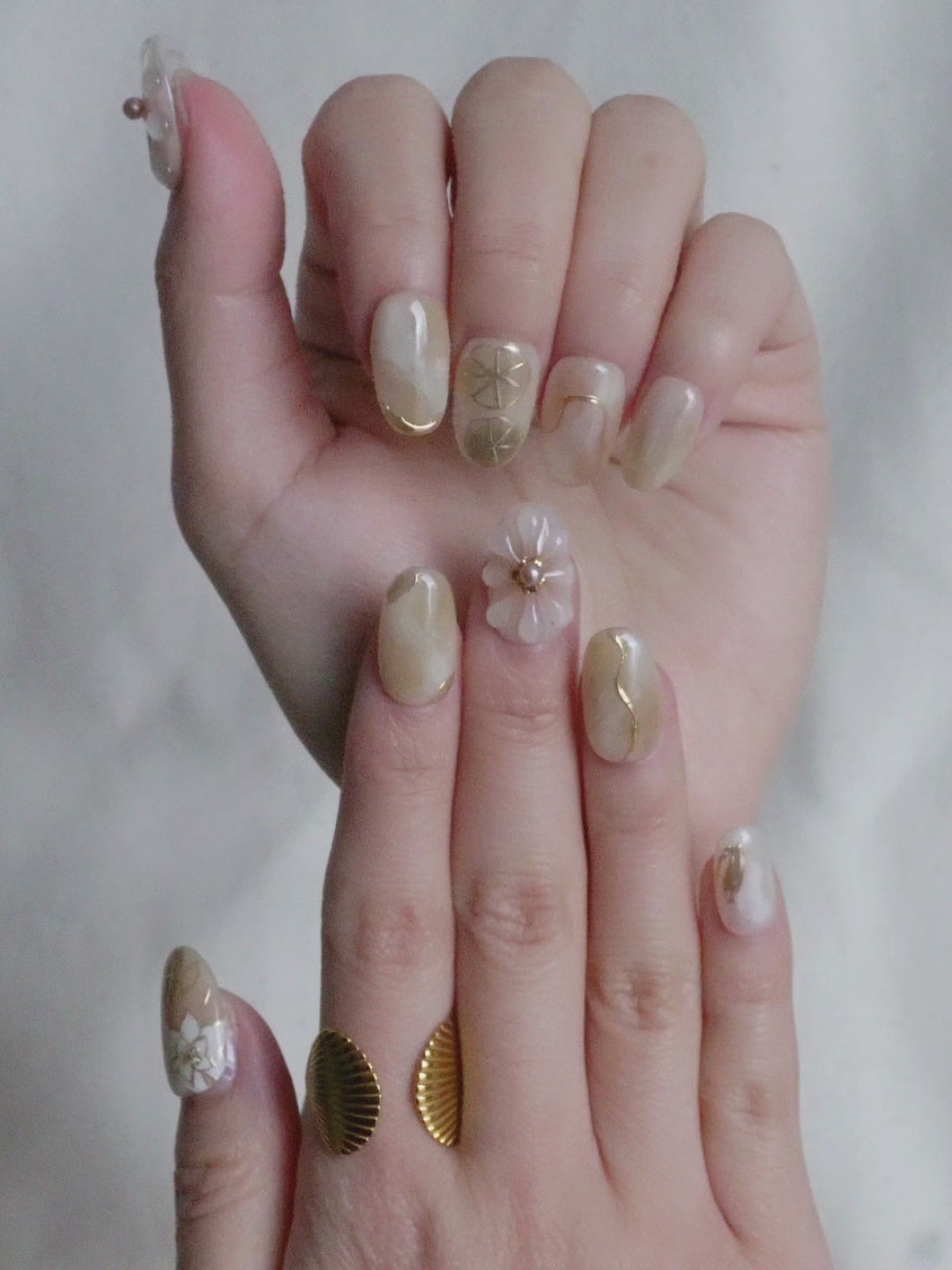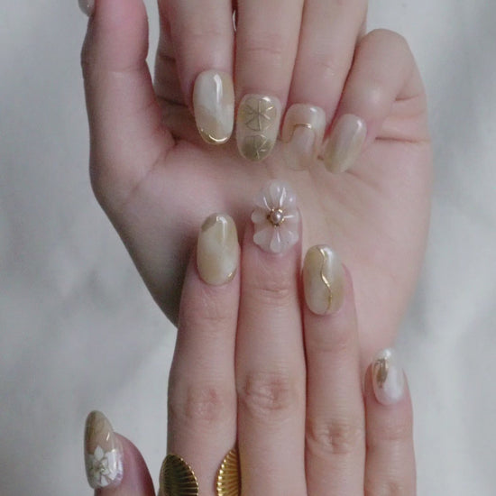 Ivory Bloom Press On Nail Set features soft ivory tones with a semi-sheer finish, detailed with hand-painted gold lines and delicate floral accents. The mix of subtle marbling, metallic touches, and 3D flower details keeps the set refined without feeling plain.