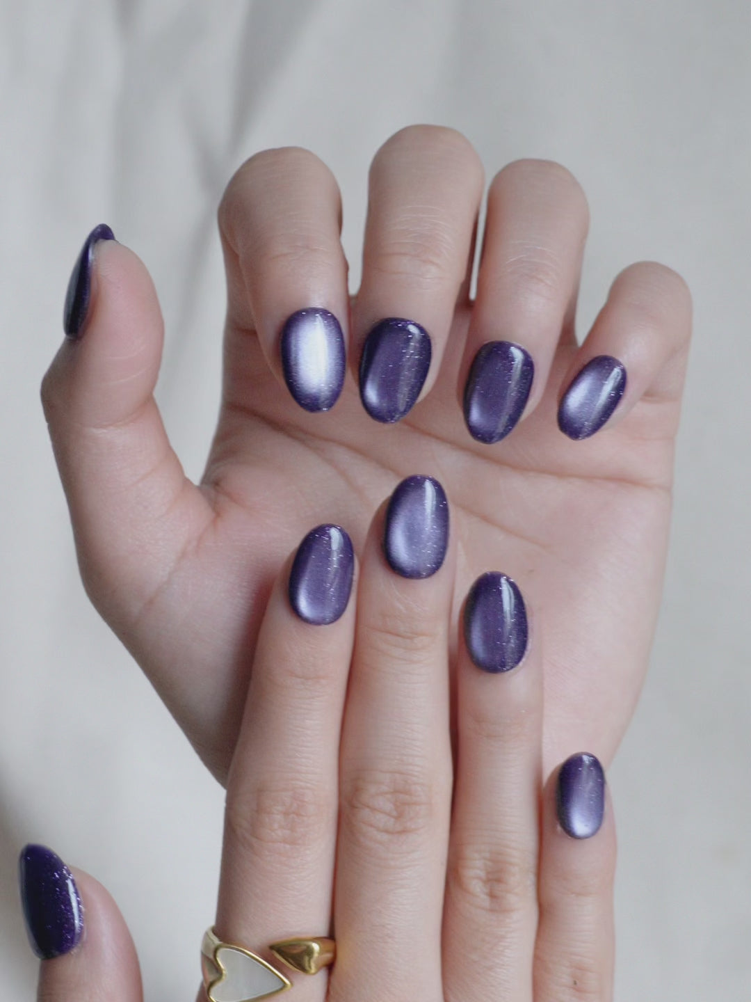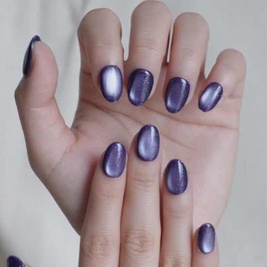 Lavender Galaxy Press On Nail Set blends a cool violet base with a soft cat-eye glow that shifts under the light. The fine shimmer adds a subtle, starry effect without making the nails look too bold.
