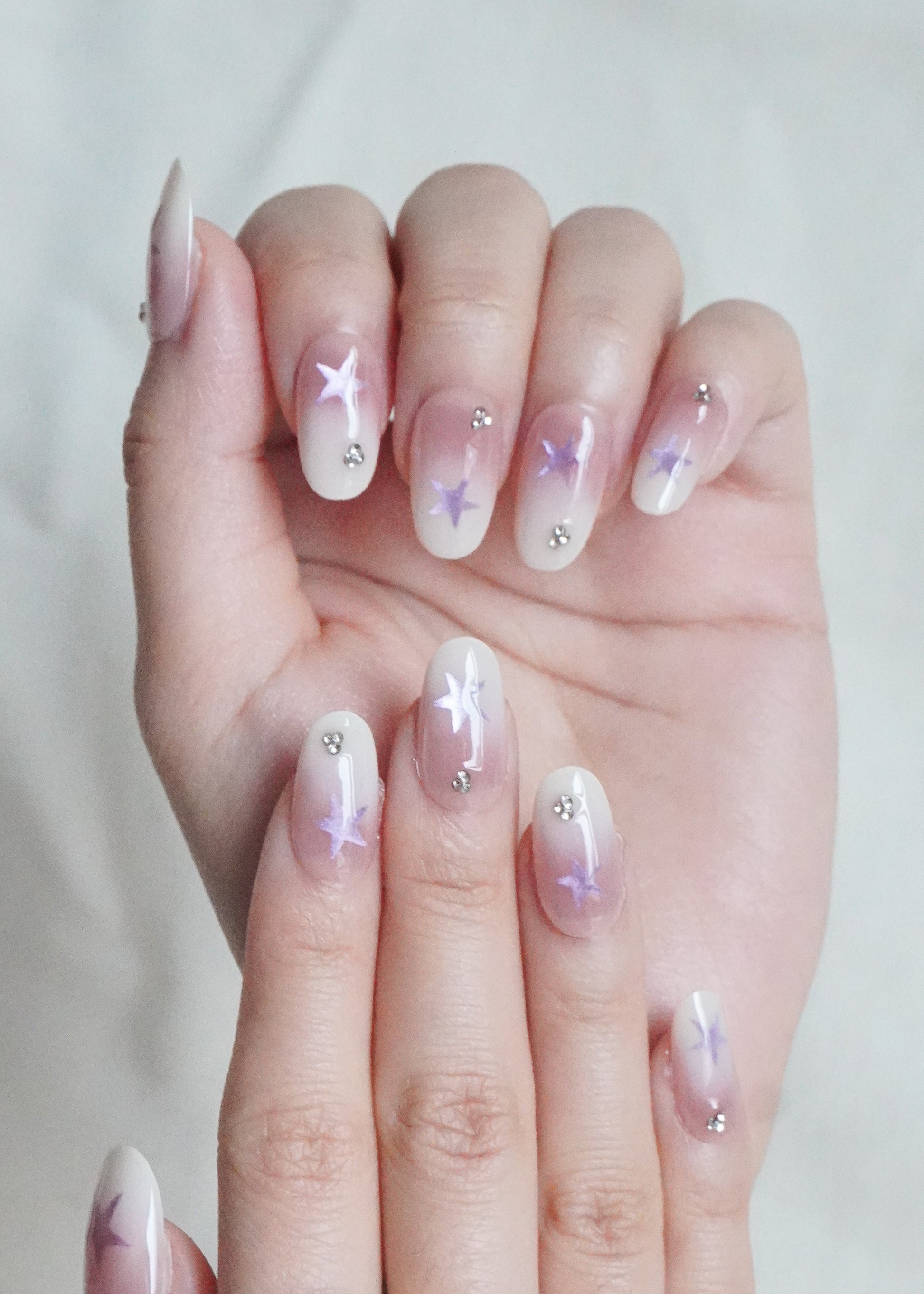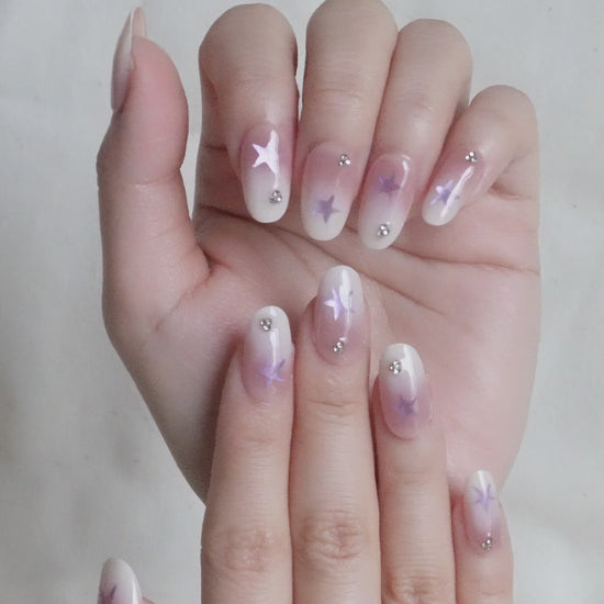 Lilac Star Whisper Press On Nails Set features a milky sheer base blended into soft white tips, finished with delicate lilac stars and subtle crystal accents. The design feels light and airy, like starlight drifting through a winter sky.