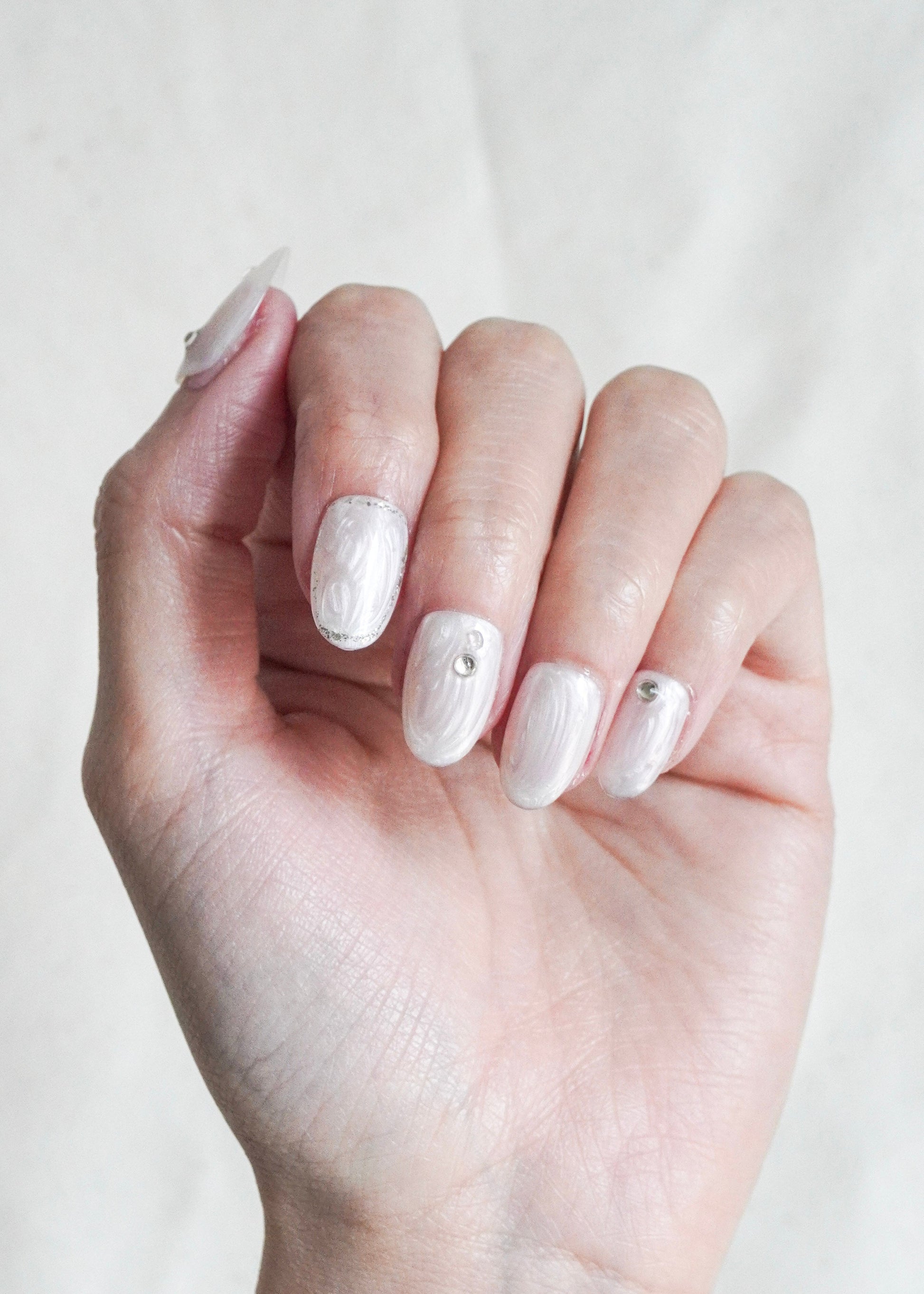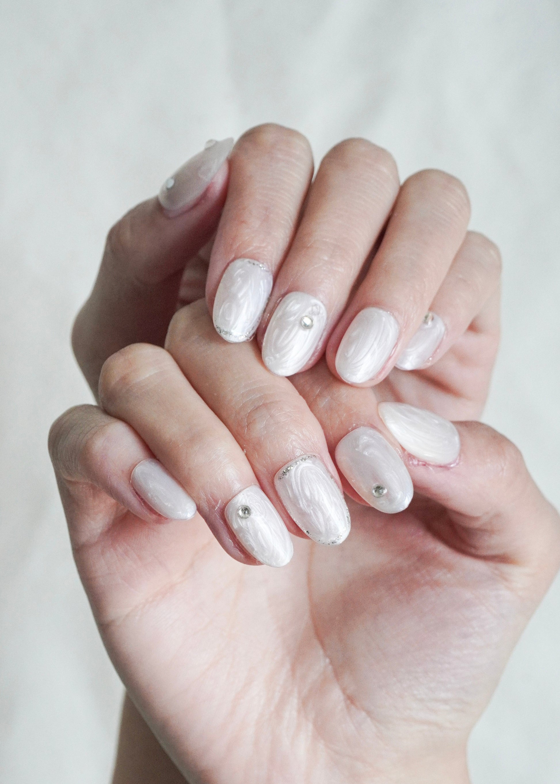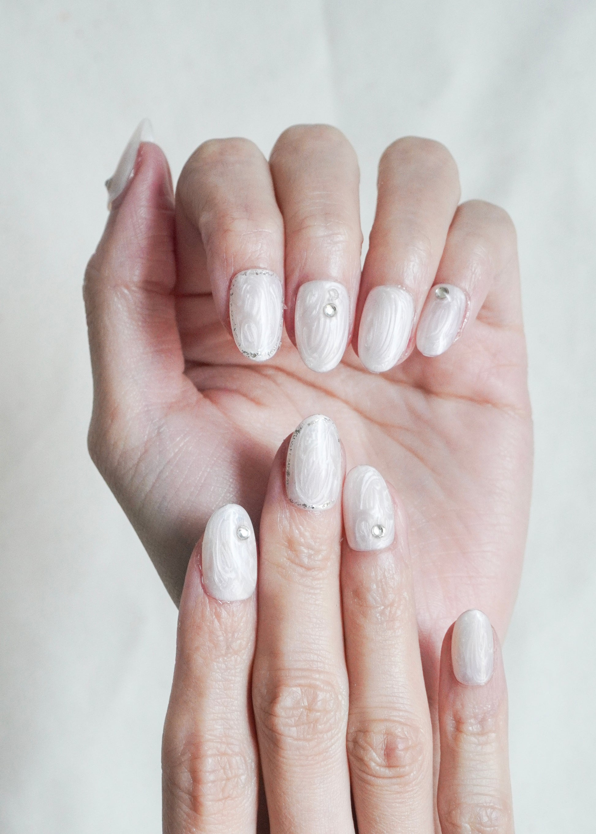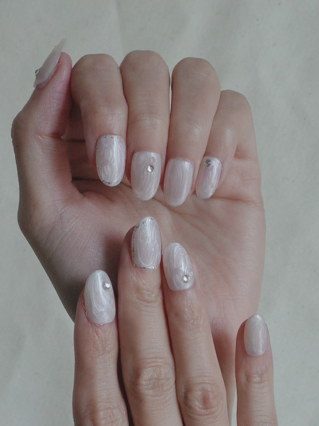 Milky Swirl Press On Nail Set feature a delicate 3D marble texture with a soft iridescent sheen. A dreamy, pearlescent finish meets minimal glam. Each set is adorned with small silver studs for a hint of sparkle, perfect for everyday elegance or bridal beauty.