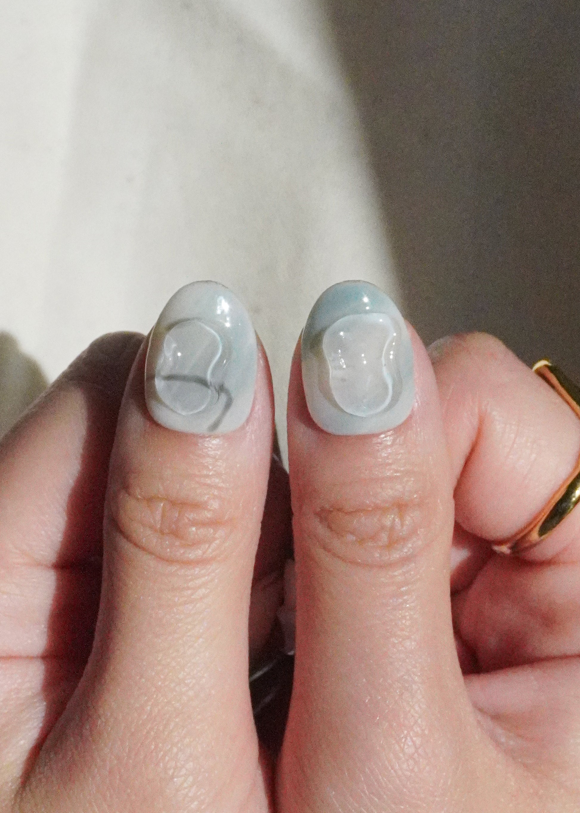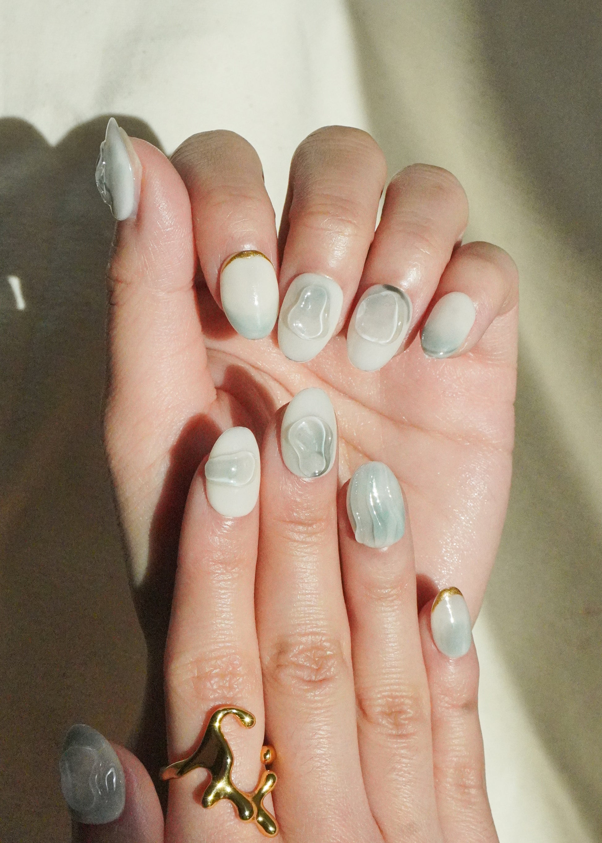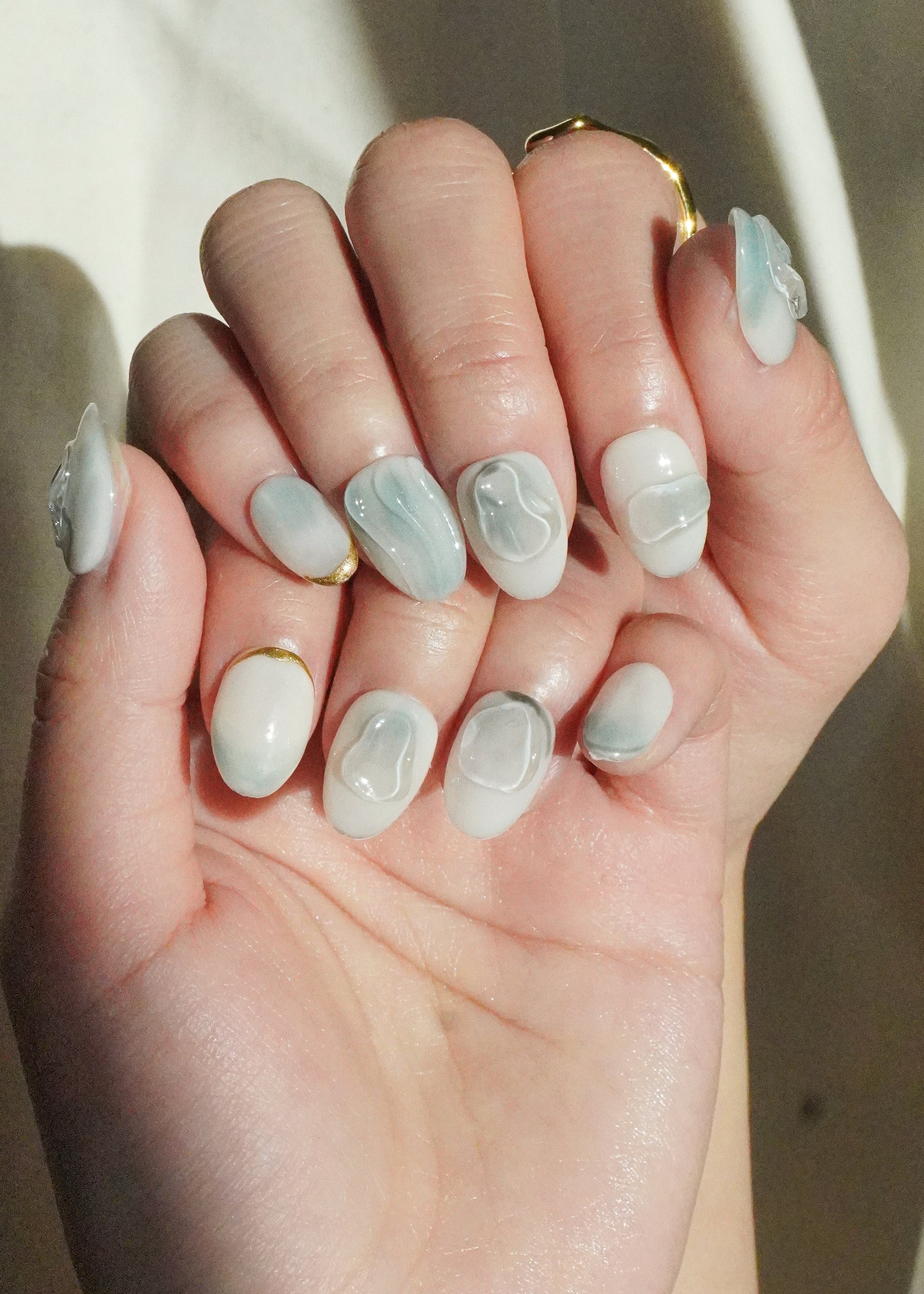Mist Form press-on nails are inspired by the quiet beauty of ice mountains and freshly fallen snow. Soft grey and milky tones blend with sculpted gel textures that resemble frozen ridges and drifting snow.