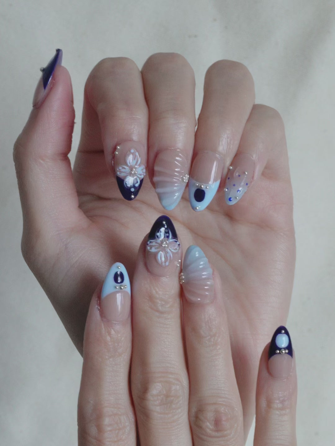 Navy Petals Press On Nail Set brings a spring twist to classic blue with a soft blend of navy and baby blue, layered over a sheer nude base. Delicate 3D flowers, dewdrop-like embellishments, and ripple textures add dimension and charm. It’s the perfect balance of crisp and playful.