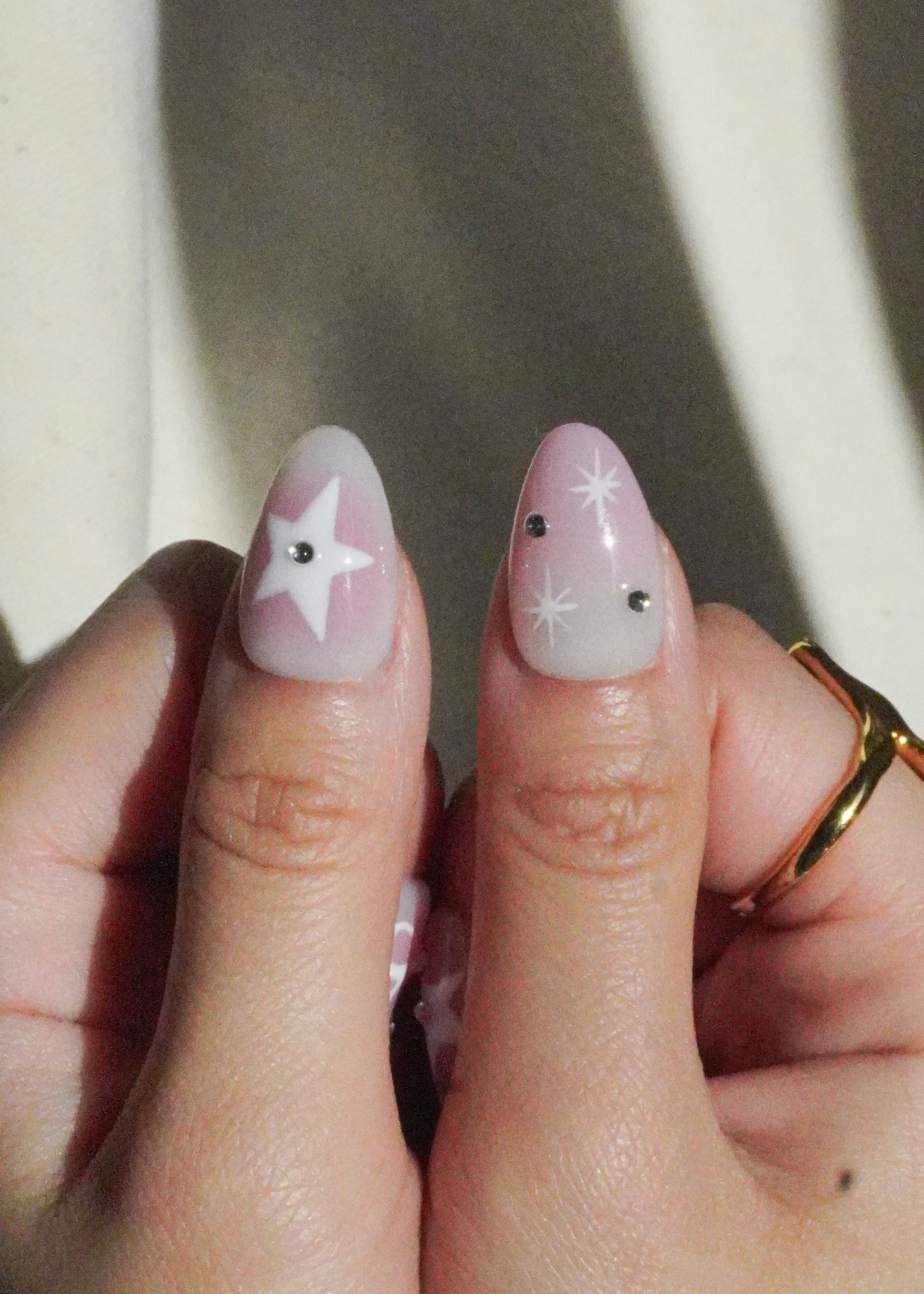 Pink Stardust Press On Nails bring together soft pink tones, delicate bows, and twinkling star details for a dreamy celestial look. Subtle shimmer and playful accents create a design that feels light, magical, and effortlessly charming.