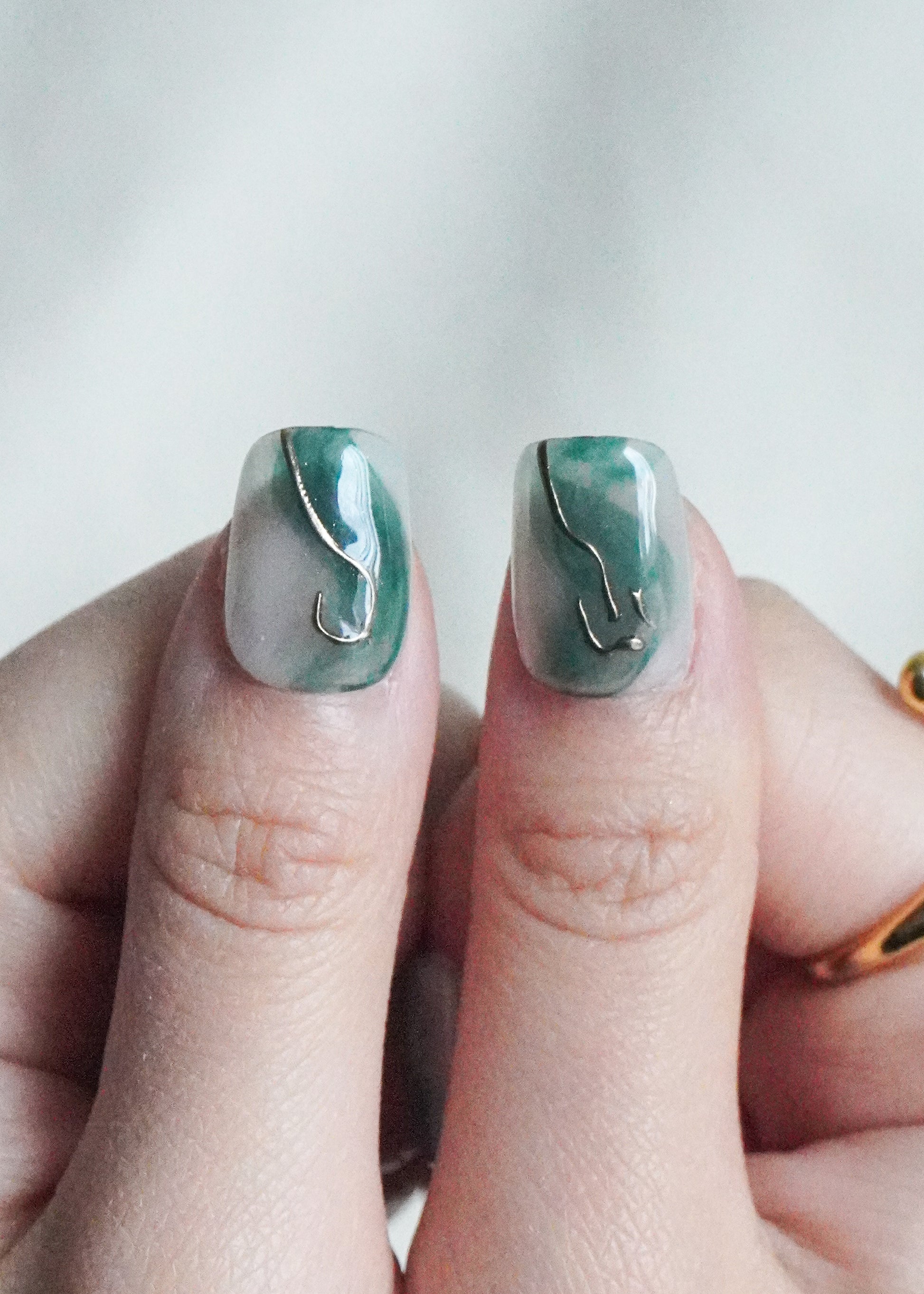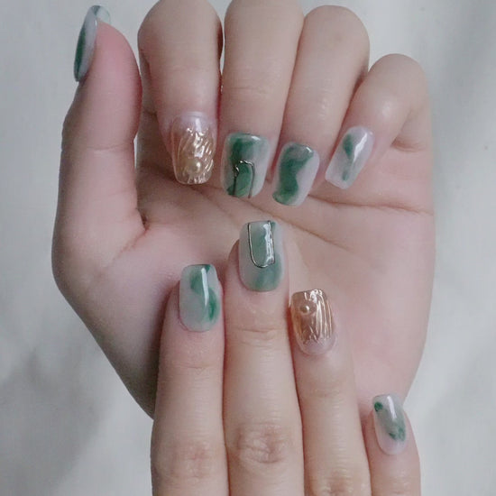 Raw Jade Press On Nail Set features translucent nude bases layered with marbled green tones and fine metallic line details. Subtle gold accents and sculptural textures add depth while keeping the overall look calm and grounded.