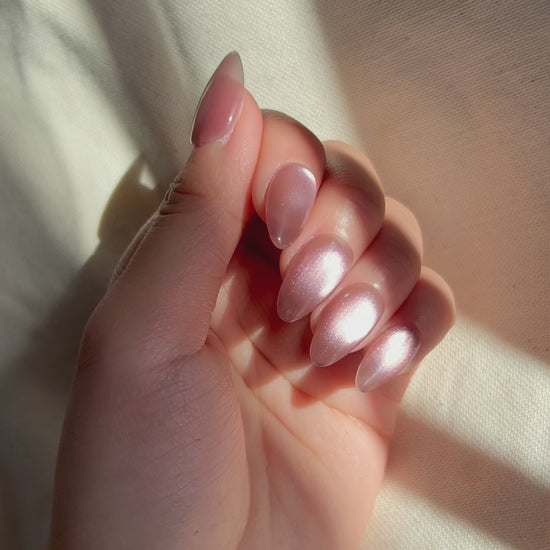 Rose Aura Press On Nail Set features a soft rosy base with a luminous chrome sheen, creating a smooth, light-reflective finish. Elegant, delicate, and effortlessly refined.