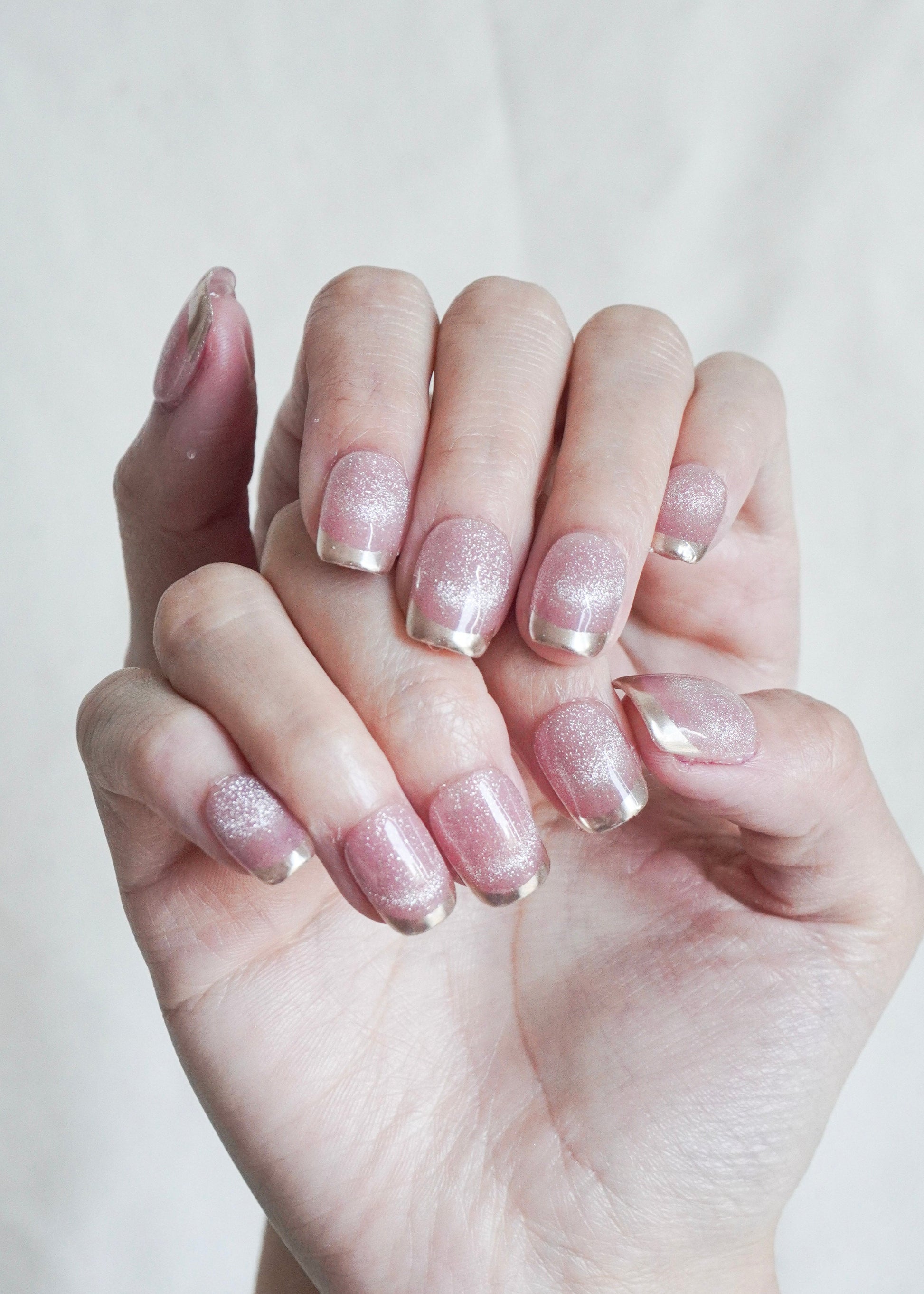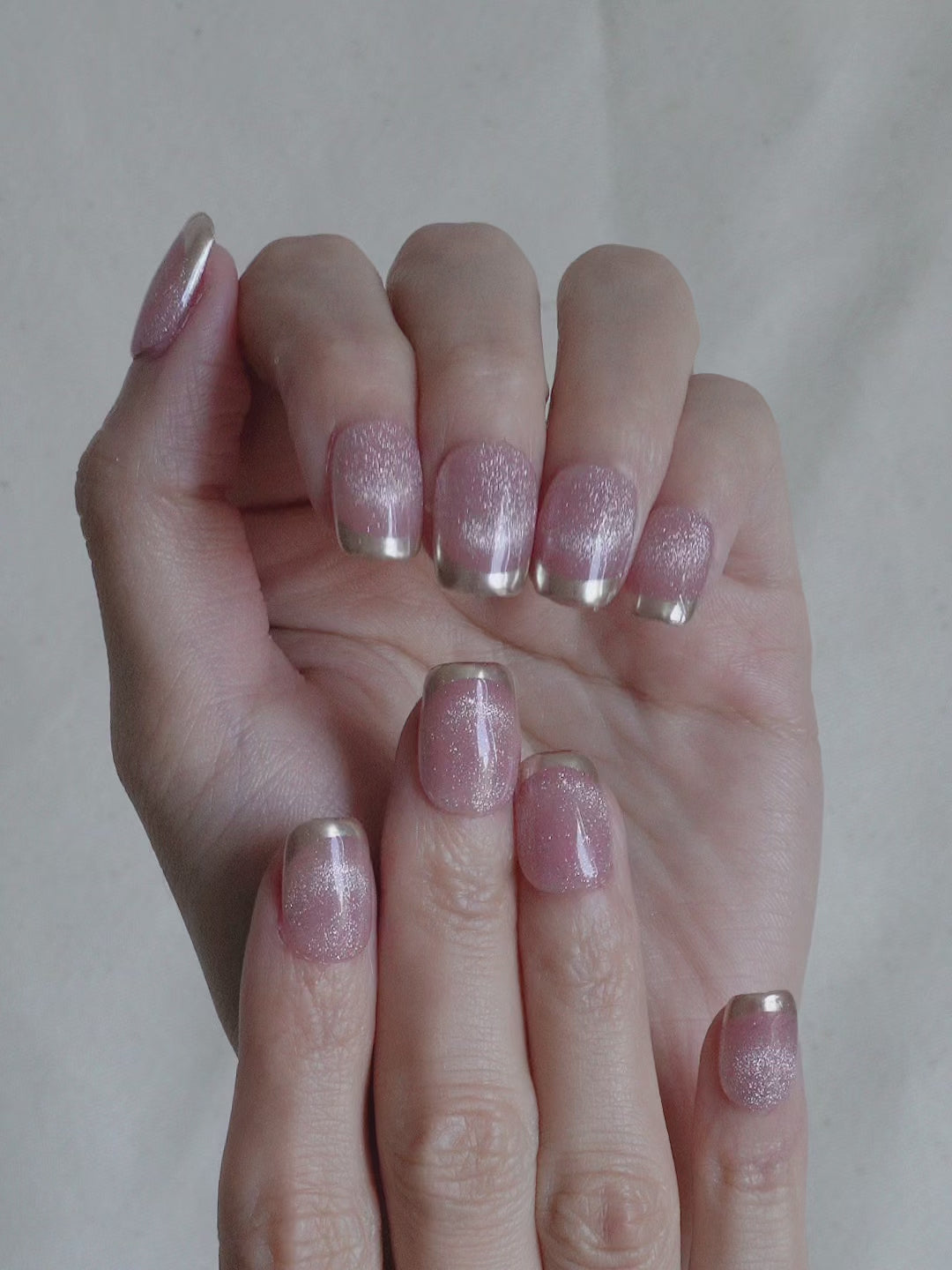 Rosé Luxe pairs a cat-eye rosy pink shimmer base with polished metallic gold French tips for a look that’s both delicate and refined. This set is perfect for special occasions, bridal looks, or simply adding a little sparkle to your everyday.