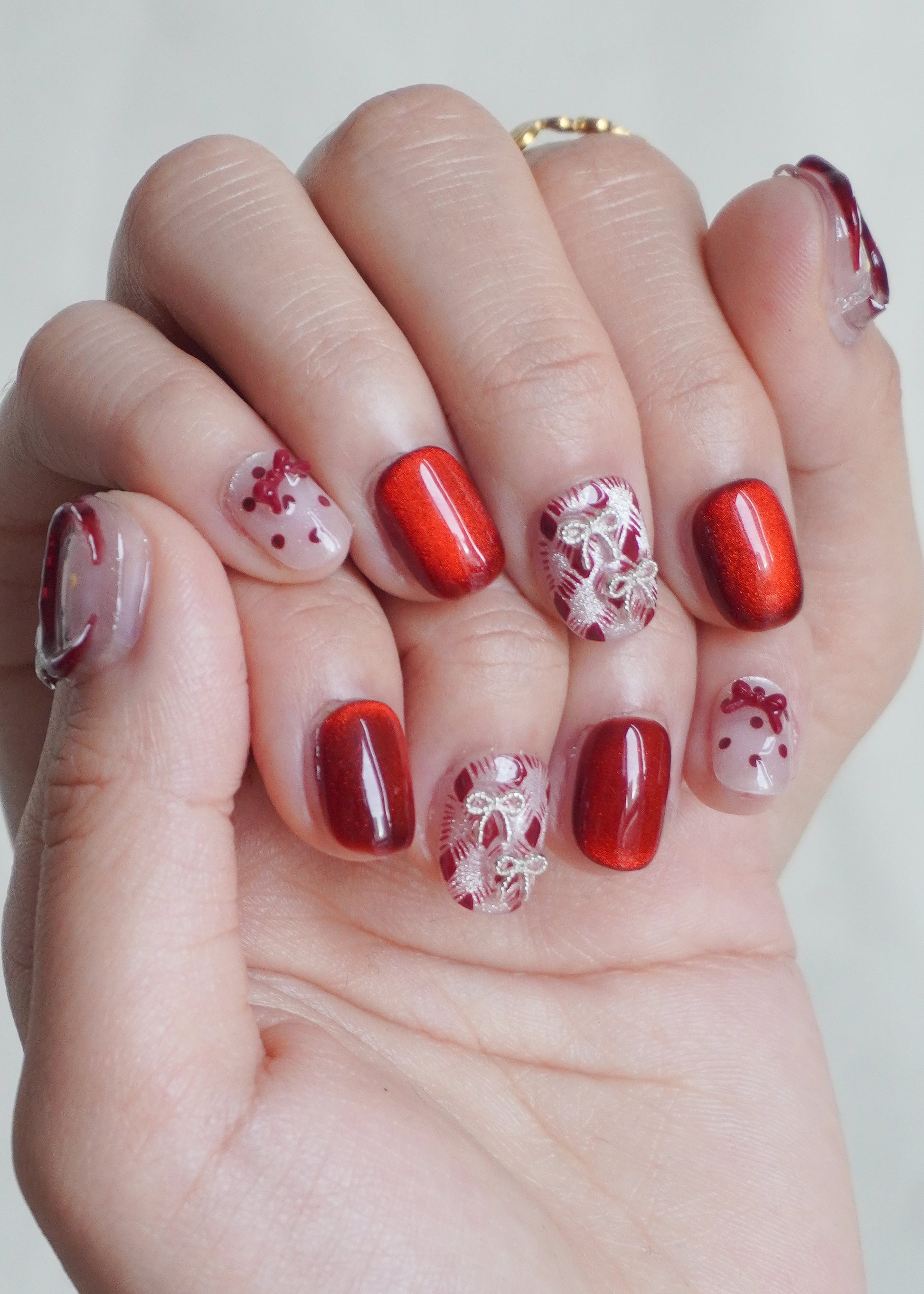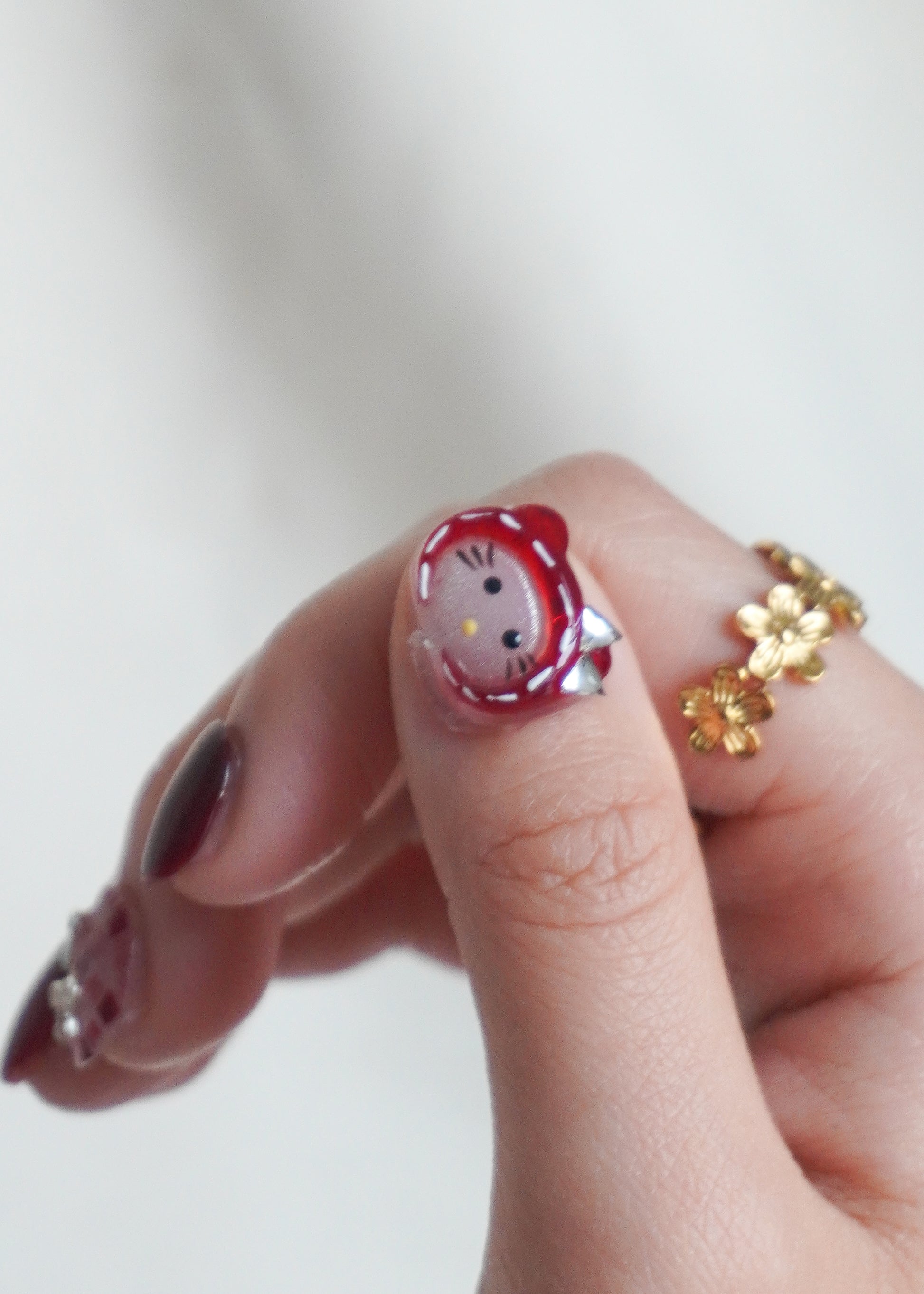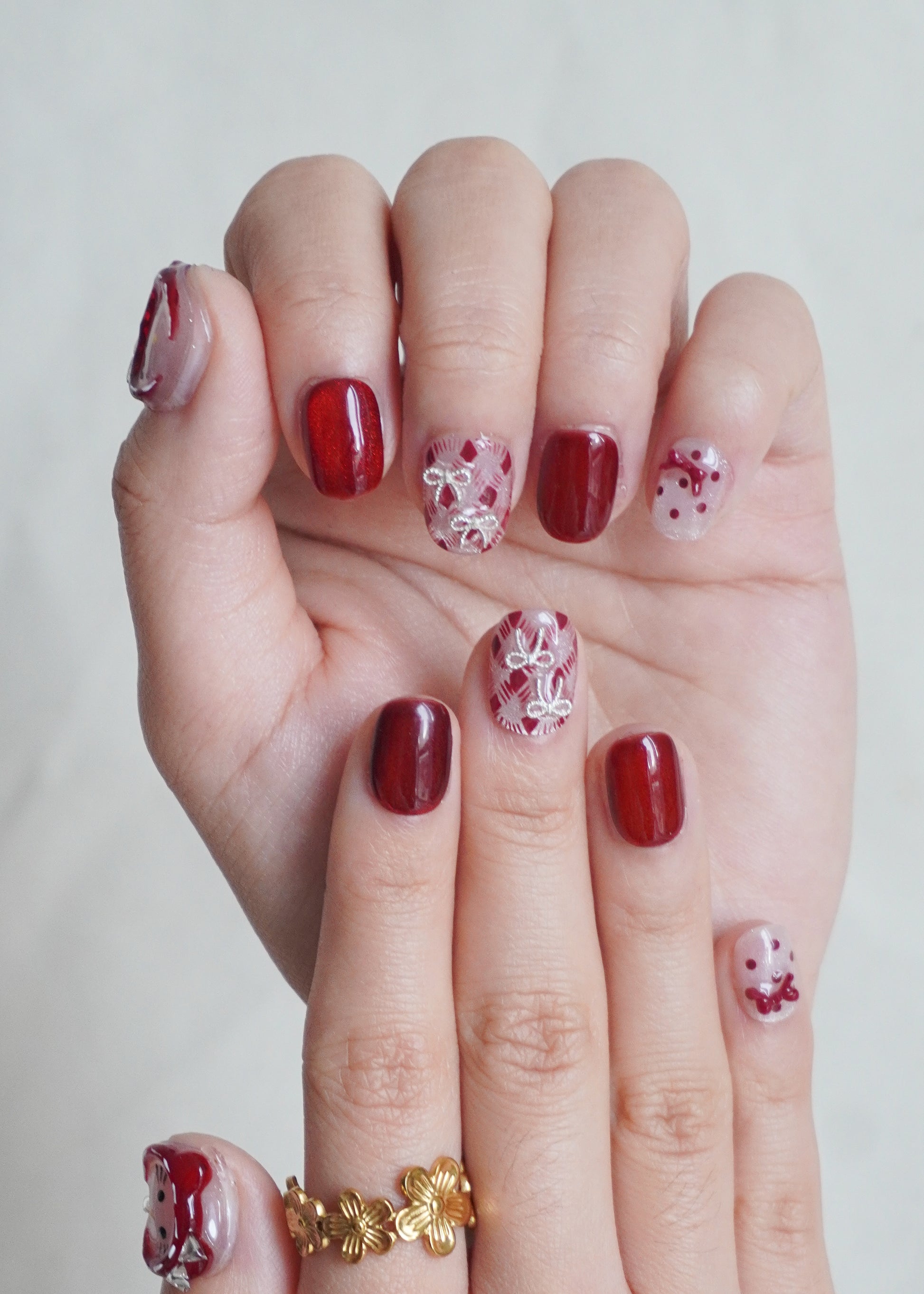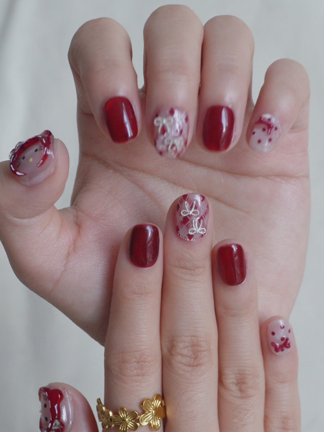 Ruby Kitty Press-On Nail Set brings that perfect mix of sweet and bold. With deep ruby red tones, soft plaid patterns, and tiny bow accents, this set gives your nails that “main character in December” energy.