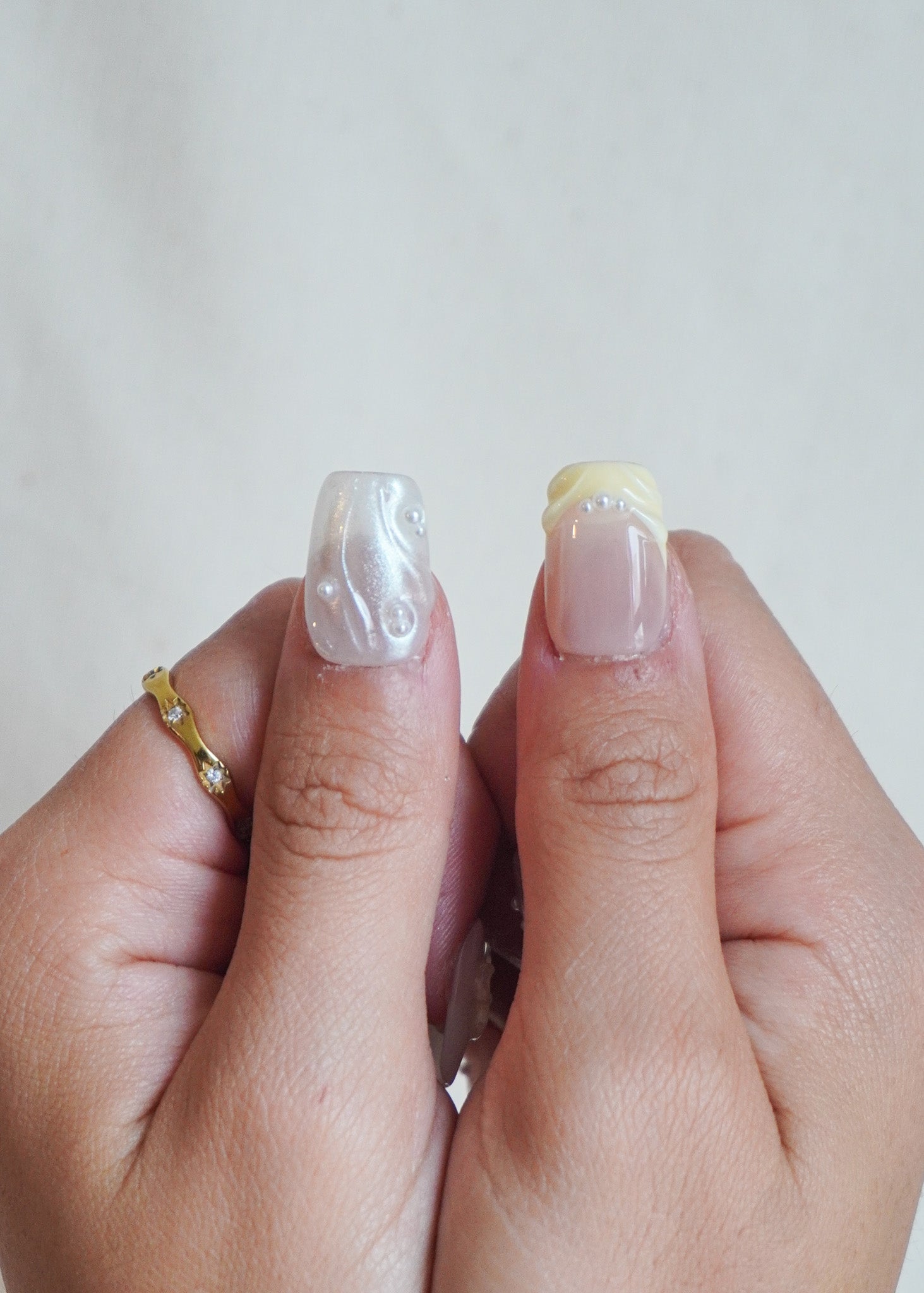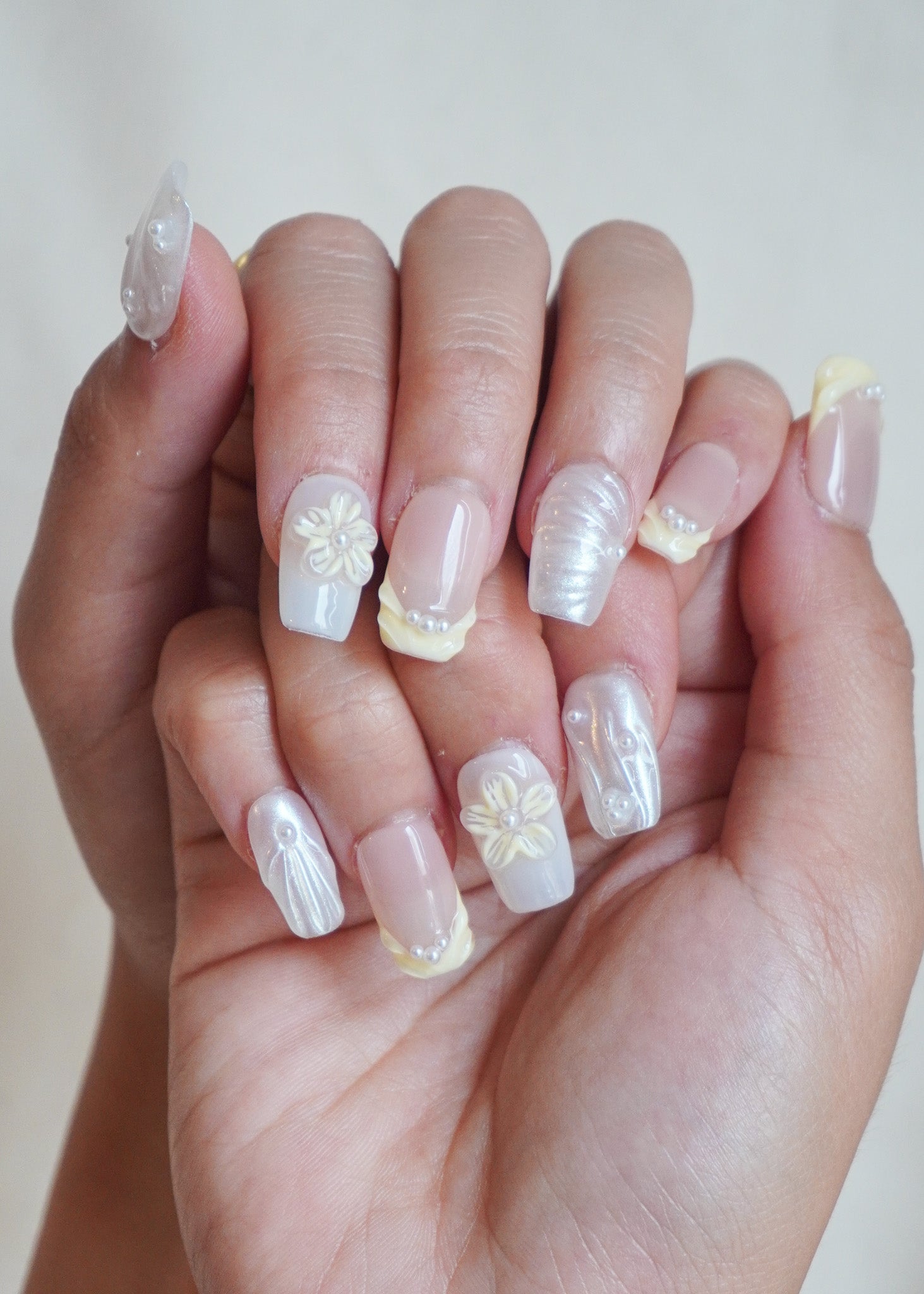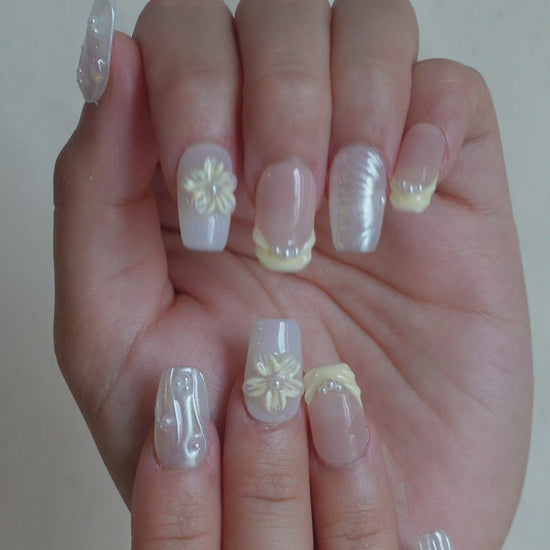 Shell Glow press-on nail set captures the glow of seashells and the charm of coastal blooms, combining pearl-white textures, soft yellow floral accents, and delicate 3D wave details. It’s a set that feels like sunlight bouncing off ocean foam subtle yet striking.