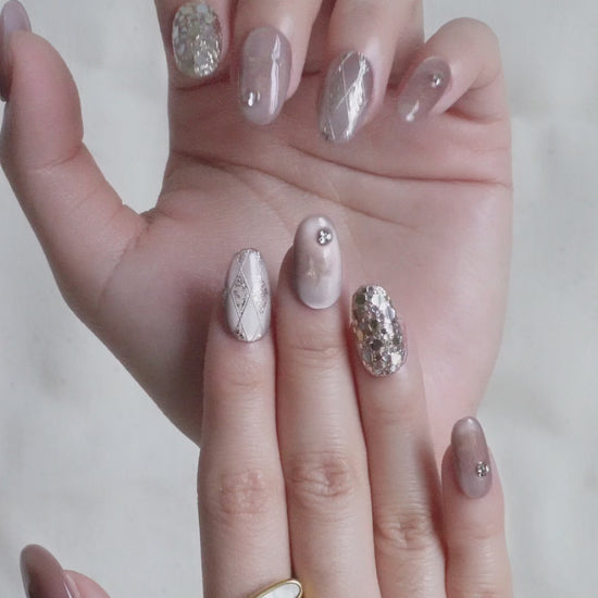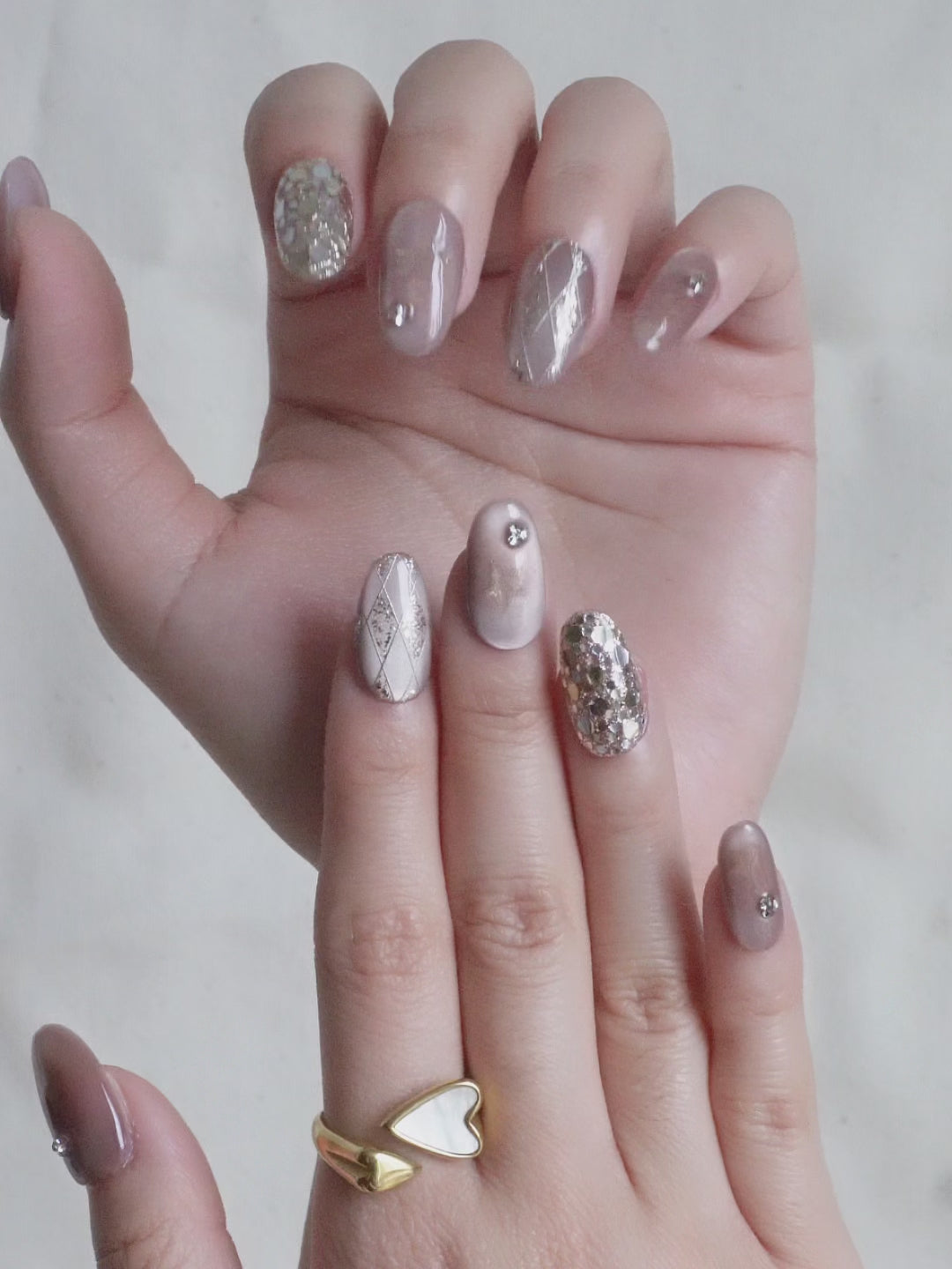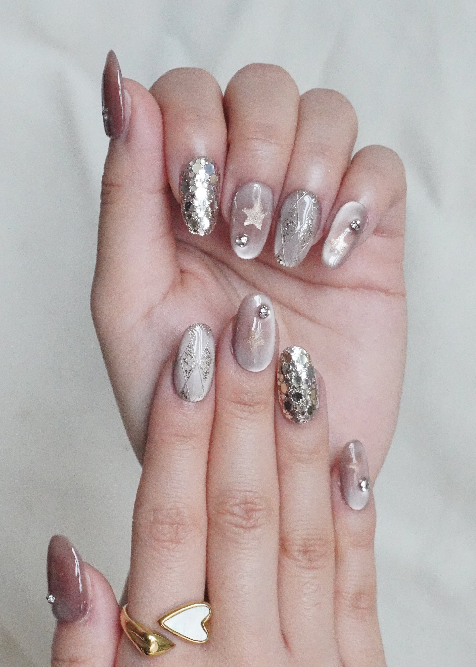 Silver Constellation press on nails set blends soft nude tones with silver foil, subtle glitter, and star details for a look that feels elegant but still playful. Inspired by winter skies and scattered starlight, this set is perfect when you want something refined, eye-catching, and easy to wear from day to night.