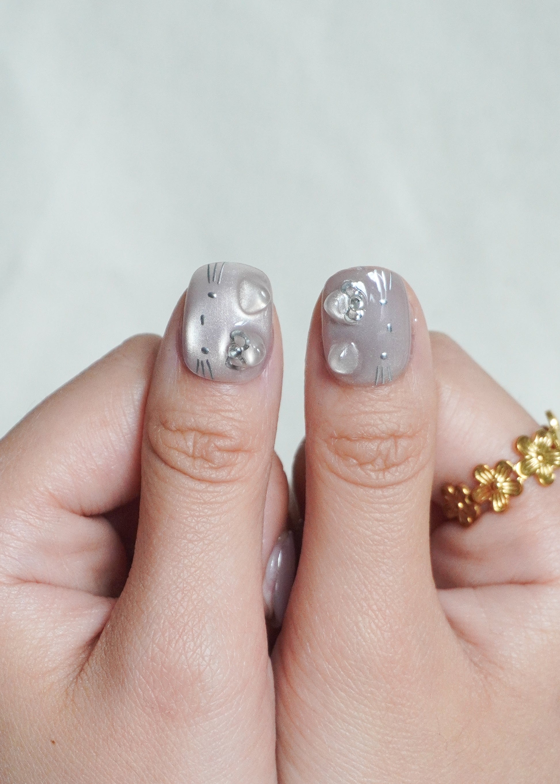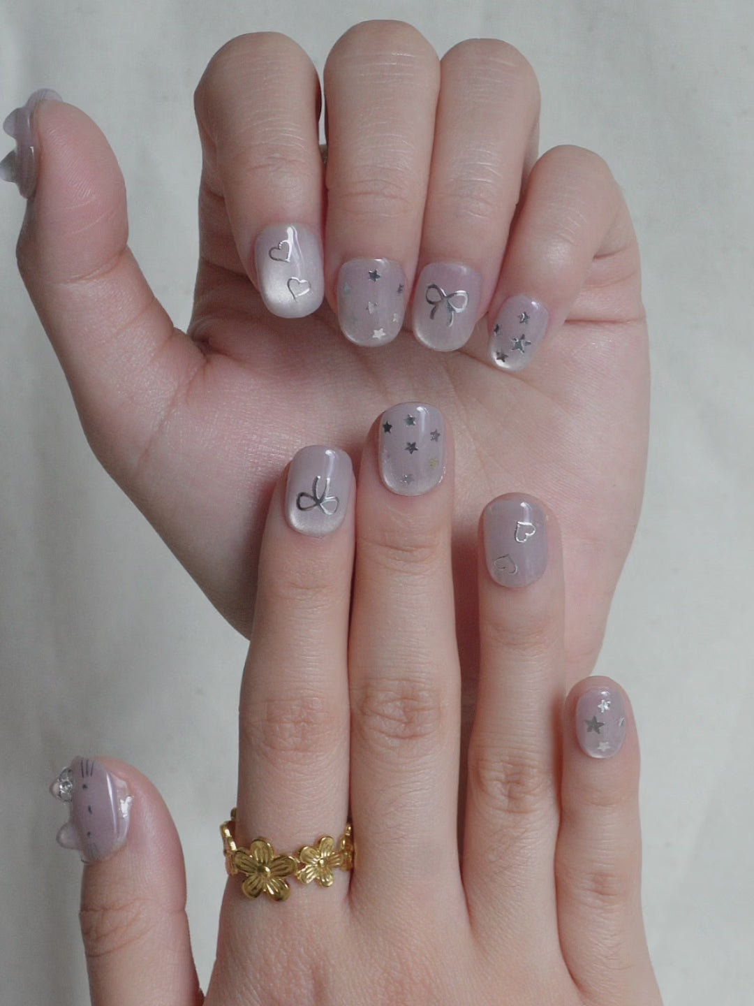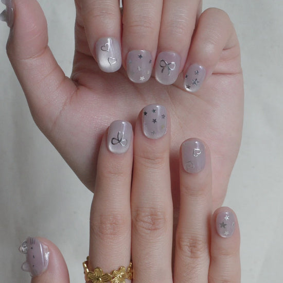 Silver Kitty Press On Nail Set is your new go-to for that soft shimmer and subtle sparkle. The pearl-silver cat-eye catches the light just right, while tiny hearts, stars, and bows add a dose of cuteness.