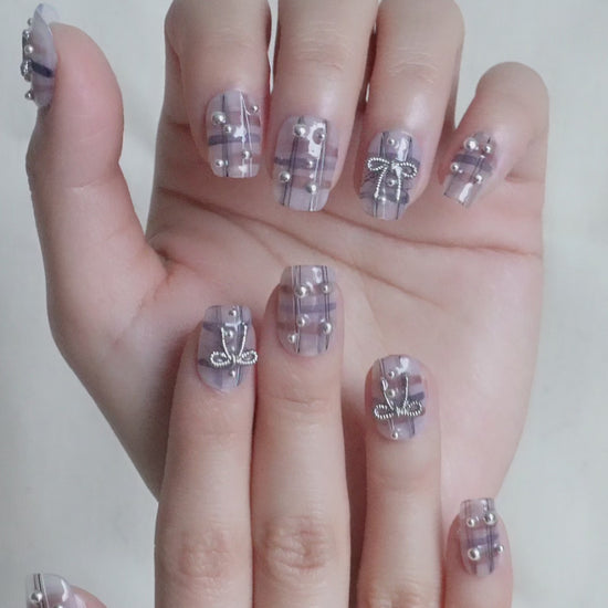 Silver Plaid Press On Nails Set is inspired by softly wrapped Christmas gifts and winter tailoring. Featuring a translucent plaid base layered with cool silver lines, pearl accents, and delicate bow charms, this set feels polished, festive, and quietly luxurious.