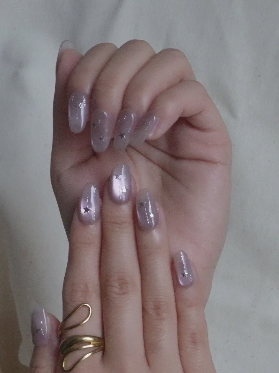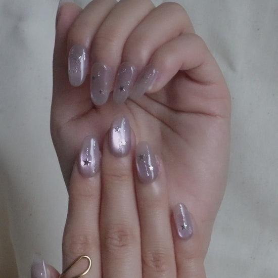 Silver Stardust Press On Nails Set features a soft sheer grey base layered with pearly silver highlights and scattered metallic star accents. Minimal yet luminous, the design catches the light with a subtle glow, giving an effortless, cosmic feel.