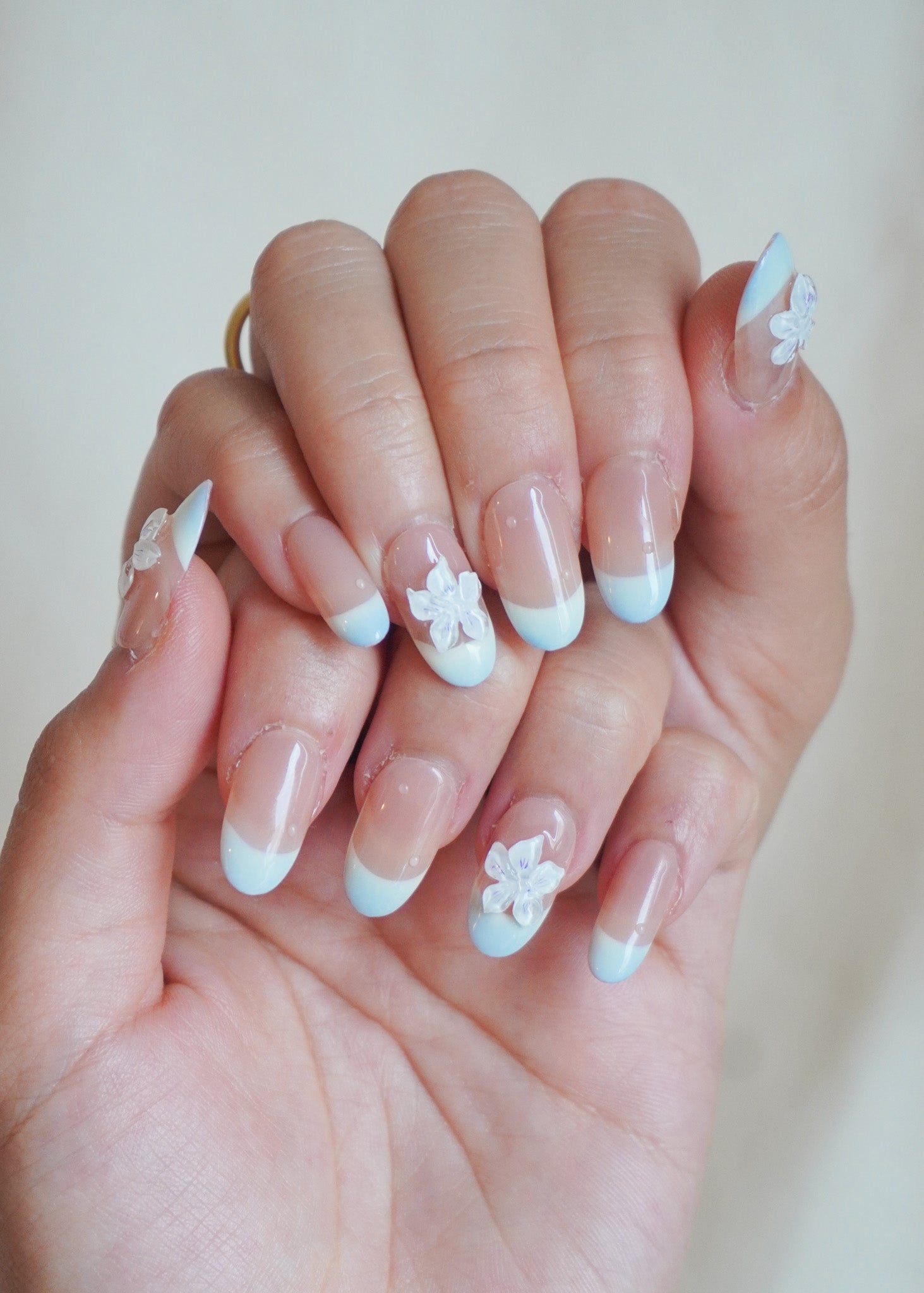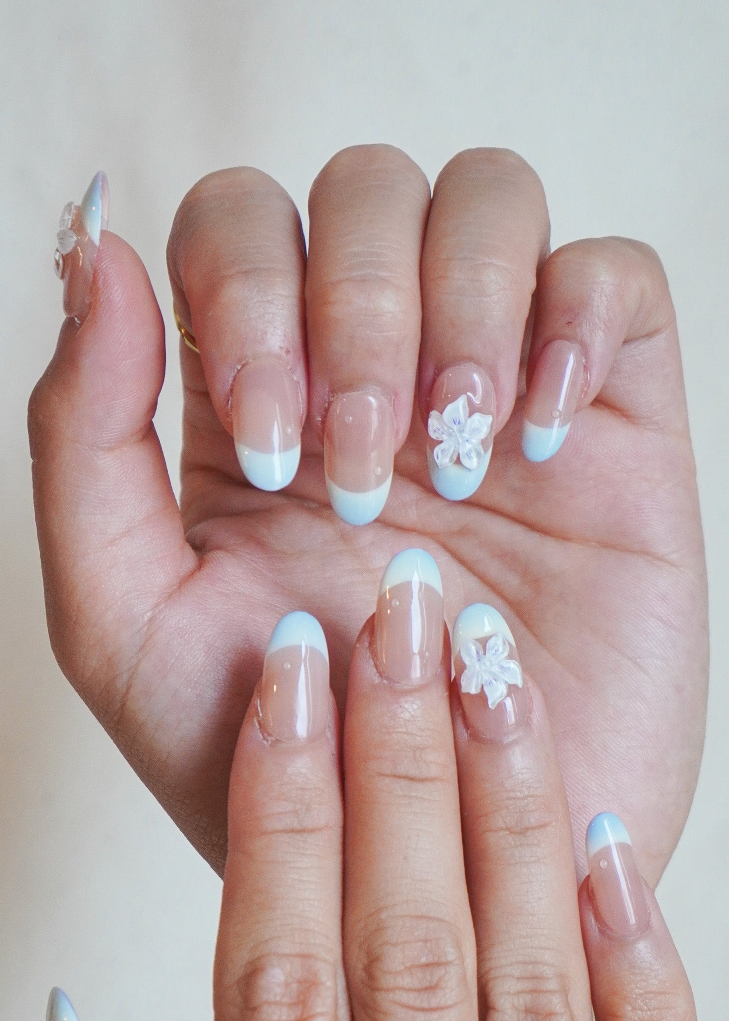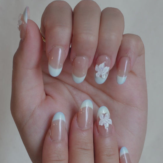 Skyline Petals Press On Nail Set brings together crisp baby blue French tips with translucent 3D flower accents for a look that’s light, fresh, and totally vacation-ready.