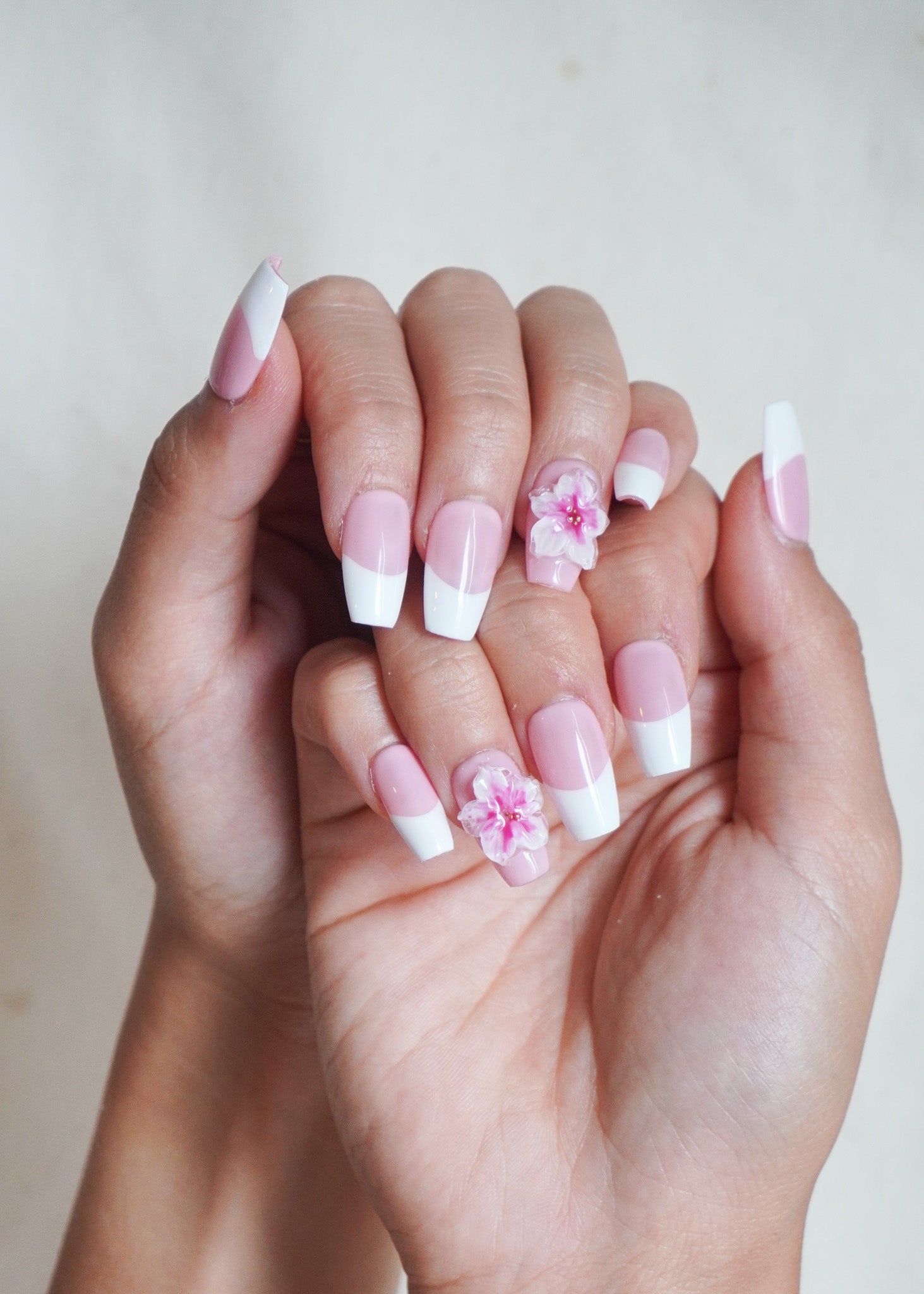 Spring Blush Press On Nail Set is a romantic take on the classic French tip—featuring a sheer pink base paired with clean white curves, finished with delicate 3D cherry blossom accents.