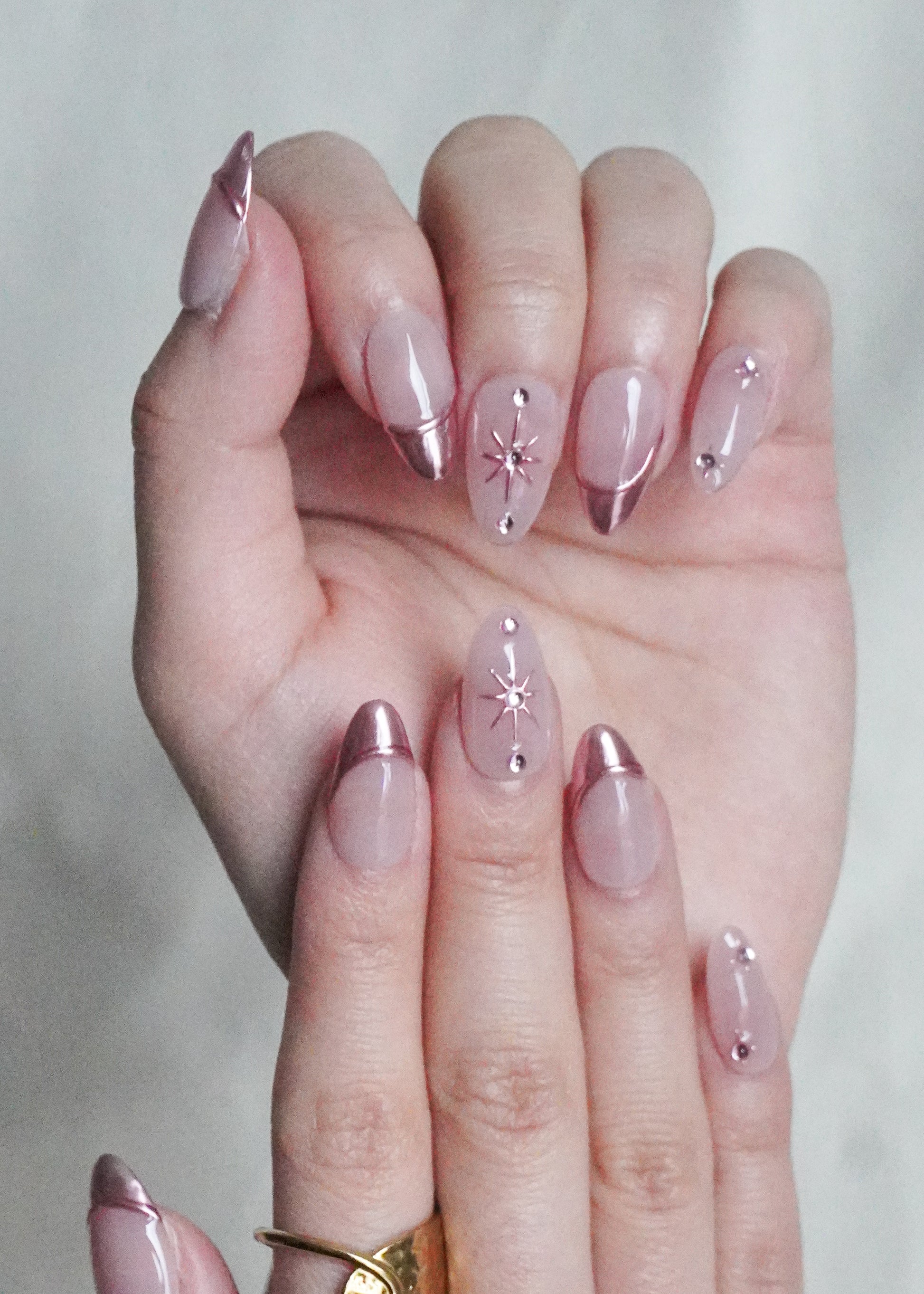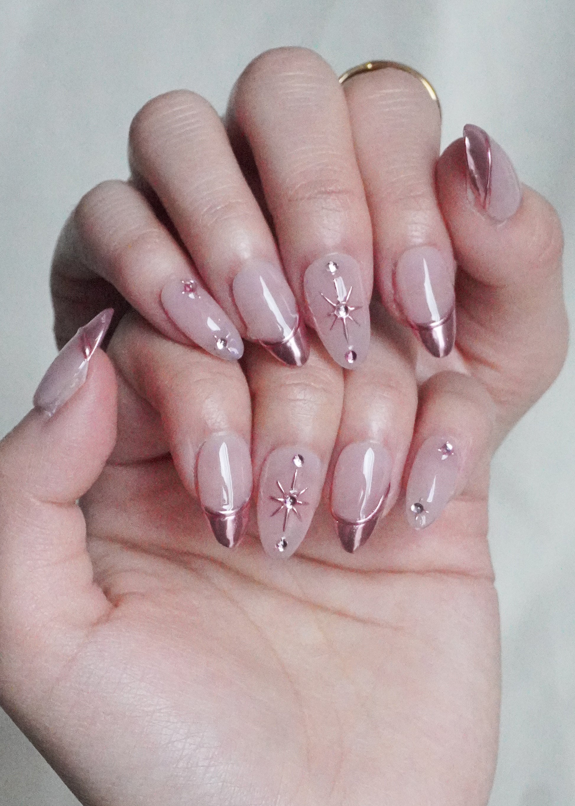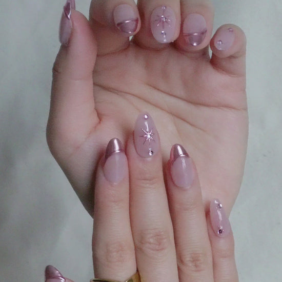 Starlight Blush Press On Nail Set features a soft pink, semi-sheer base with rose-gold French tips and delicate star accents. Subtle crystal details add a gentle sparkle while keeping the overall look clean and balanced.