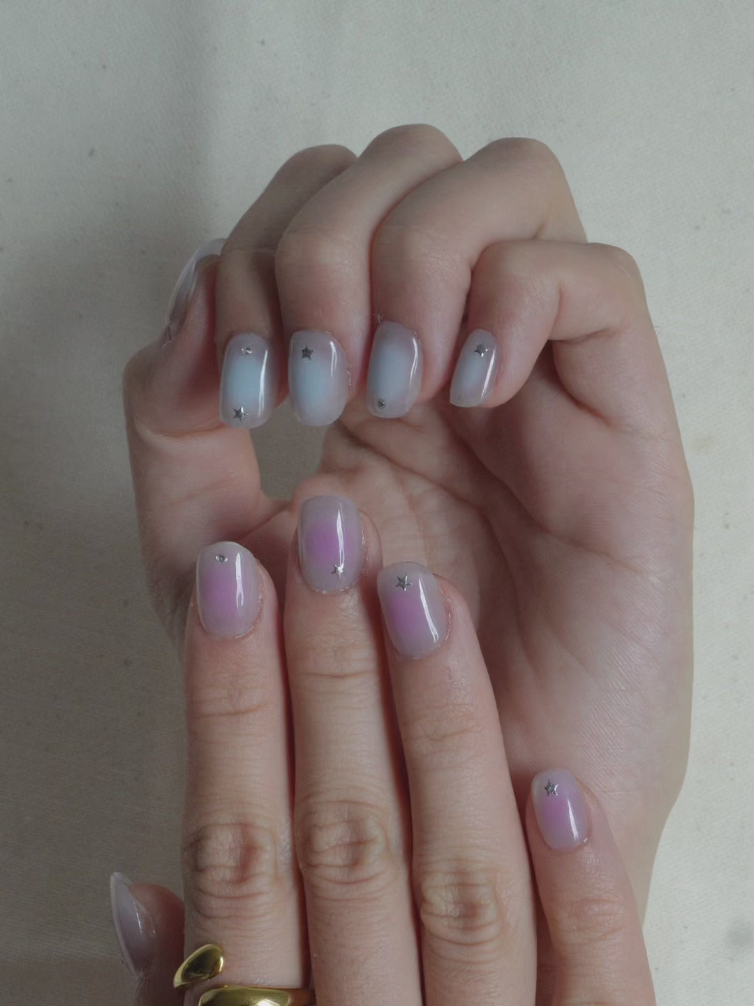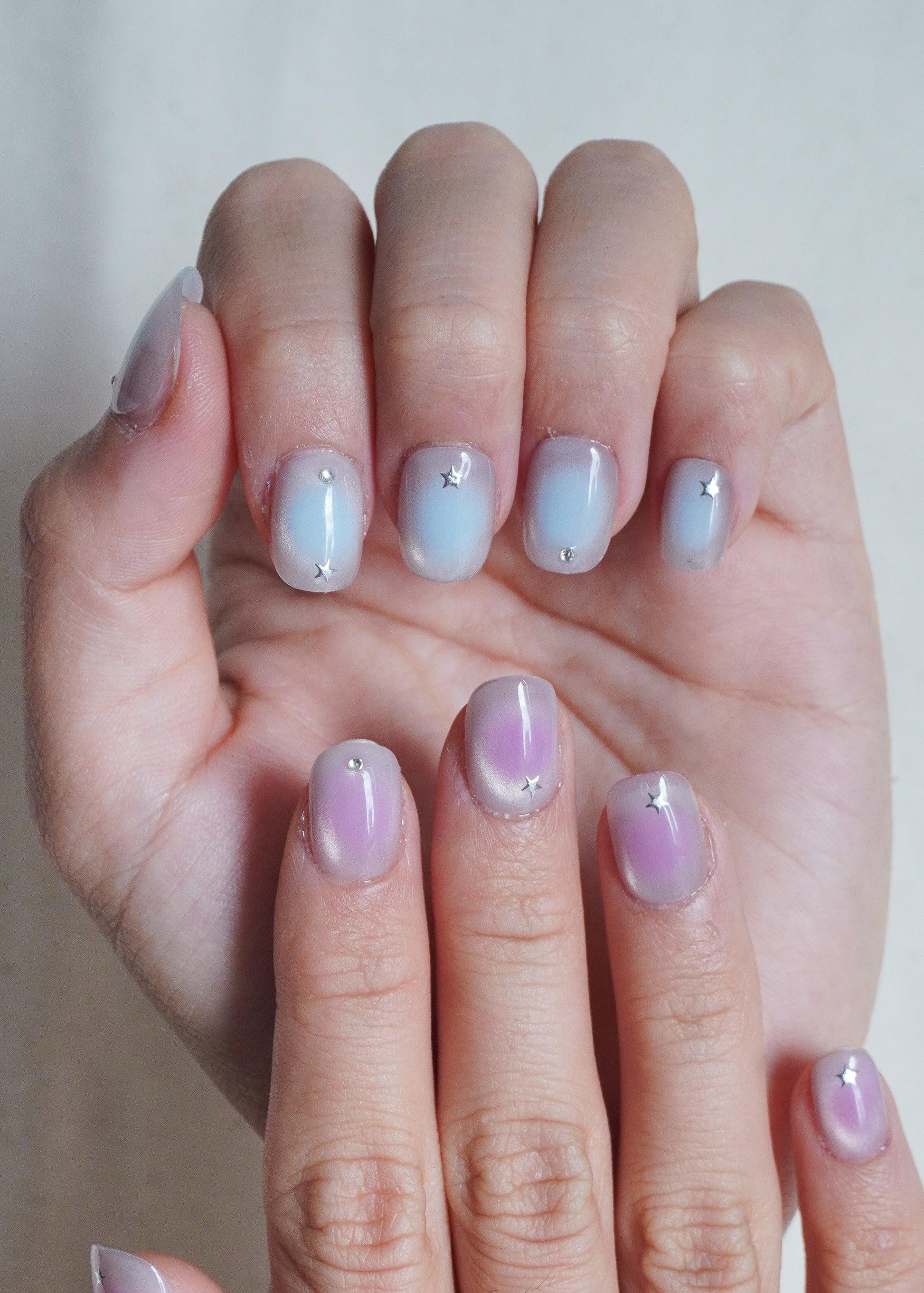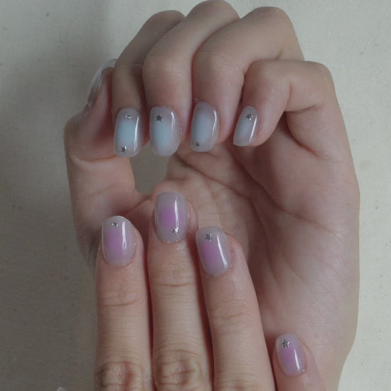 Starlight Glow Press On Nail Set is inspired by twilight skies and dreamy nights. Featuring a soft gradient blend of pastel blue and lilac, accented with delicate silver stars and crystals, this set feels both magical and modern.