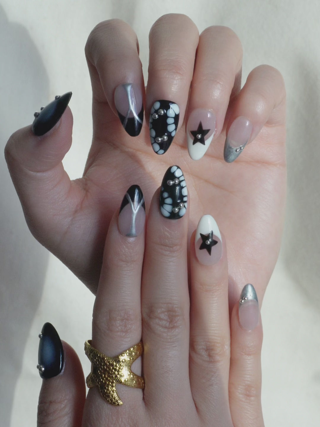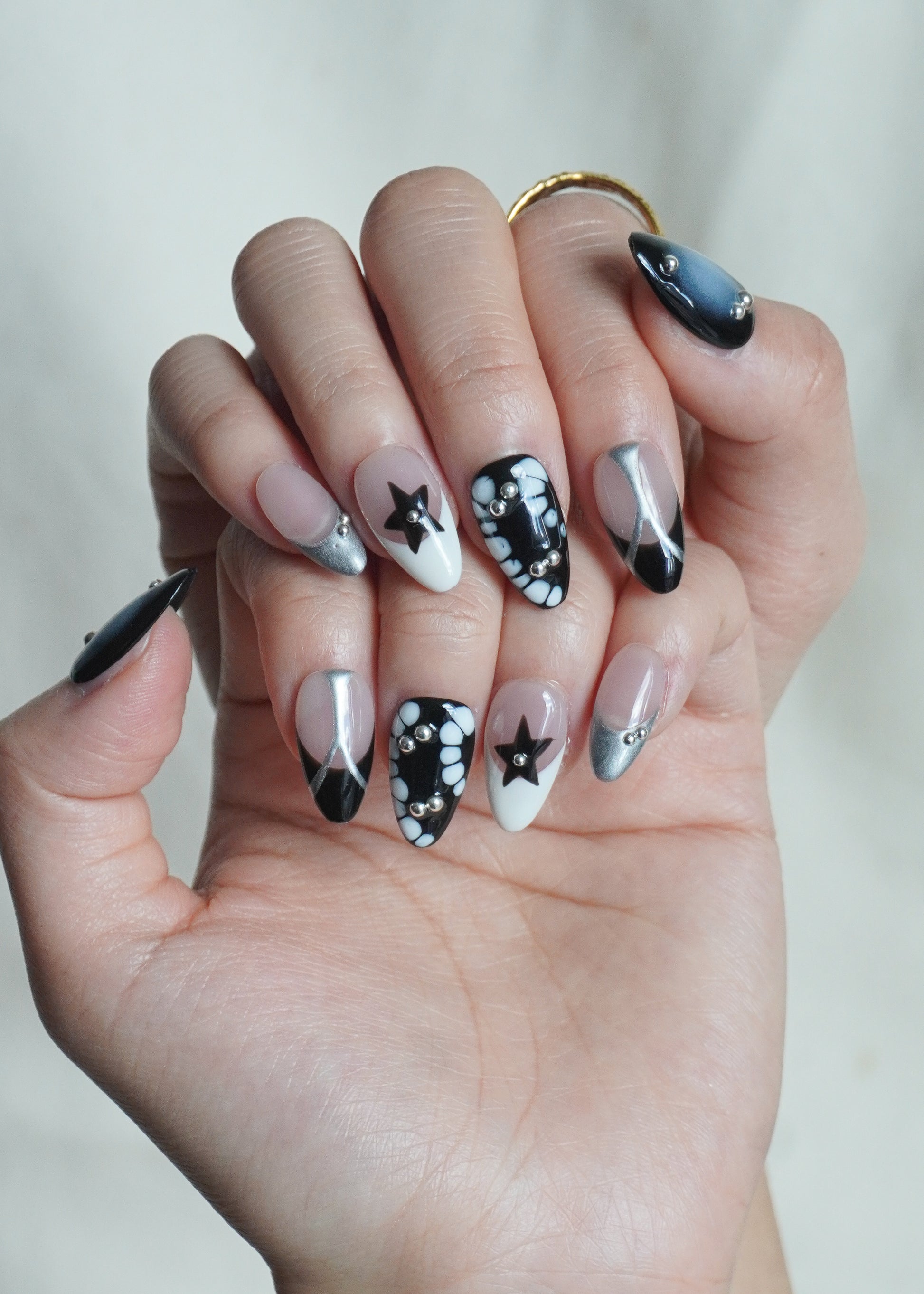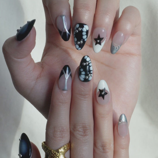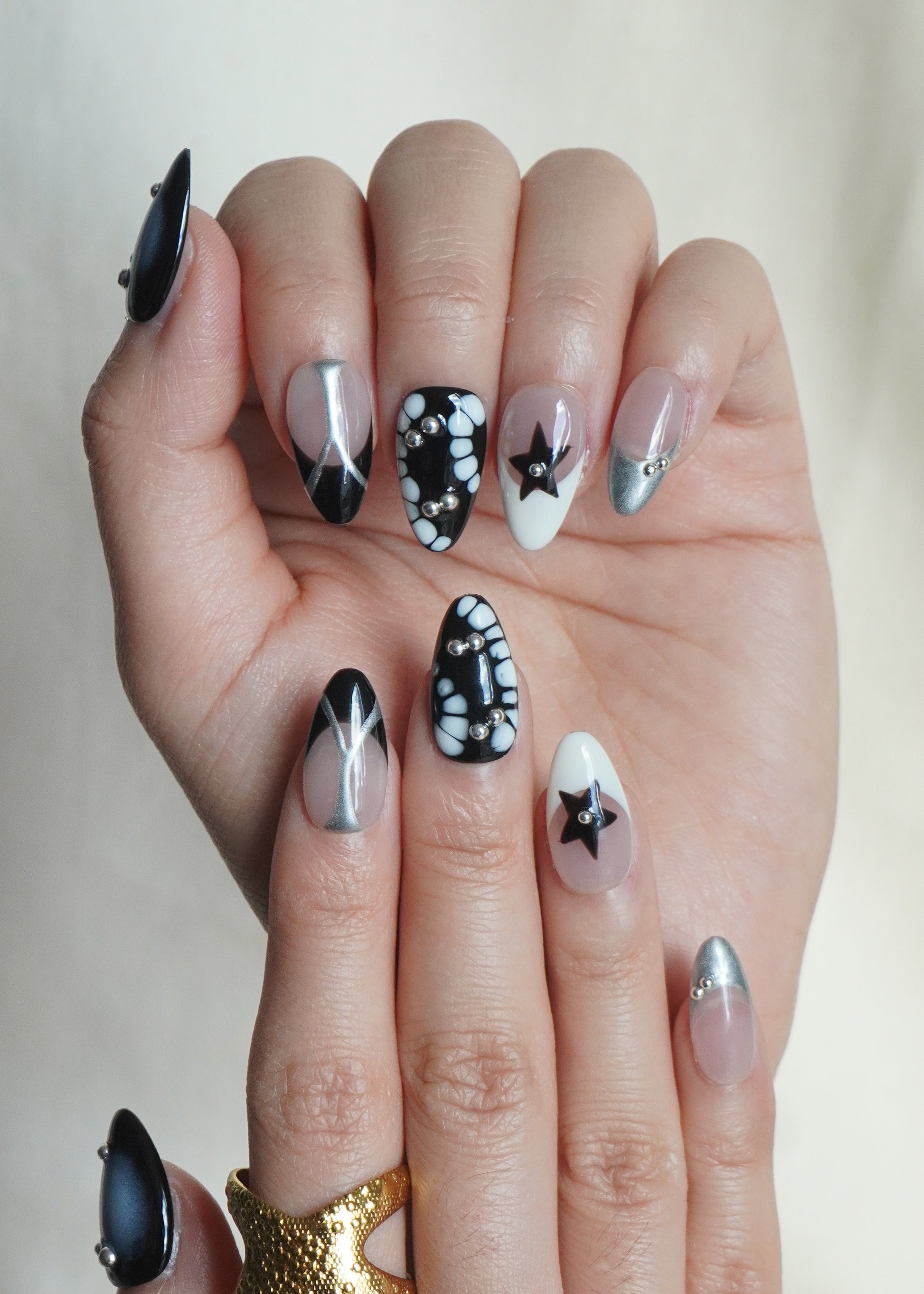 Each nail brings its own twist metallic lines, glossy noir panels, and hand-painted star details, remixed into one cohesive, eye-catching design.