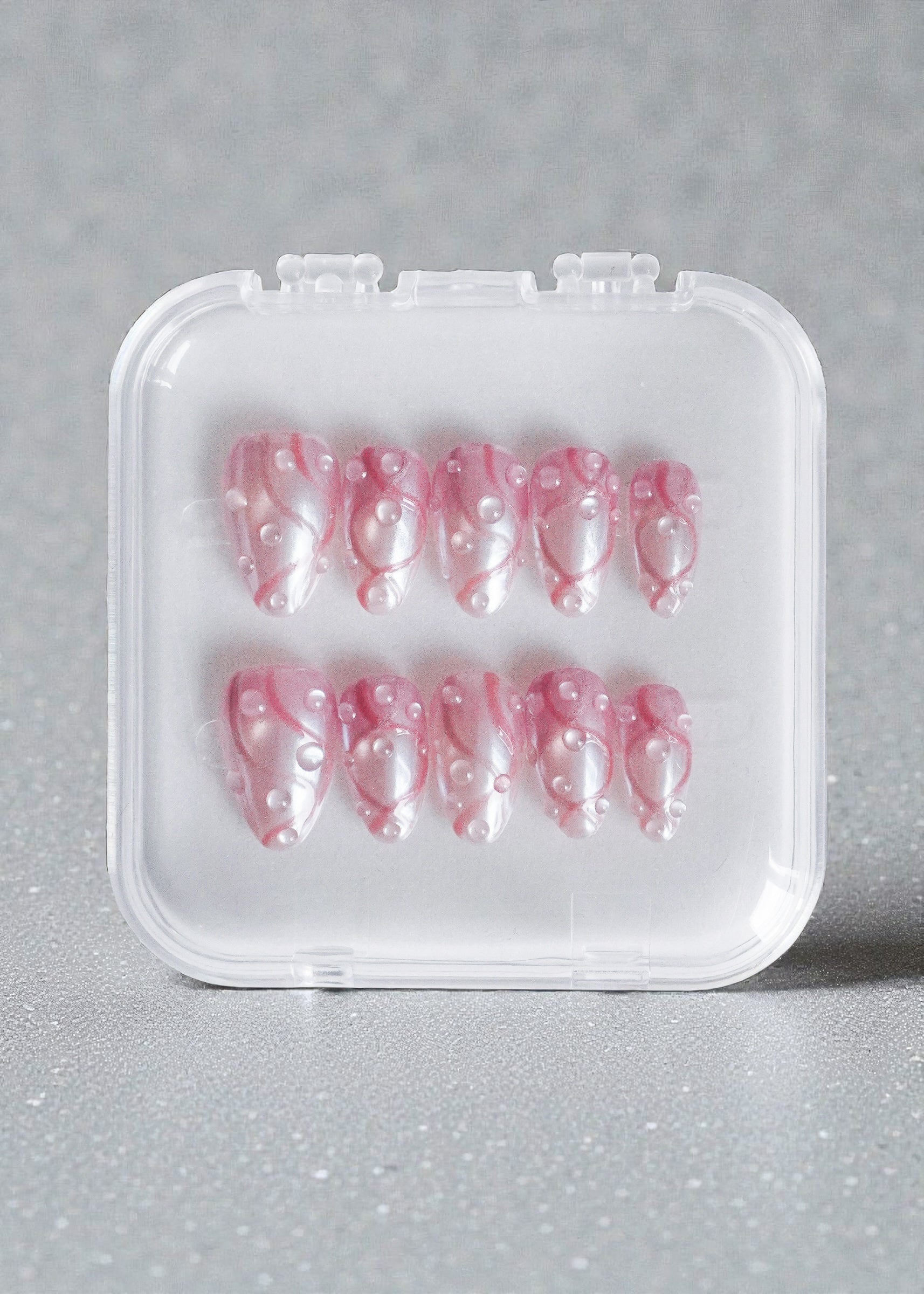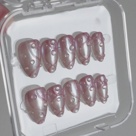 Sugar Crush Press On Nails Set features a sheer milky base with soft pink swirls and delicate pearl accents. Inspired by blushing cheeks and first-date butterflies, this set feels light, romantic, and effortlessly polished, sweet without being over the top.