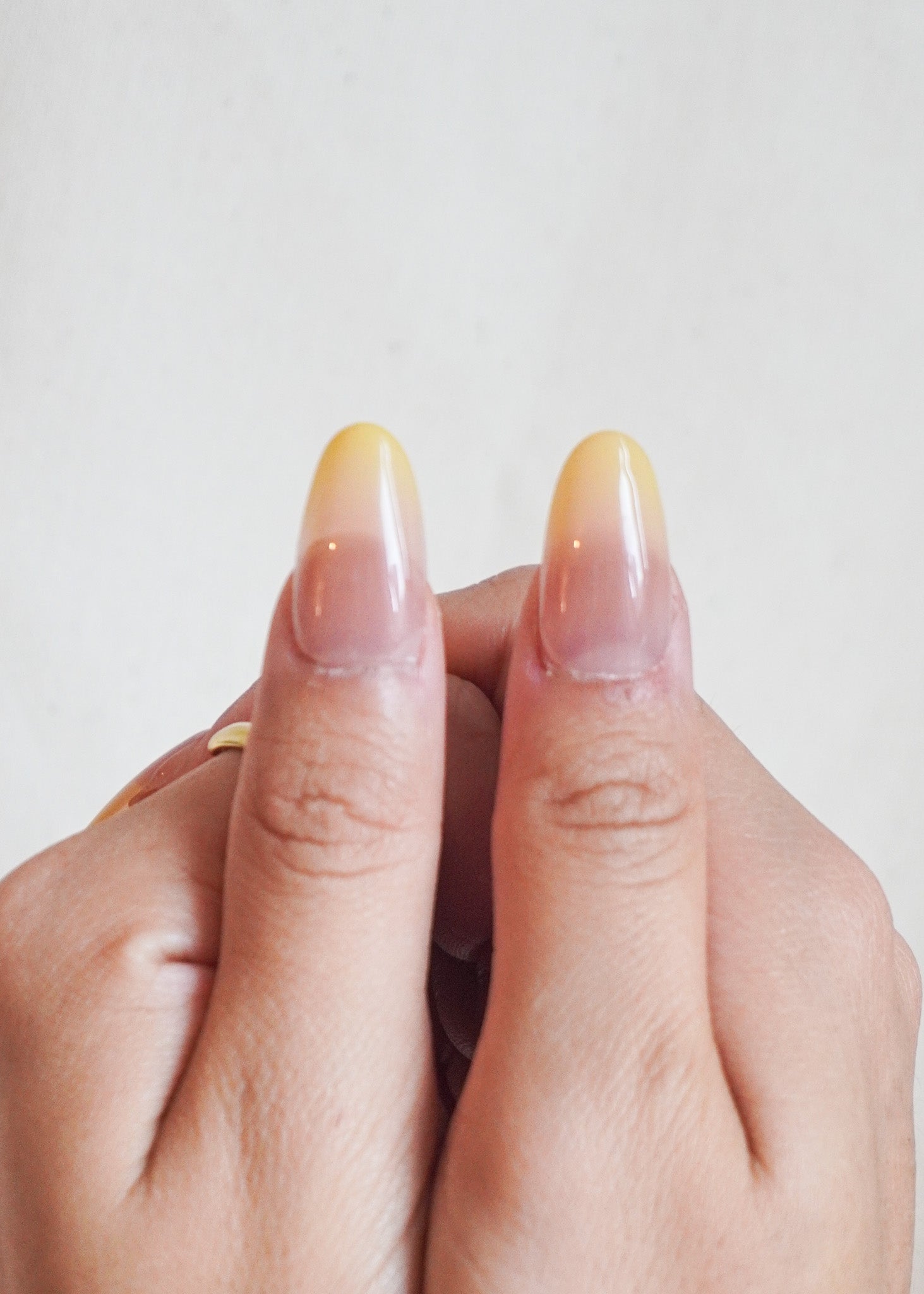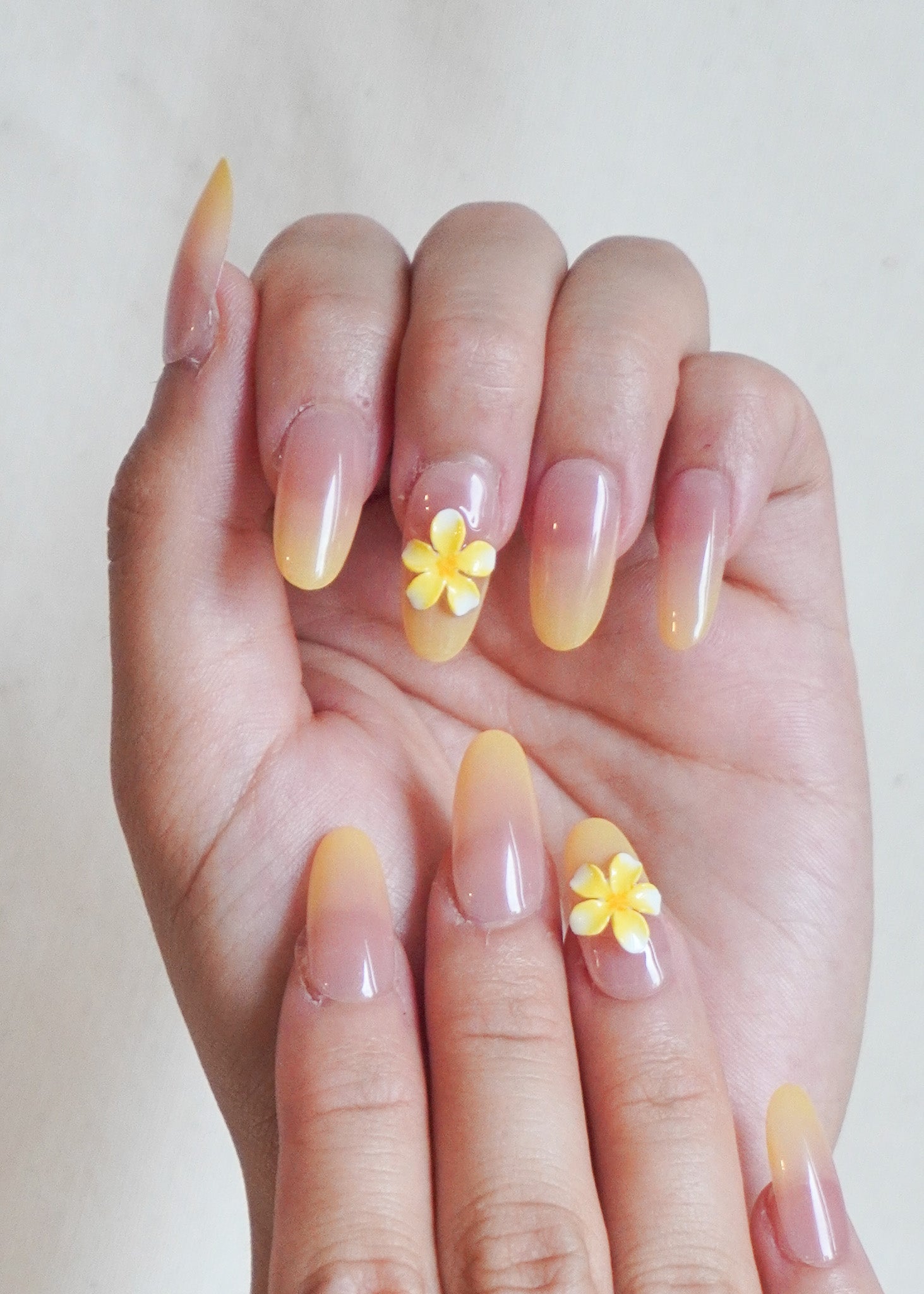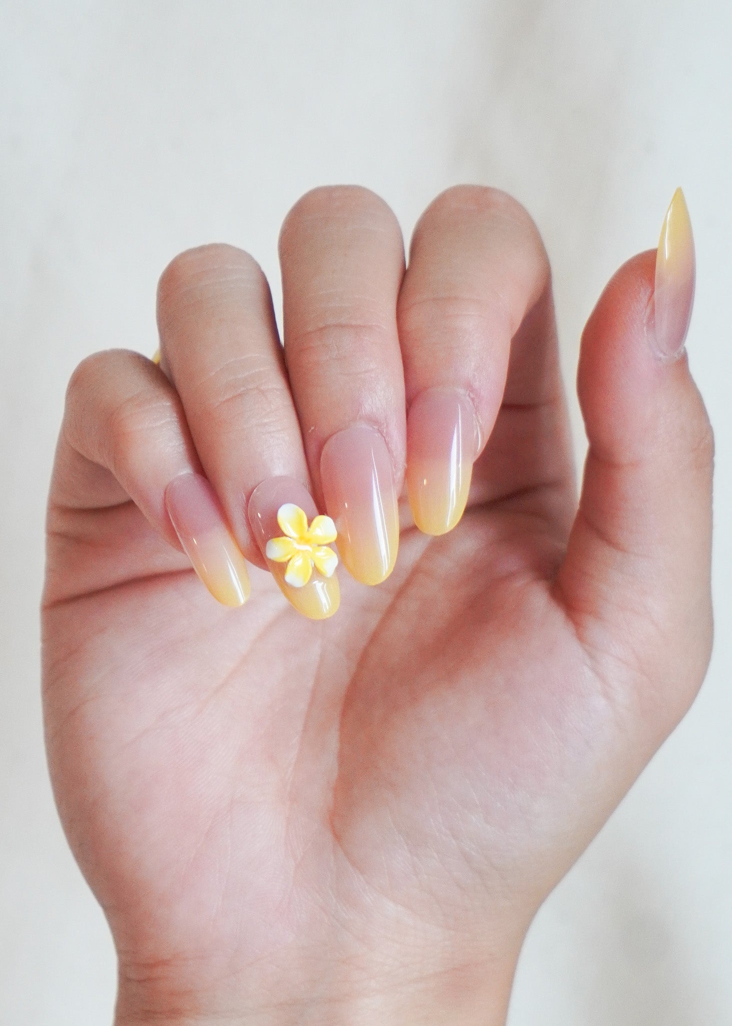 Sunset Bloom Press On Nail Set brings just the right touch of warmth and charm, blending a clear natural base into a golden glow.