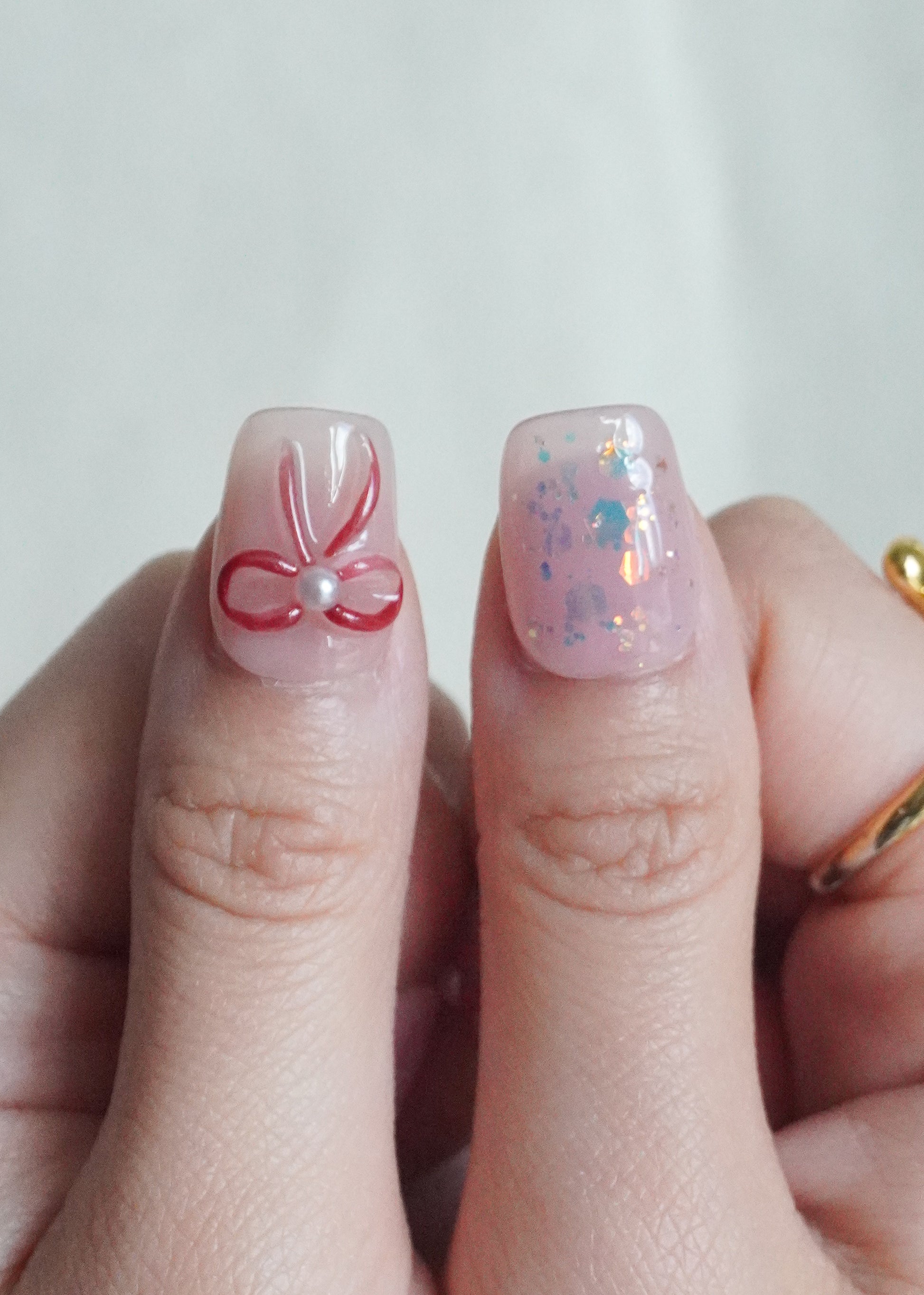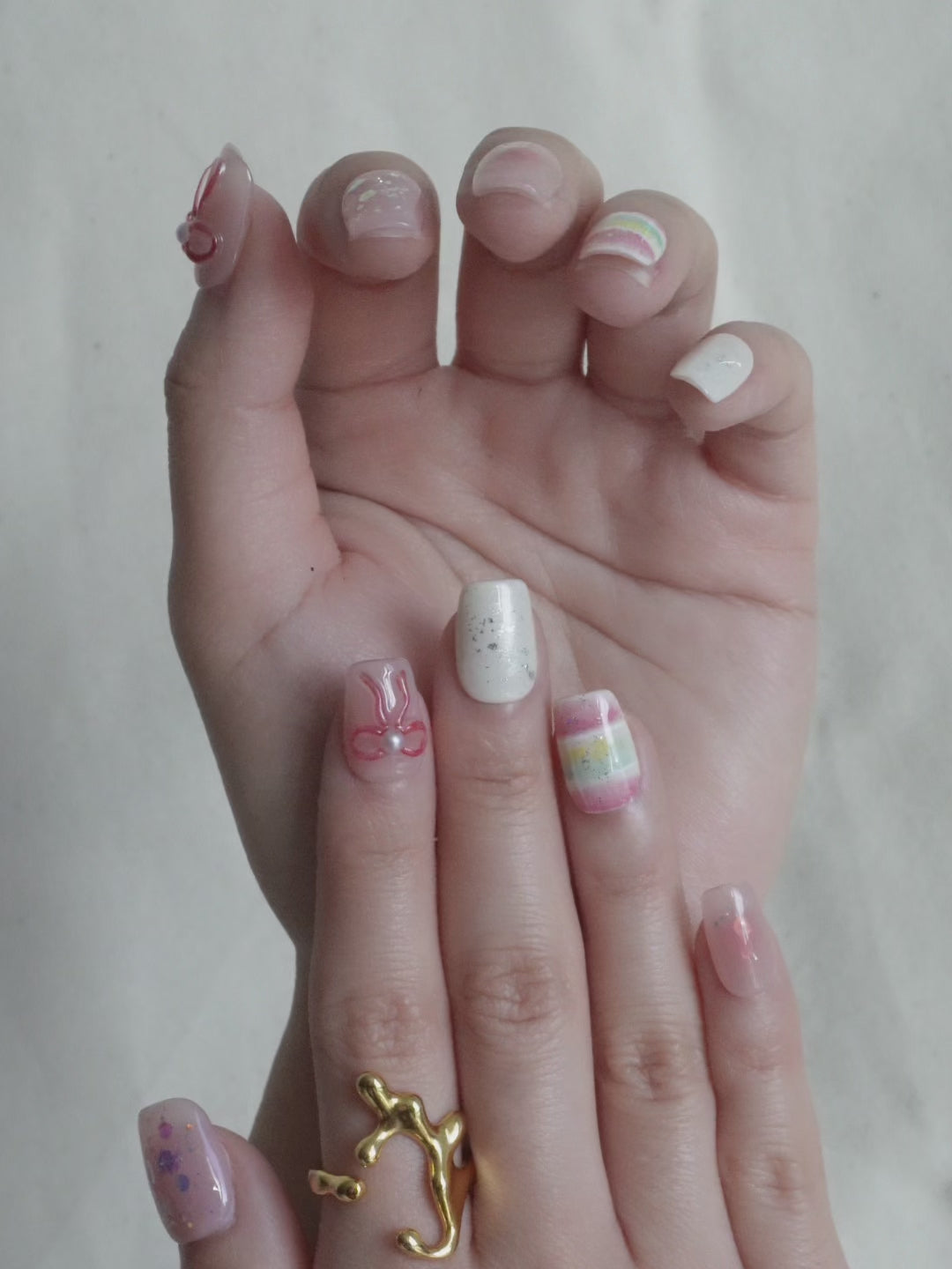 Sweet Treat Press On Nail Set blend blush pink tones with pastel rainbow details and glossy finishes. Finished with delicate bows and subtle sparkle, this set captures the joy of Valentine’s sweets, sweet, fun, and easy to wear.