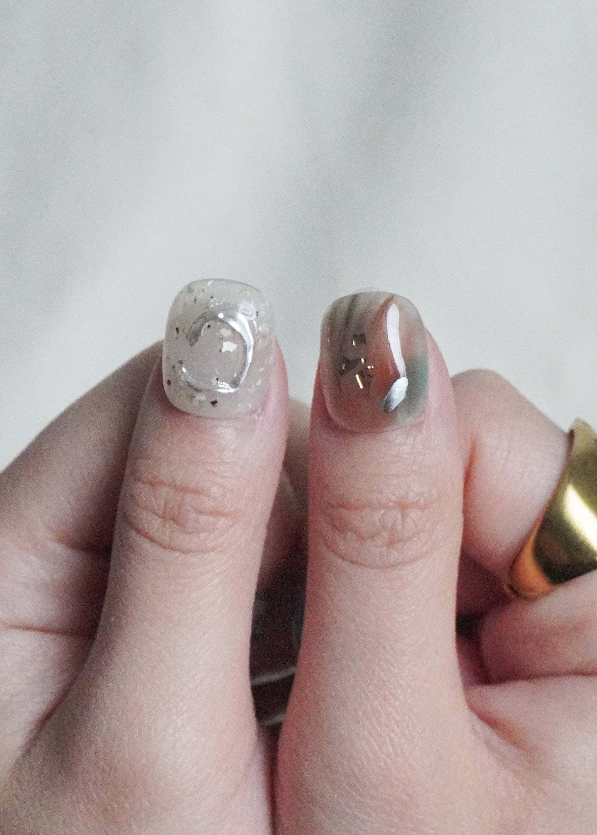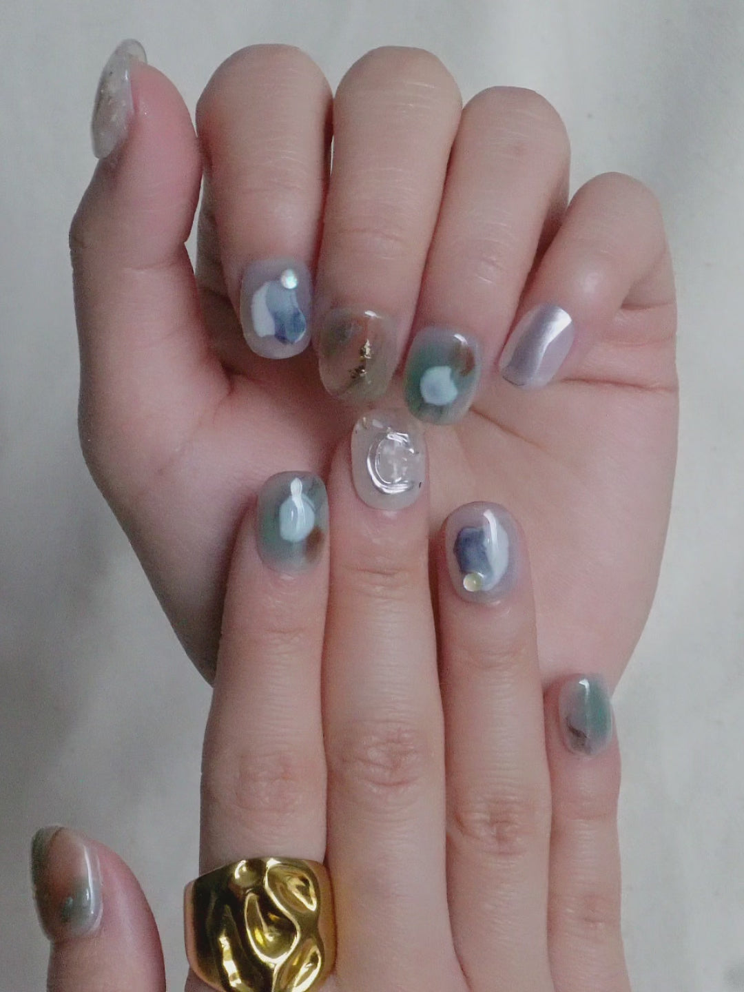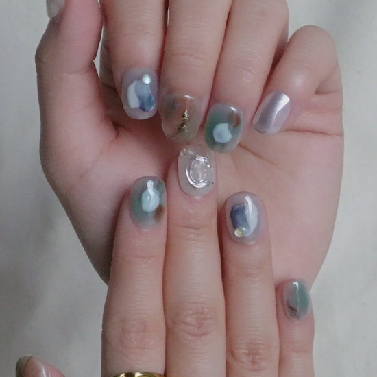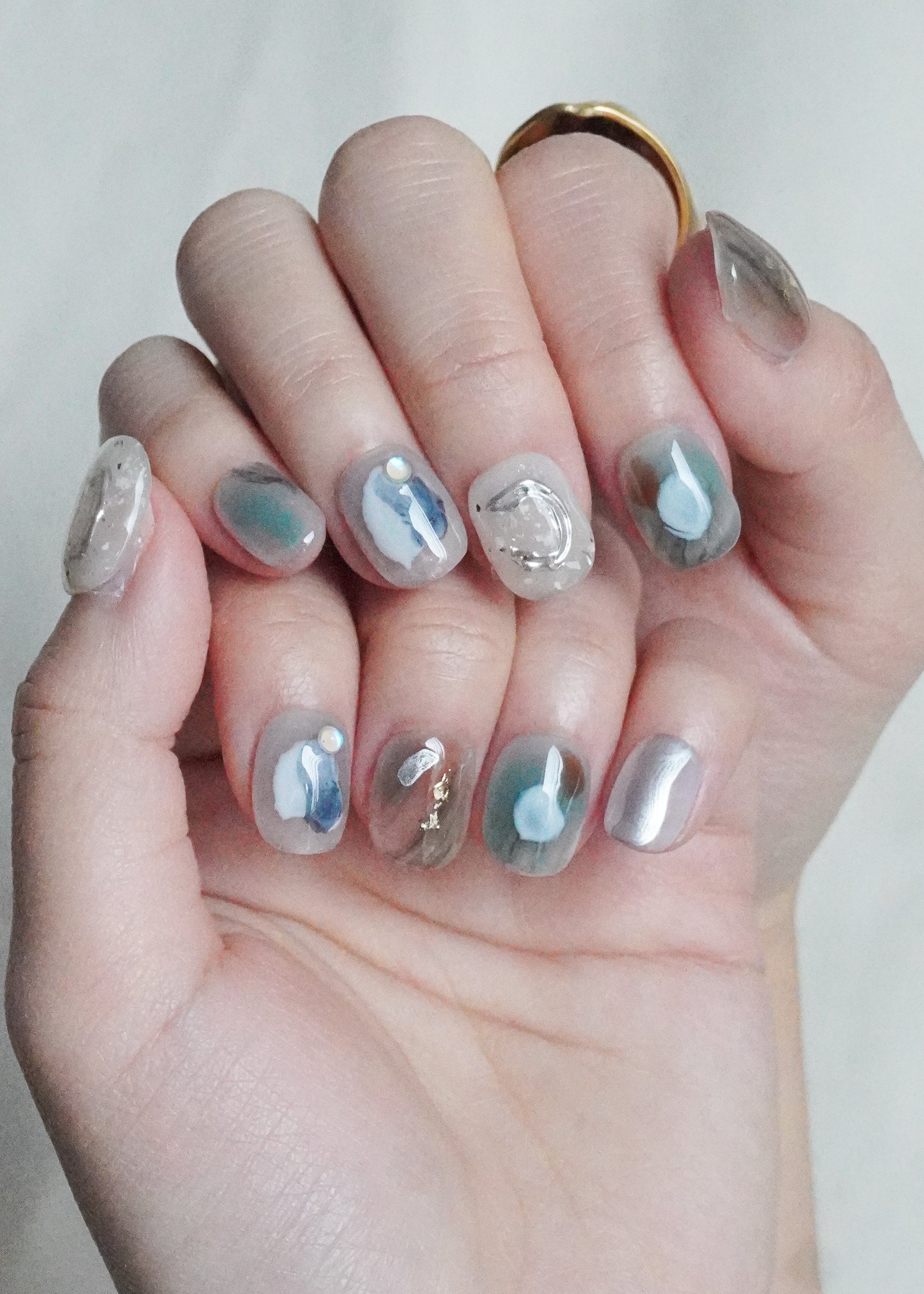 Tide Mist Press On Nail Set blends soft blue-grey tones with translucent layers and fluid, abstract detailing. Subtle metallic accents and glossy finishes add depth while keeping the overall look light and relaxed.