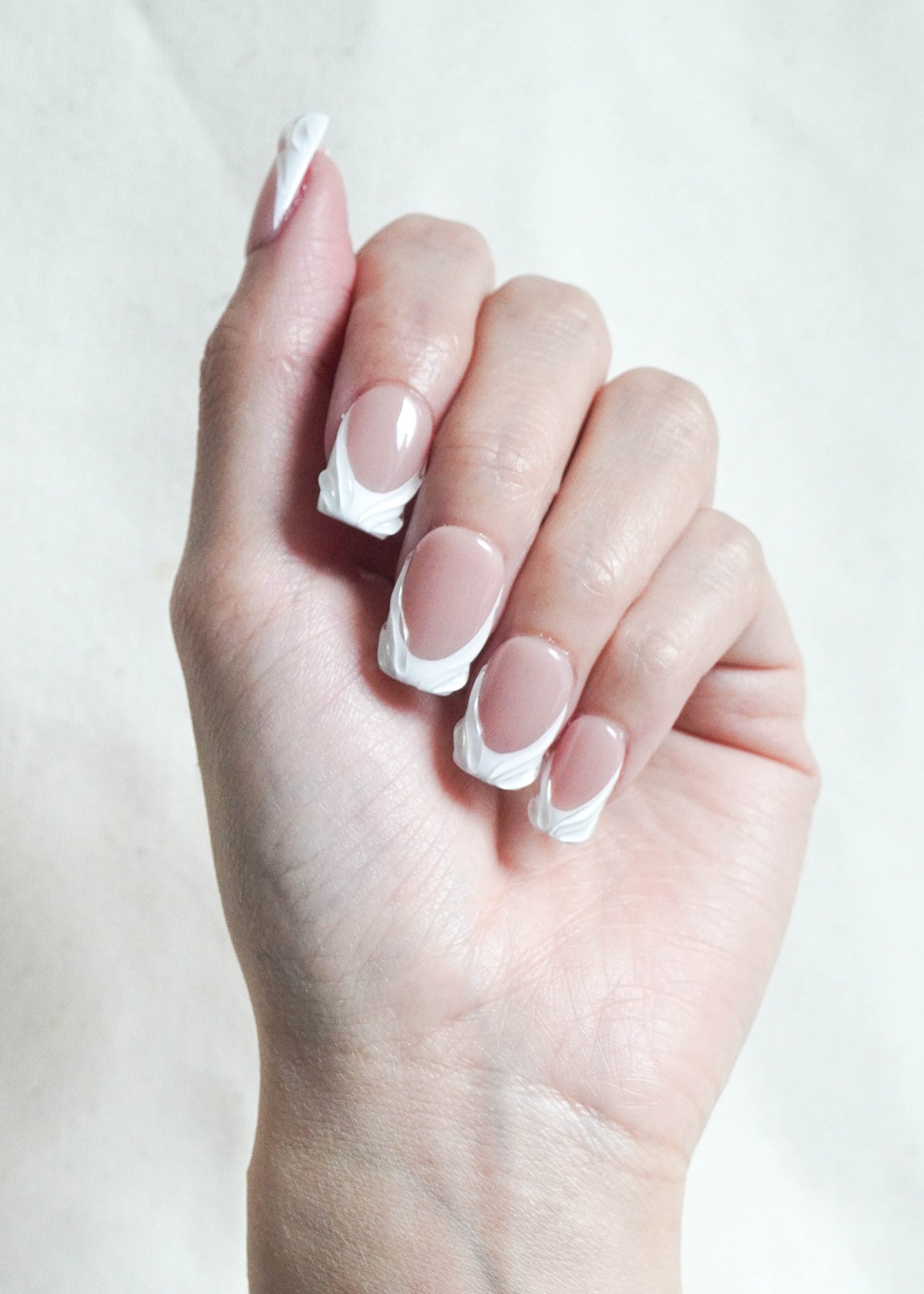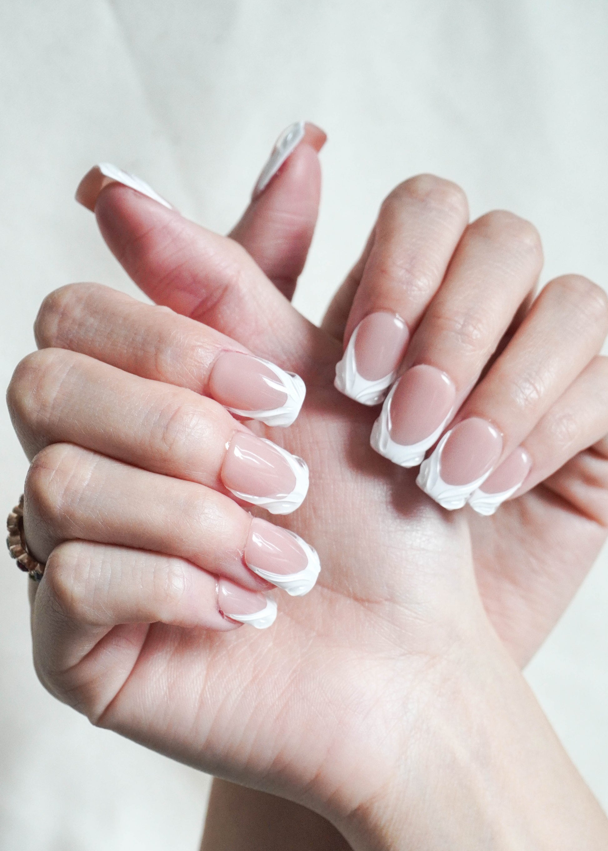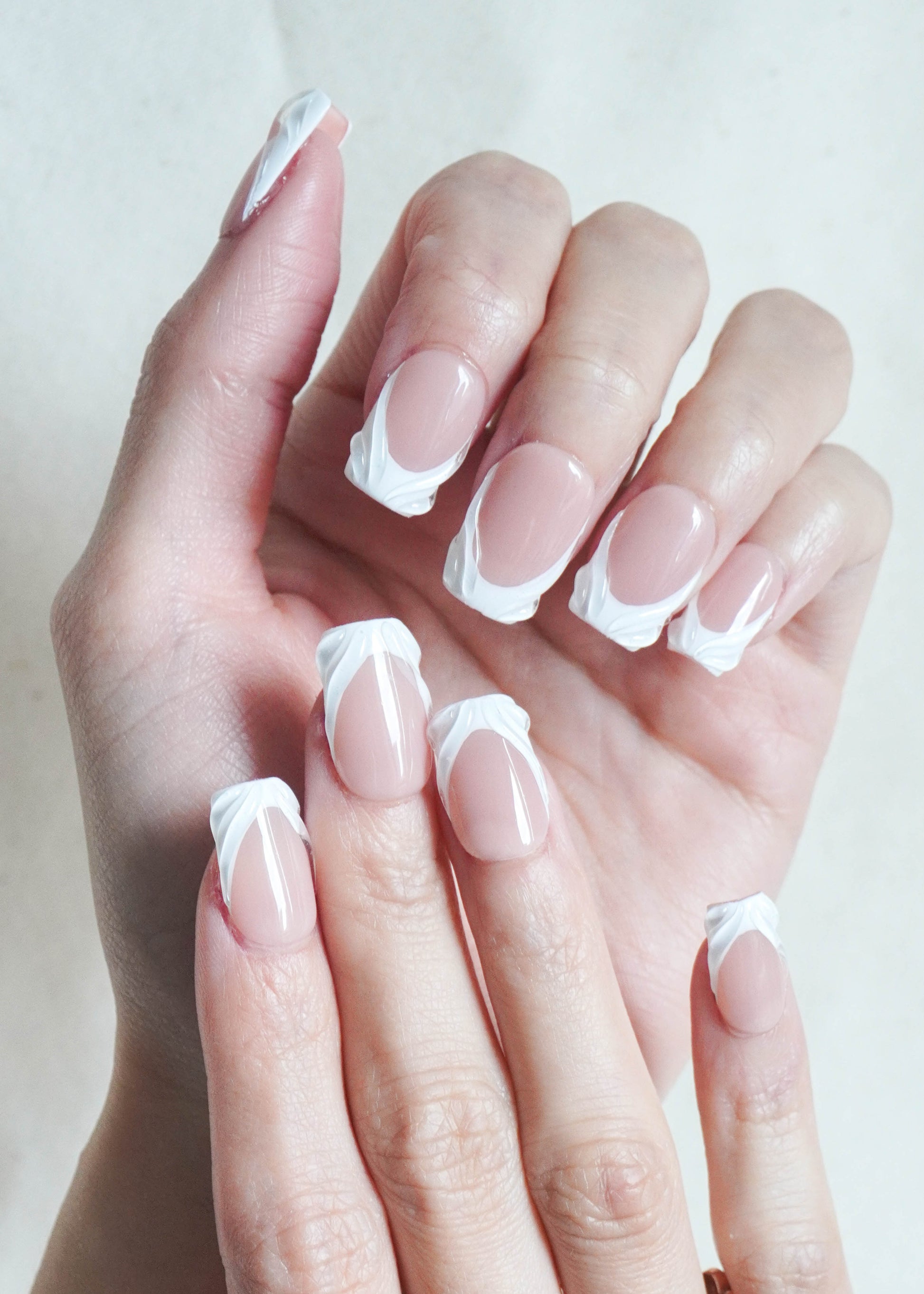 Timeless Twist French Tip press on nails set feature the universally loved French tip, set against a glossy nude base, the raised 3D design adds a touch of texture and movement, making this set perfect for both everyday sophistication and special occasions.