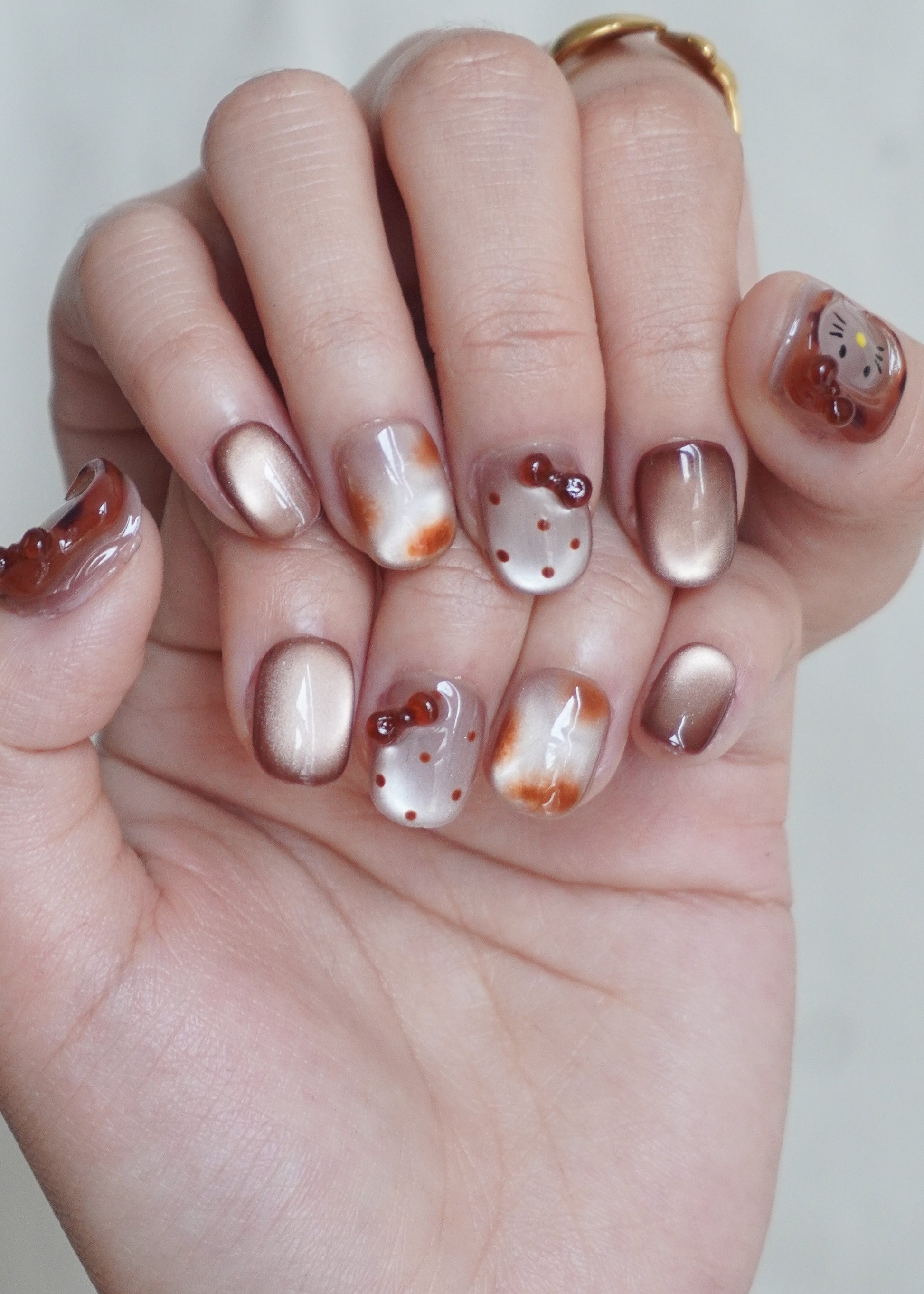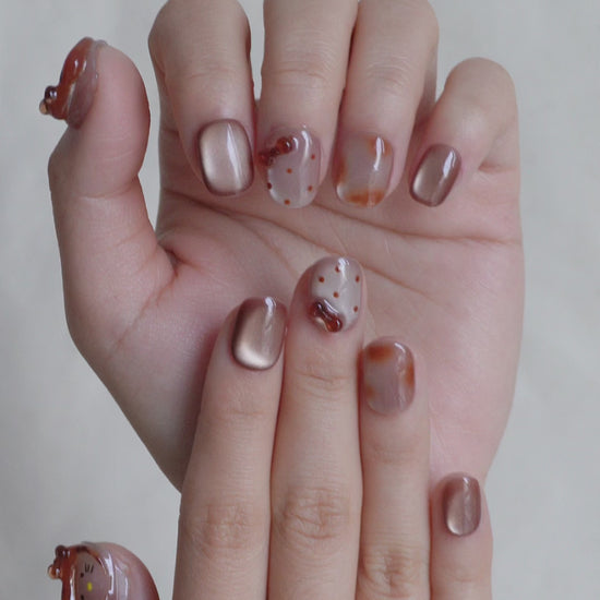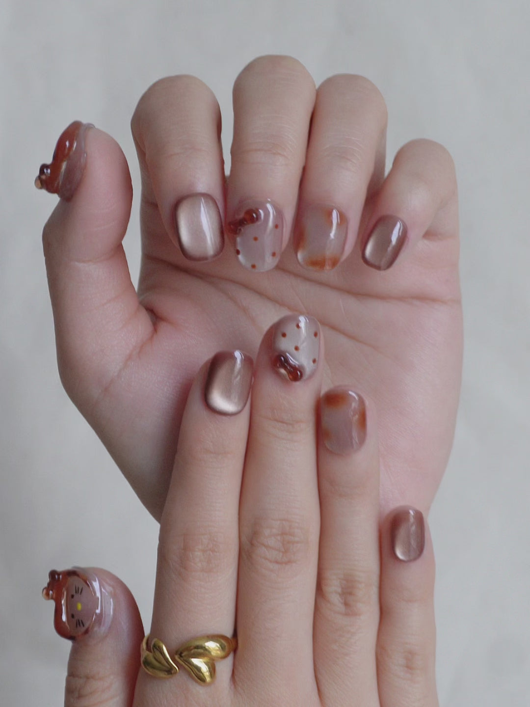 Toffee Kitty Press On Nail Set brings together warm caramel tones, glossy jelly bows, and dotted details that look good enough to eat. Sweet, cozy, and a little extra.
