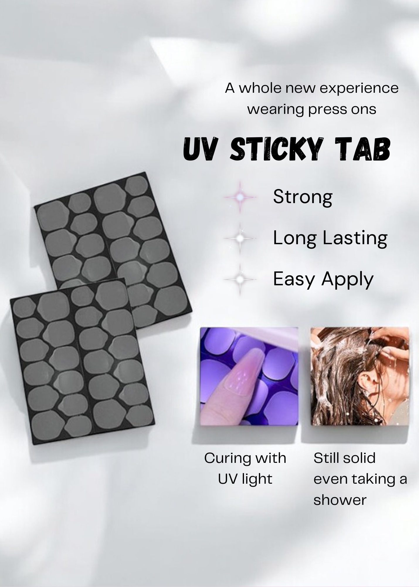 The UV cured sticky tabs and nail lamp are a game changer. ENES nails are so pretty and this helps keep them pretty nails maintained and on more securely, it feels more sturdy when I used it and able to wash my hands and do chores without worrying it’ll pop off. I definitely recommend for those that love to wear it longer period of time! The packet also guides how to apply on properly, very helpful.
